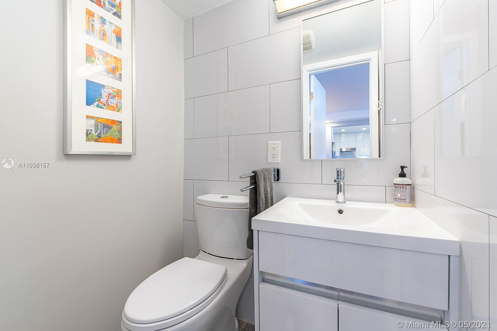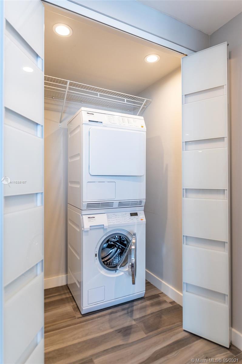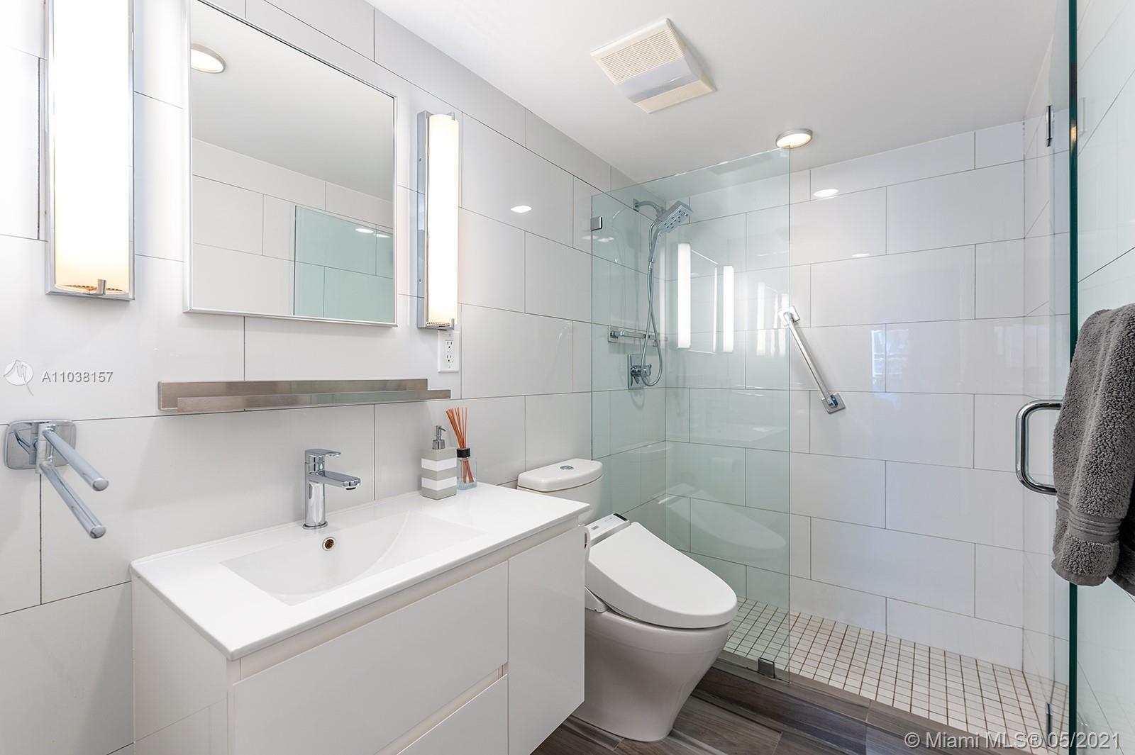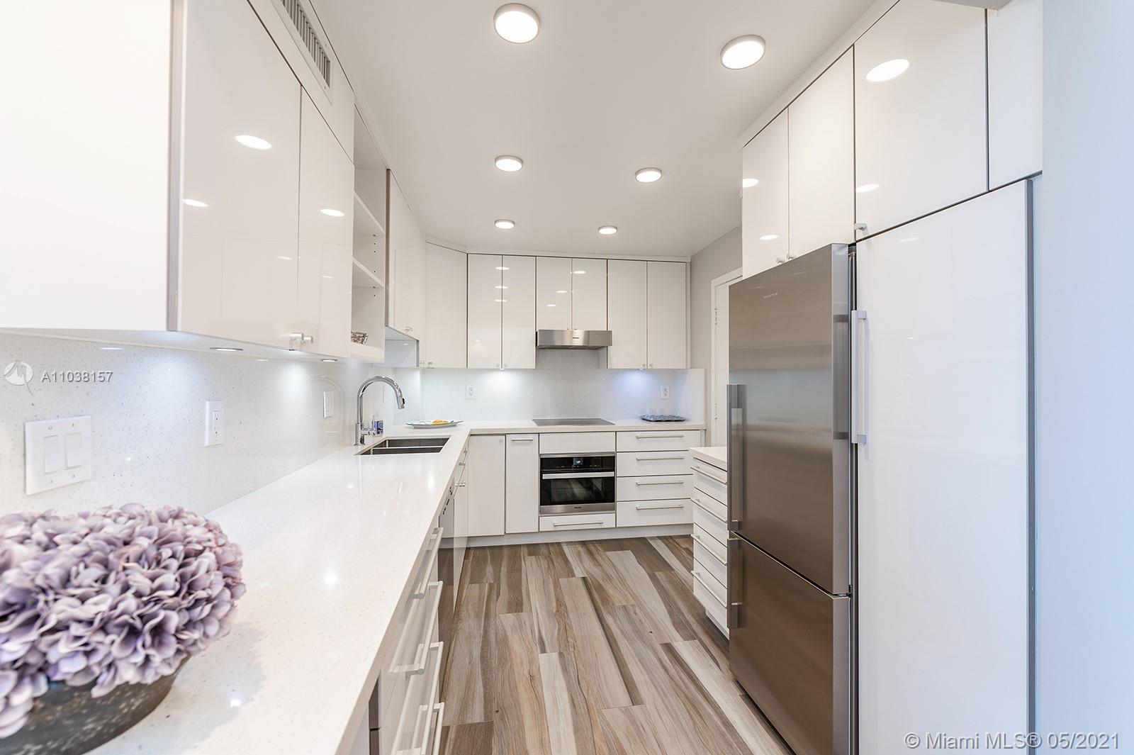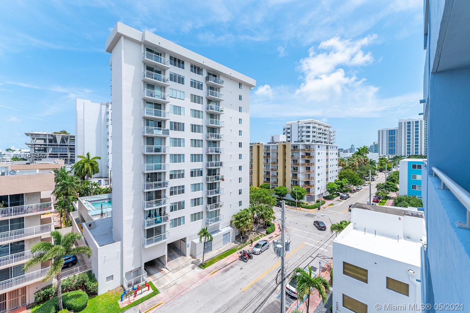 Everything you've been looking for: Space, light, completely renovated, steps to Lincoln Road! Oversized 868 sq ft 1BR/1.5BA residence has been carefully and completely renovated: Porcelain floors, modern open kitchen with custom cabinetry, quartz counters, top-of-line Miele and Fisher & Paykel appliances. Spacious walk-in shower in master bath, plus extra half-bath. Huge rooms, massive walk-in closet, built-in storage cabinets includes ultra-modern wall bed for overnight guests, custom finishes, washer/dryer in unit, new energy efficient A/C, tankless water heater, complete impact windows and doors, custom blinds. Oversized balcony with lovely views overlooking Lincoln Road West neighborhood. Pool, covered parking, low maintenance includes reserves, quiet street off Lincoln Road.