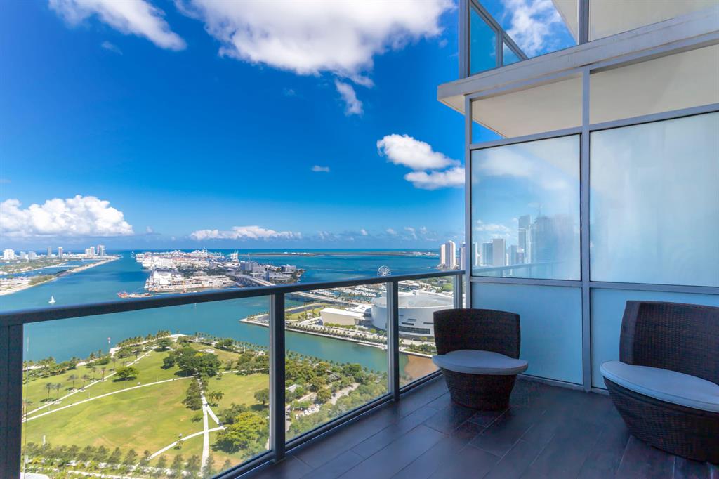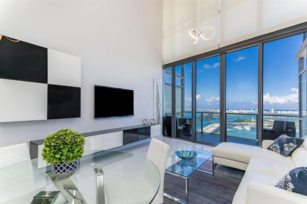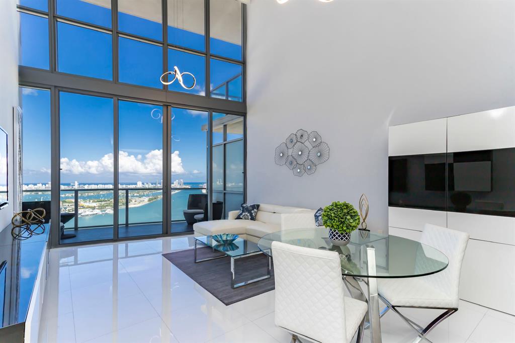 Spectacular Unit on the 37th Floor with unobstructed view of Biscayne Bay, the city and the ocean. This is a 2 story, 22' ceilings Unit set up as a One-Bedroom and 1 enclosed glass doors Den with porcelain tile floors, Venetian finished walls, Designer lighting, Viking appliances and modern and elegant furniture. Master Bedroom has a frameless glass enclosed shower, dual vanity and built in walk-in closet and Wall to Wall framed glass overlooking downstairs. Upper and lower automatic window shades. Washer & Dryer included. The building provides excellent amenities including concierge, 24/7 security, valet, swimming and lap pool, SPA, fitness center, basketball court, billiard table, ATM, yoga and more. Walking Distance to FTX Arena, Adrienne Arsht Center, Frost Museum, Bayside and more.