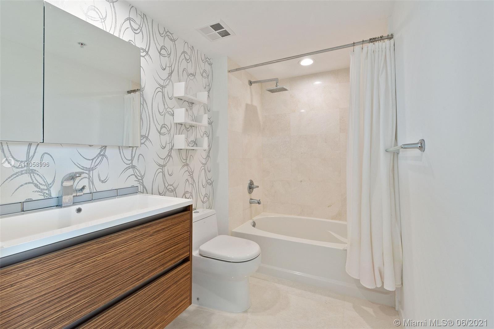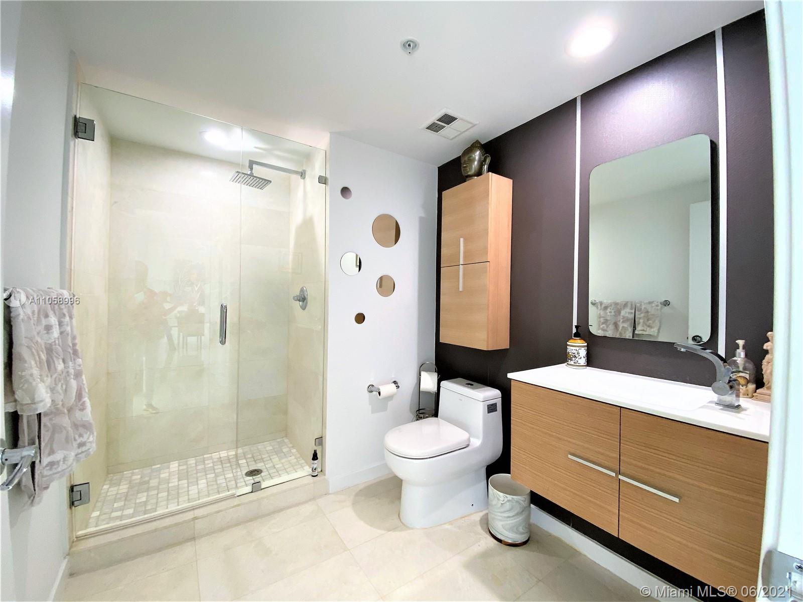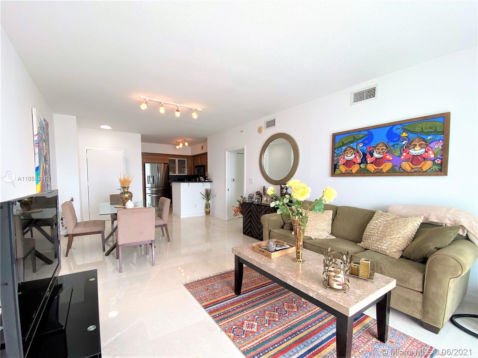 BEAUTIFUL recently updated corner unit on desirable One Miami East Tower Condo. Unit offer amazing Bay view, 24 X 24 French Vanilla marble floors all throughout including balcony. Marble bathrooms W/ new cabinets. Bosch A/C Unit. Italian kitchen cabinets, back splash & granite counter-tops, new refrigerator, dishwasher, washer & Dryer. White curtain in living, black outs in bedrooms. 2 swimming pools, Jacuzzi, 2 Party Rooms, 2 Gyms, Convenience Store and 24 hrs security, valet, and concierge. Centrally located within minutes to Design District, SoBe, Grove, Gables, and Airport. Walking distance to Whole Foods, movies, restaurants, Brickell City Center, Art and Entert District, Perez Museum and Miami's famous Metro Mover (free transit system). This unit is the place you want to call home!