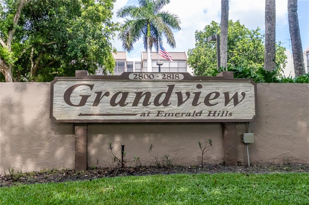 Fantastic opportunity to own a 2 bedroom, 2.5 bath spacious condo in Grandview at Emerald Hill. Grandview is a quiet, gated community with 24 hour security, gym, club room, heated pool, BBQ area and more. Lots of potential to make this unit your own! Features include an eat in kitchen, 2 large bedrooms, huge screened overlooking the beautiful gardens and pool, tiled balcony, spacious bathrooms. Three huge master closets. Close to shopping, minutes to Hollywood Beach and only 15 minutes to the airport and I-95. 1 covered parking spot.