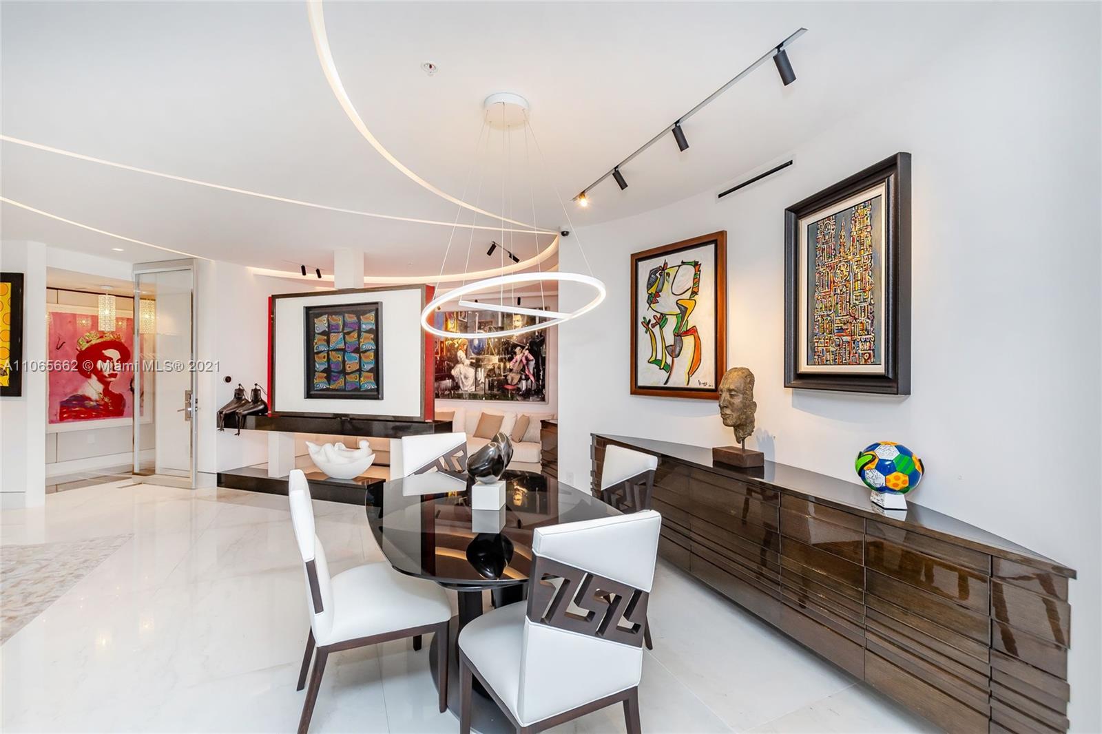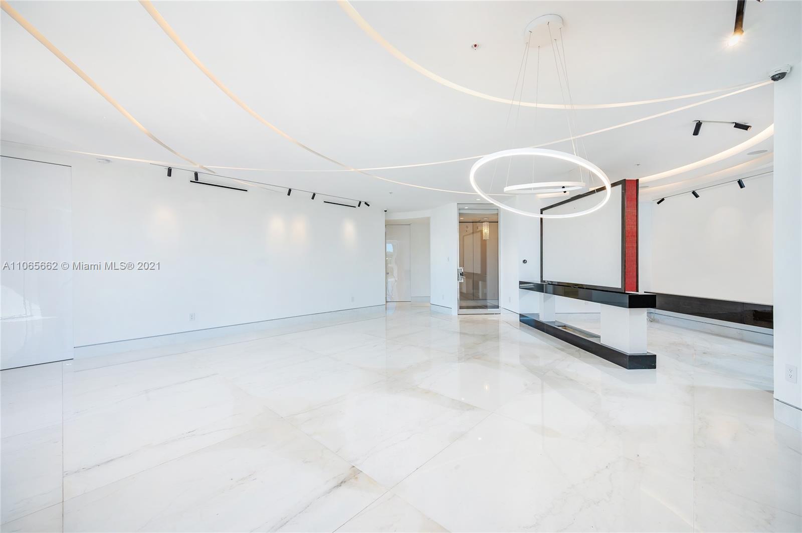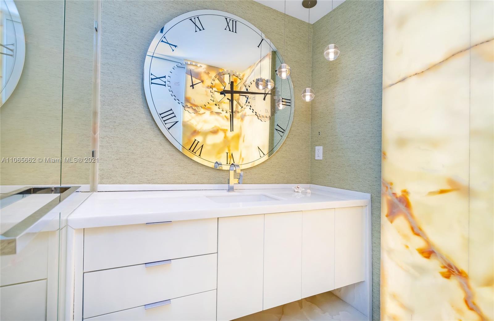 Masterpiece with pure luxury; caring all details in this stunning Versace-style property. All unique and sleek remodeled with high-end materials hand-chosen in Italy and Europe. Exquisite walls of onyx with stunning internal illumination, giving you unparalleled elegance and excellence in this impressive property. Gorgeous flooring, and wood details add distinctive touches at every turn. The kitchen features Miele appliances, custom cabinetry. A private elevator leads you into your exclusive foyer, leading to a modern open space with a breathtaking water view. Unique custom-built family/media area with a mobile TV, offering great entertaining and fantastic family time. A distinctive retractible Tv-System coming from the roof optimizes all space in the cozy master bedroom. You must see it.