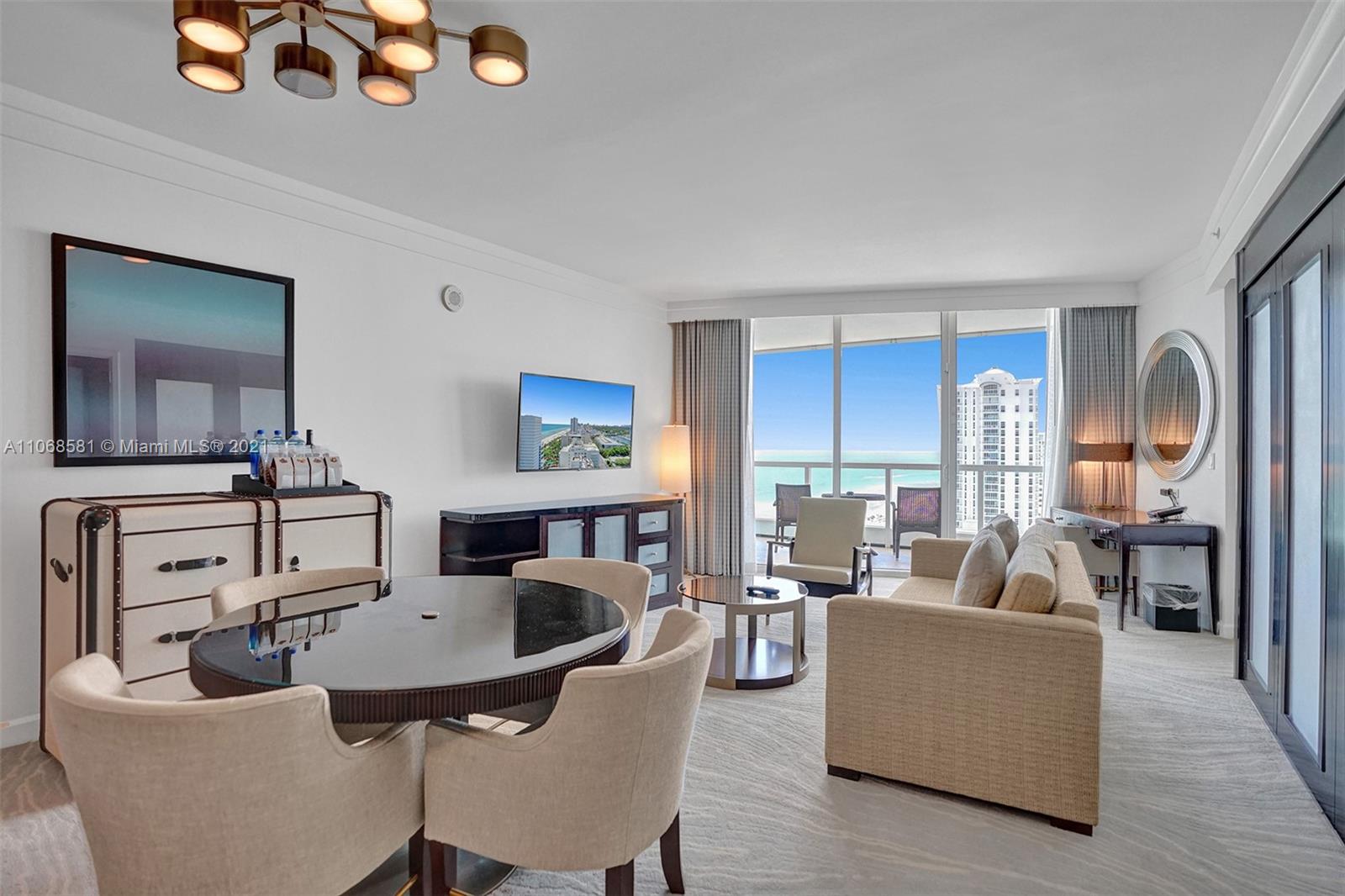 Unique refurbished 802 square foot Jr Suite at The Fontainebleau III with beautiful South facing views of Ocean and city. Enjoy full service, vacation-style living in this fully furnished turnkey unit with 2 double beds, sleeper sofa (sleeps up to 6), marble bathroom & more. Enroll in hotel rental program & receive income while away! The Fontainebleau Resort offers luxury amenities on 22 oceanfront acres including award-winning restaurants, LIV night club, Lapis spa & state-of-the-art fitness center. Maintenance includes: AC, local calls, electricity, valet + daily free breakfast in the owners lounge.