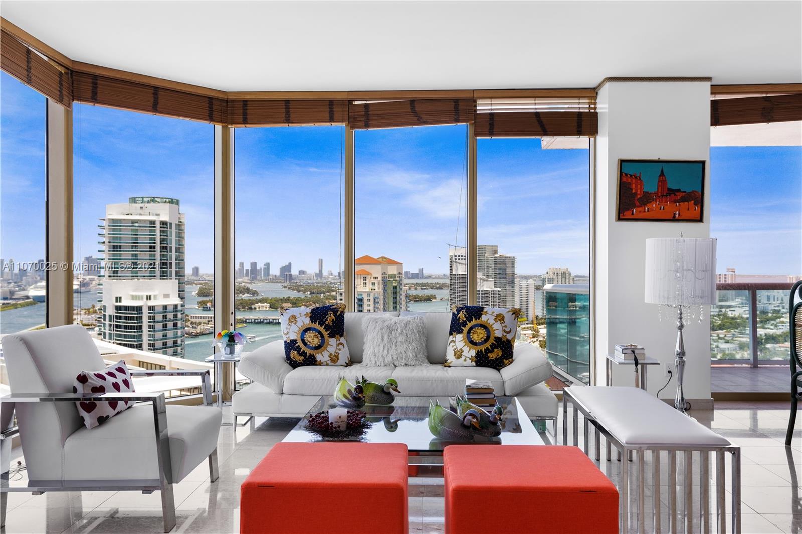 Incredible 3 bed/3.5 bath + DEN residence w/over 2,550 SF of living area + 2 balconies at the Iconic Portofino Towers S of 5th Street. Breathtaking 280 Degree views of the Miami Skyline, Fischer Island, S Pointe and all Miami Beach along the Ocean and Bay. 2 large private terraces with Sunrise and Sunset Views. Marble floors thru out. Steps to the beach, restaurants and all night life S of 5th Street. A truly incredible and rare offering first time on the market. The Portofino Towers offers a new lobby with 40' ceilings, modernized elevator cabs, Portofino Tower is a luxury community with a world class fitness center/spa on the 29th floor, 2 pools with towel service, lounges & cabanas, 2 tennis courts, dog park, BBQ/lounging areas, valet, concierge services, serenity garden.