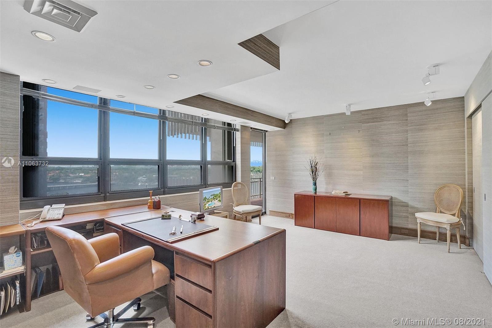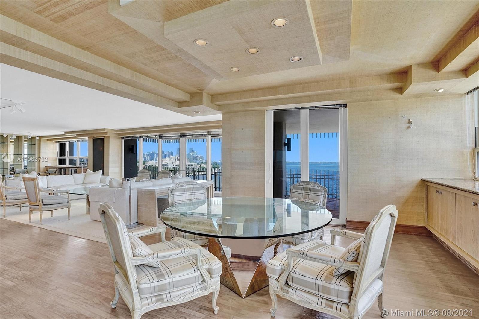 SPECTACULAR 5,012 sf GROVE ISLE APARTMENT: 270 degrees stunning views Biscayne Bay & Coconut Grove. Two 3-bedroom corner units combined by the original (and only) owner with special architectural features to create a home designed for gracious living and entertaining. SPECIAL FEATURES: Approx. 51 ft Living room (space for a grand piano); 32 ft entrance hall; dining room: permanent seating for 16 – and 24 for special occasions; Primary bedroom and attached sitting room, his & hers separate bathrooms & closets; large Library/TV room; large Office & file space; 4 terraces; Guest suite; Service bedroom & bath for housekeeper, health aide, or catering staff. Grove Isle is a secure 20-acre guarded island with full services and resort style amenities. This unique apartment is a rare opportunity.