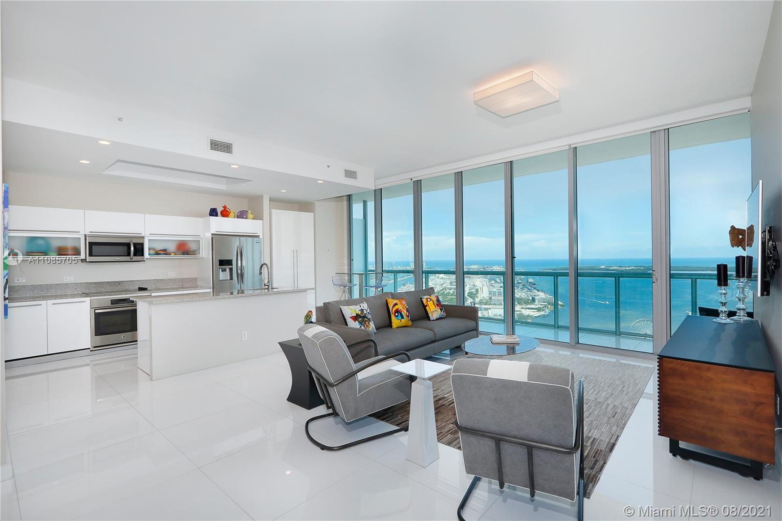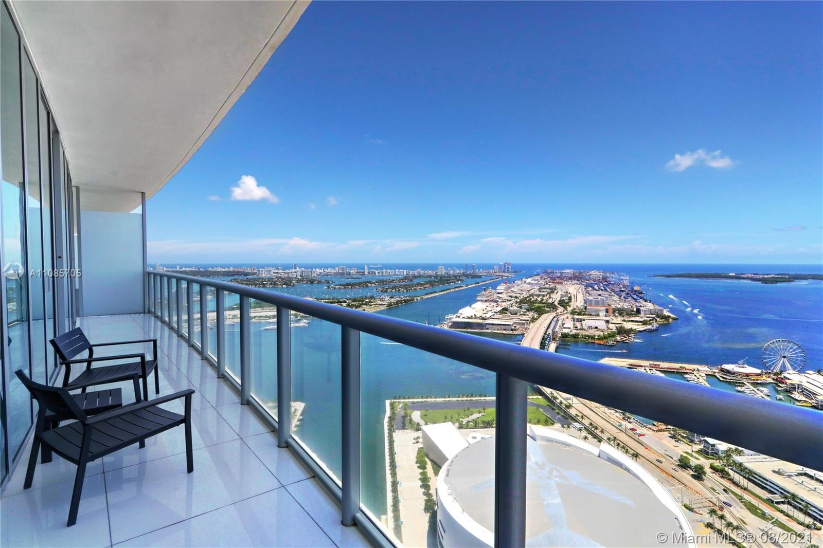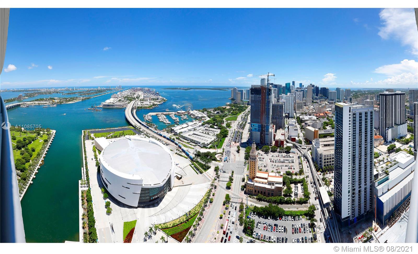 Beautiful skyloft with floor to ceiling windows framing unparalleled skyline and bay views from the 56th floor of Marinablue by Architectonica. This unit offers a spacious balcony and split floor plan with 2 master bedrooms and a half bath. Eat in kitchen, stainless steel appliances and quartz countertops. Tiled throughout with in unit washer and dryer, motorized blackout curtains, storage cage and 1 assigned parking space. Building amenities include sunset & sunrise pools, hot tubs, fitness center, sand volleyball court, business center, putting green, BBQ, 24-hour concierge and valet parking. Ideal Downtown location, minutes away from South Beach, Performing Arts Center, Design District and Major Highways.