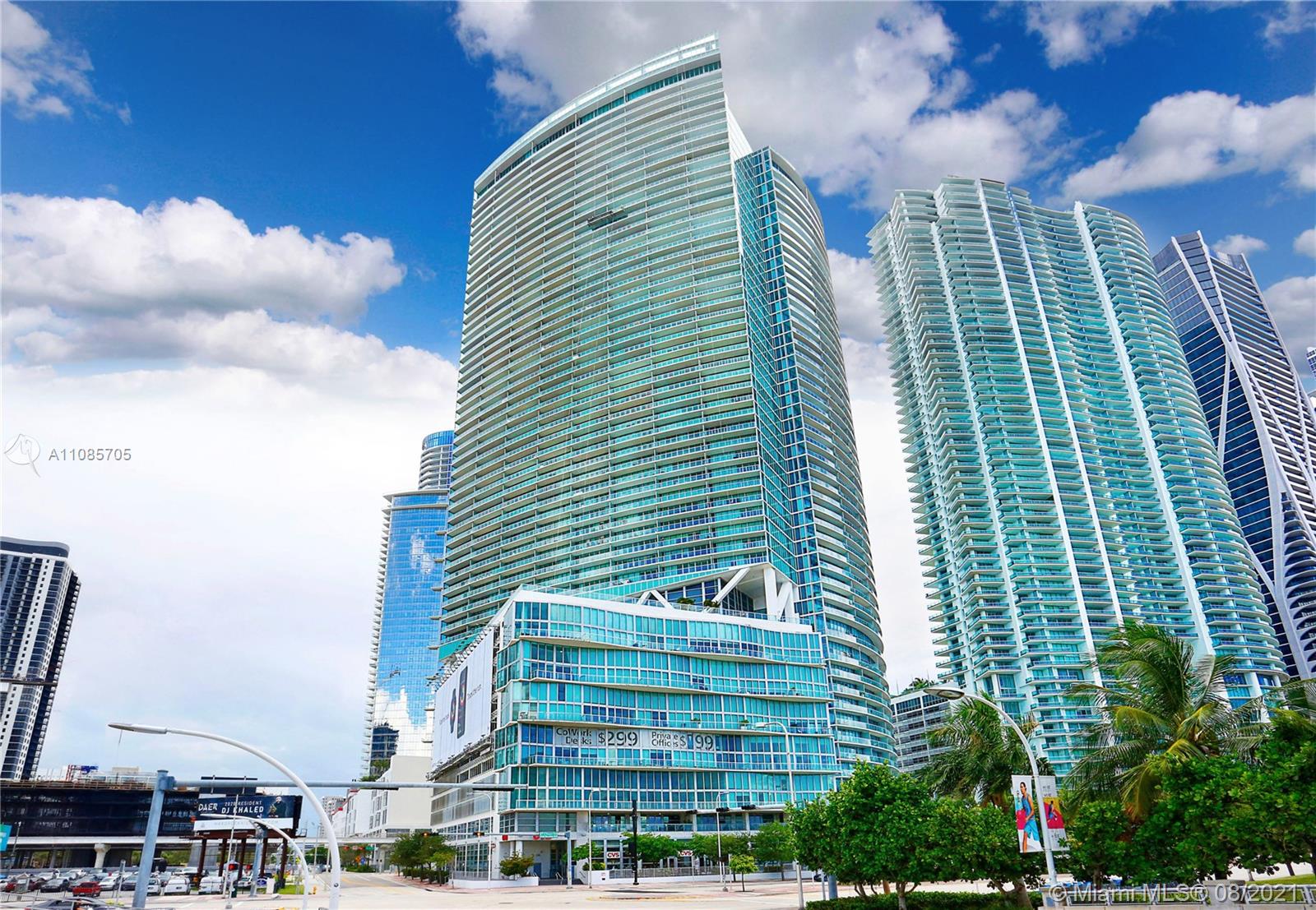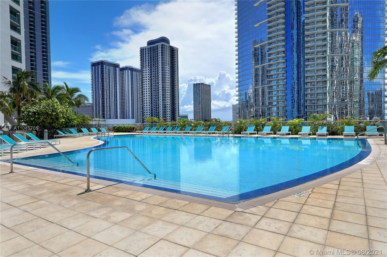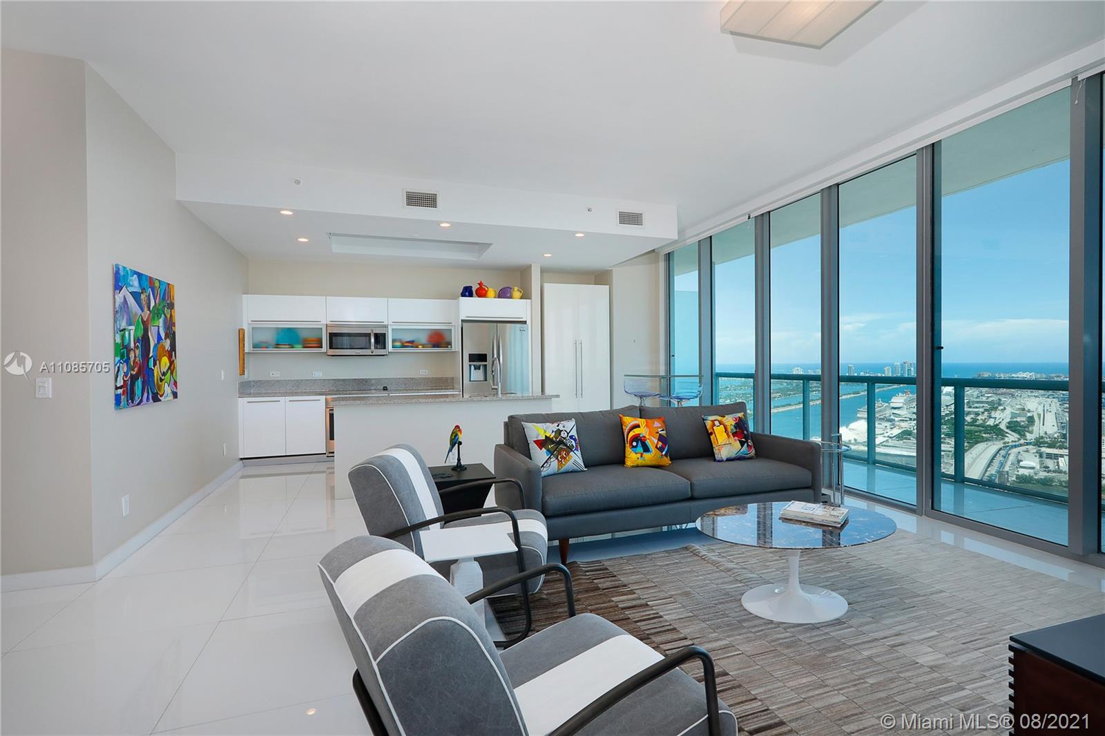 Beautiful skyloft with floor to ceiling windows framing unparalleled skyline and bay views from the 56th floor of Marinablue by Architectonica. This unit offers a spacious balcony and split floor plan with 2 master bedrooms and a half bath. Eat in kitchen, stainless steel appliances and quartz countertops. Tiled throughout with in unit washer and dryer, motorized blackout curtains, storage cage and 1 assigned parking space. Building amenities include sunset & sunrise pools, hot tubs, fitness center, sand volleyball court, business center, putting green, BBQ, 24-hour concierge and valet parking. Ideal Downtown location, minutes away from South Beach, Performing Arts Center, Design District and Major Highways.