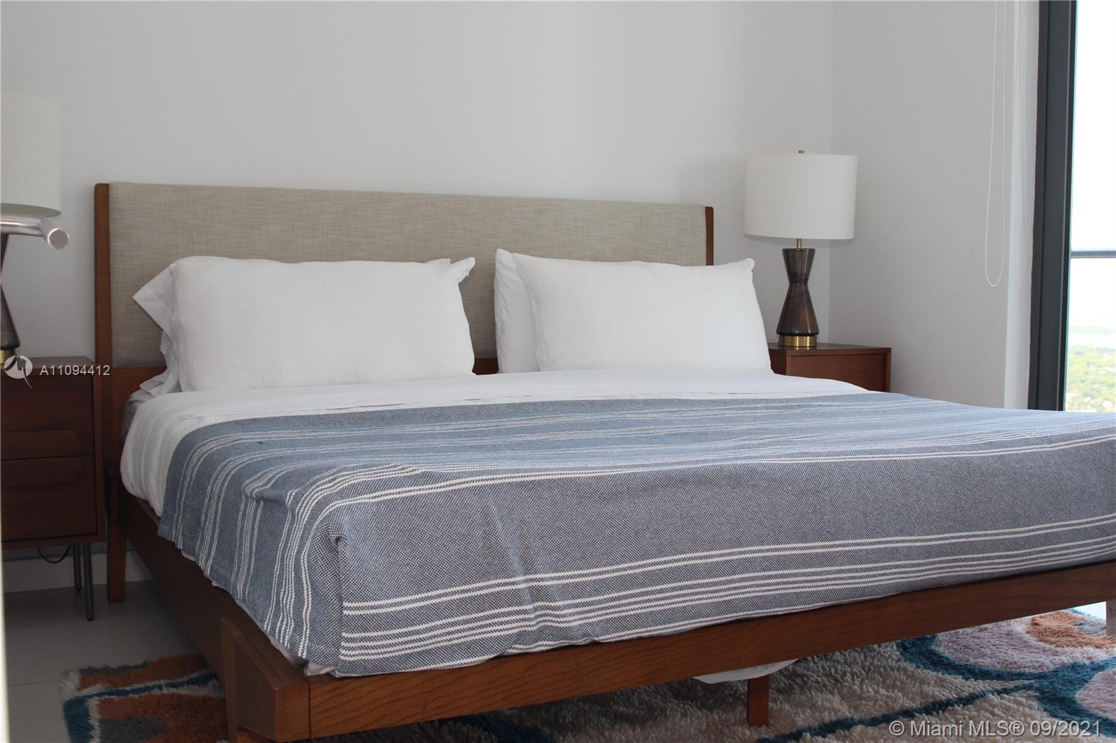 Priced to sell, unit with direct views to the Bay and the Ocean. Beautiful finishes, Italian porcelain tile throughout, Italkraft kitchen cabinets, BOSCH appliances, excellent layout, King size bed in the bedroom, ample terrace. Building features incredible designer finishes by renown Karim Rashid including: tennis court, pool, cabanas, BBQ grills, lounge beds, spa, sauna, treatment rooms, state-of-the-art fitness center, multimedia room, billiards, kids room, club room and STUNNING 46th floor pool deck and hot spa with amazing views. Unit rented until December 2021 at $2250 per month. Tenant could move out with 45 day notice.
