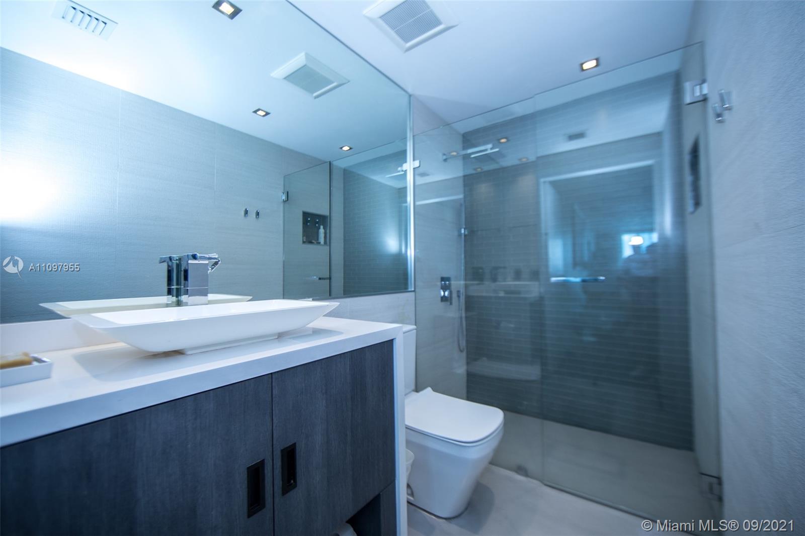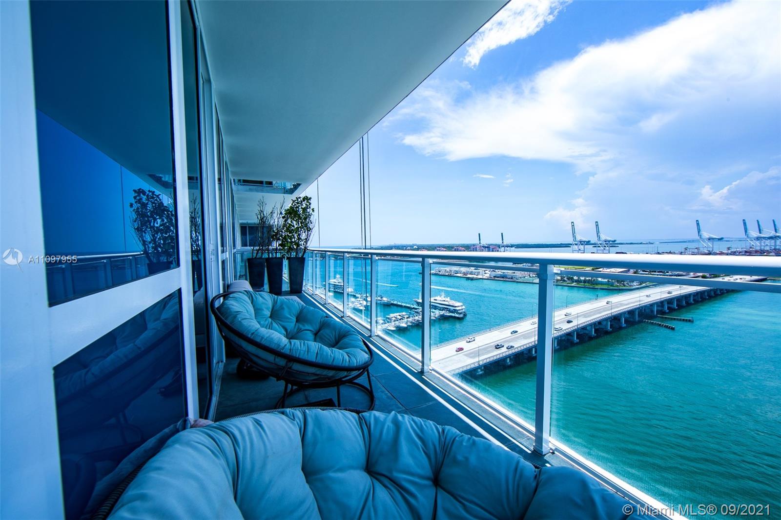 This stunning 2 bed, 2 bath, corner-unit in the Bentley Bay features a wrap around balcony w/ gorgeous bay & ocean views. The entire apartment has been renovated, including kitchen, bathroom & closet upgrades using high-end Italian materials & custom workmanship. Electric operated blackout panels & sheers have also been installed in both bedrooms; as well as modern LED lights throughout entire apartment. Both modern, fully renovated bathrooms have micro-cement floors, custom cabinetry, & quartz countertops. A free-standing tub is the focal point of the master bathroom, along with a complimentary double-sink. The kitchen includes a Sub Zero refrigerator, Gaggenau appliances, quartz countertops, glass tile backsplash, soft-close drawers & additional cabinetry for extra storage.