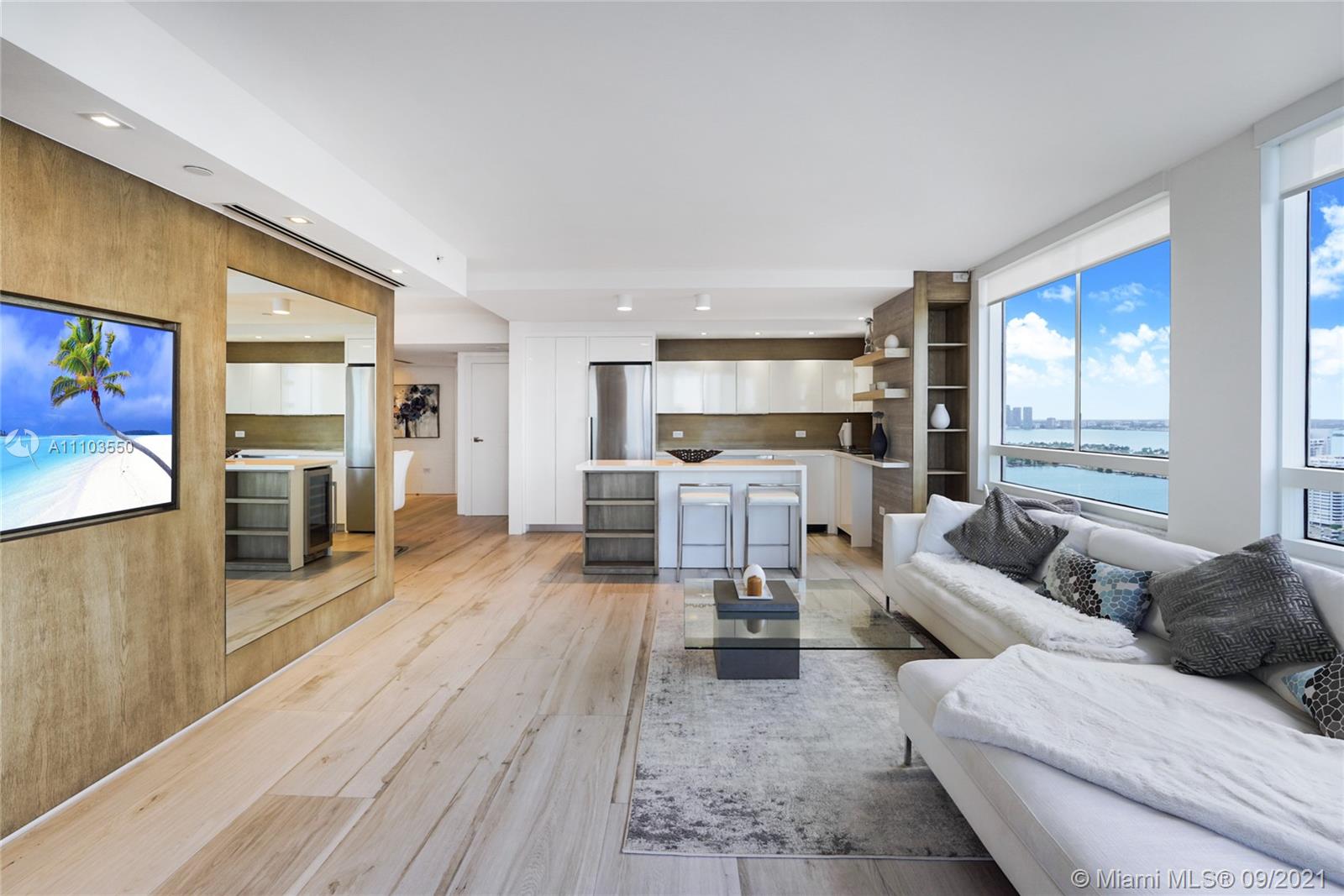 Experience the luxury of the renowned architecture and design firm Lineaire Designs and F&S Developers. This 2 bedroom, 2 bathroom condo on the 34th floor is completely renovated, featuring custom woodwork, extensive plank tiling, lacquer kitchen cabinetry, quartz counters, & modern appliances. The kitchen & living room areas have expansive city & water views, making for incredible evening and sunrise occasions. Other features include fully remodeled bathrooms, custom closet cabinetry, electric window blinds, & a large deep terrace off the living room. The Waverly is a bayfront luxury high-rise building that is full-service, including 24-hour security, front desk, valet, a bayfront pool w/jacuzzi, volleyball gym, tennis courts, business room, garage parking, & so much more.