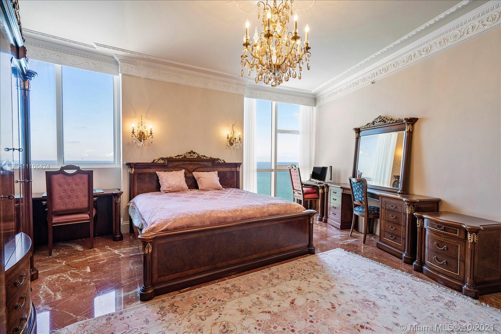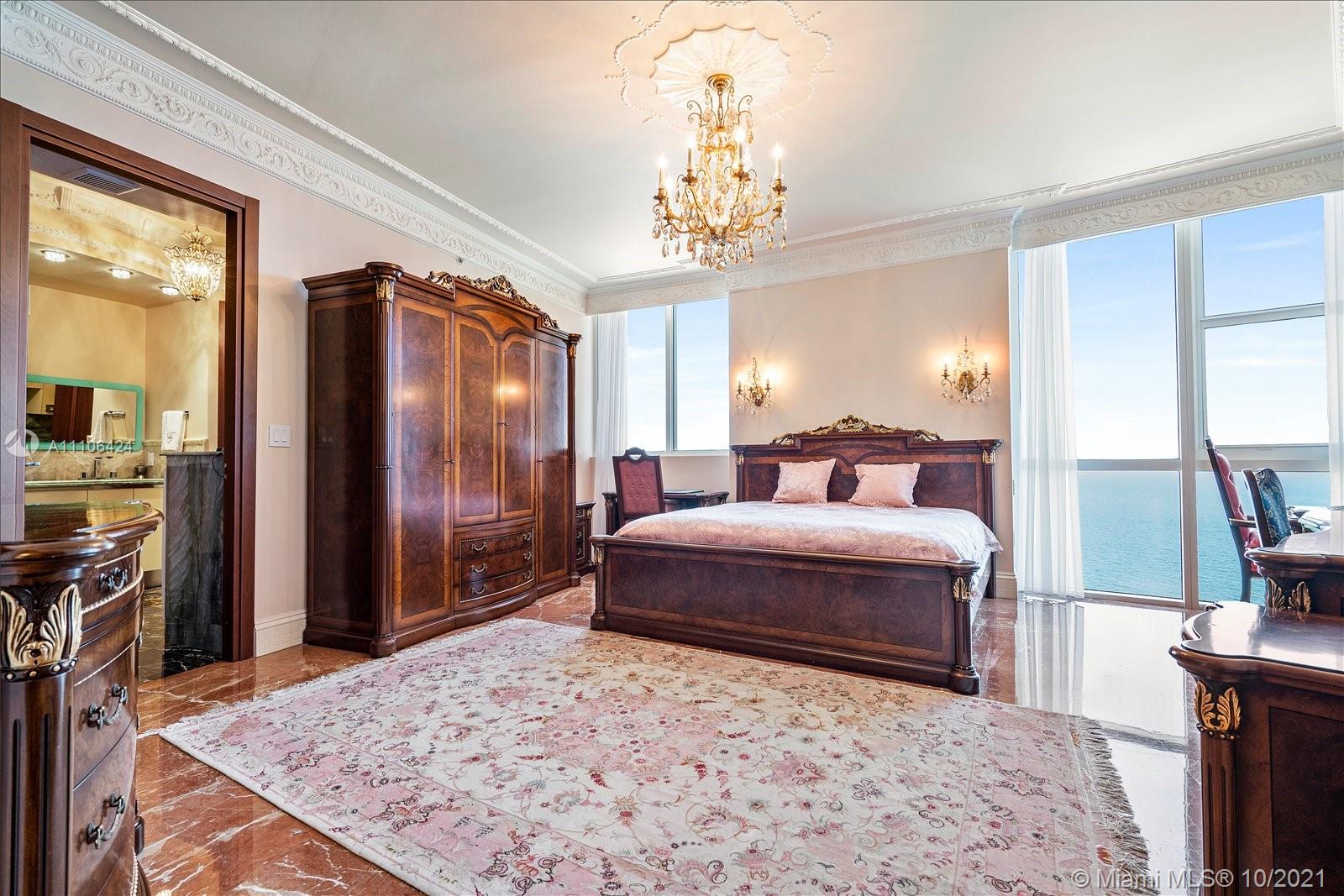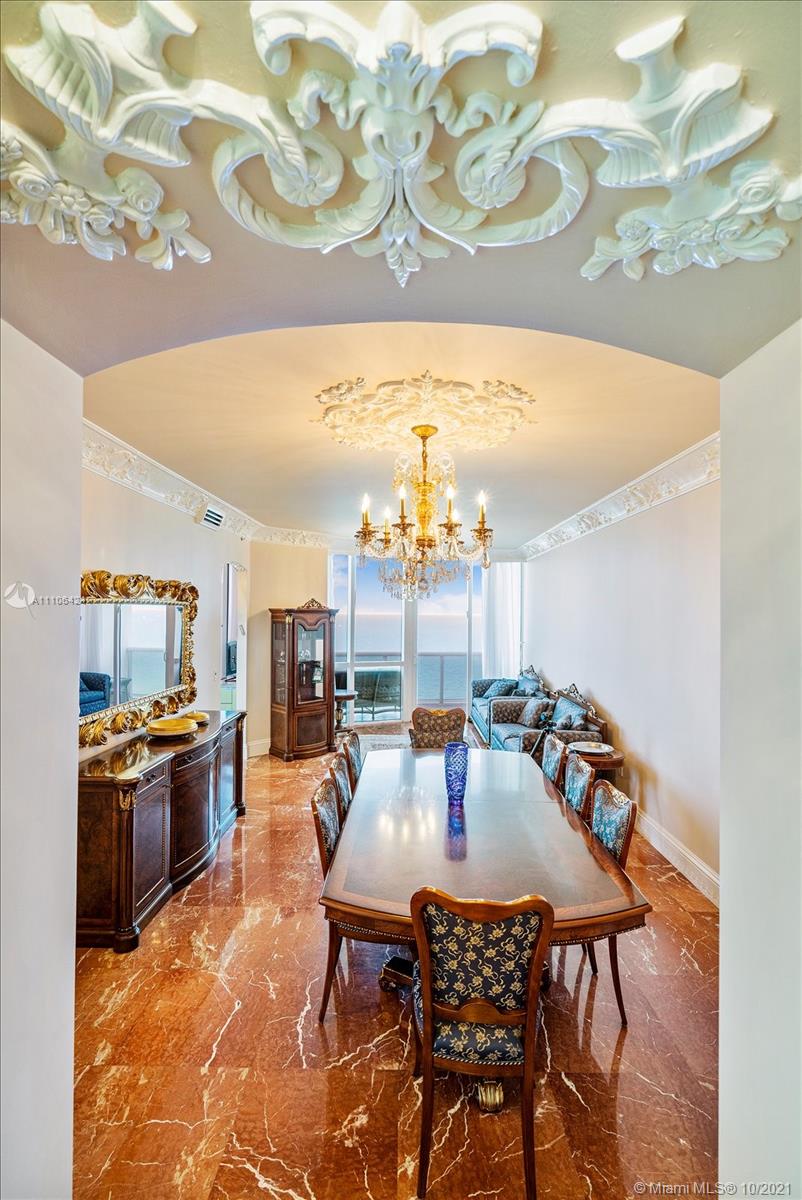 This is the largest two bedroom floor plan in Trump Royale, and boasts endless oceanfront views from all of the floor to ceiling windows in this corner east facing unit. Ceilings are true 10 ft in this unit! Enjoy a large living area, eat in kitchen, and an oversized master bedroom and master closet. No expense was sparred! Owner gutted the entire unit , marble and onyx floors, custom Italian doors, custom bathrooms and custom Italian kitchen featuring two subzero refrigerators, all upgraded Miele appliances with two stoves and two sinks. Miele washer and dryer. Custom closets, crown moldings , ceiling designs, custom lighting, chandeliers, all Italian furniture and so much more. Fully equipped, just bring your toothbrush!