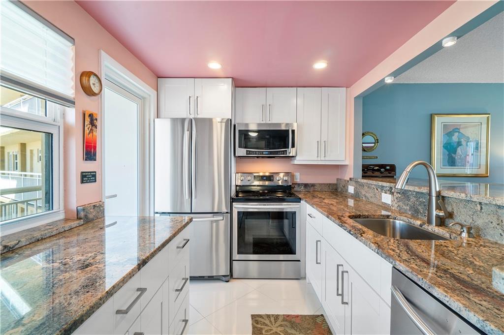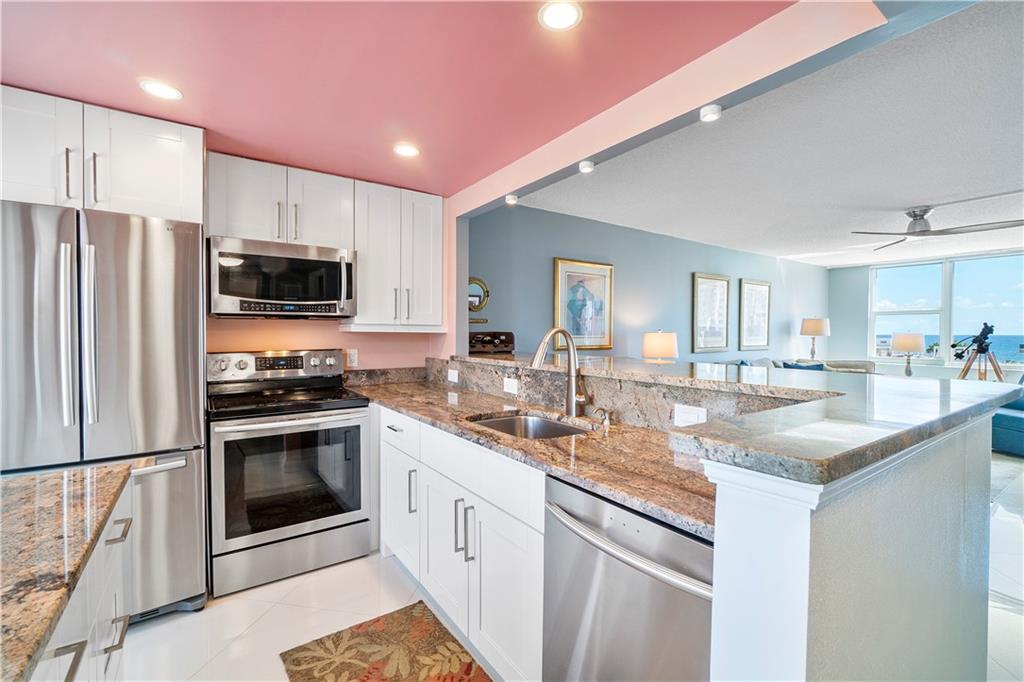 Live across from the Ocean & all that newly developed Pompano Beach has to offer. Enjoy the views from each window. Sit on your balcony and watch the ocean & the action of the city . Look out of your kitchen window & see the intracoastal & North of the city . This unit has been remodeled - kitchen has stainless steel appliances, granite counters , white cabinets & built-ins for loads of storage . Open floor plan- light & bright - Shiny procelain tiles - bathroom has been redone with glass shower door & new cabinetry- High impact doors & windows. Walk to the Pompano Beach Oceanfront area with a promenade of shops & 9 restaurants. This unit will not last!