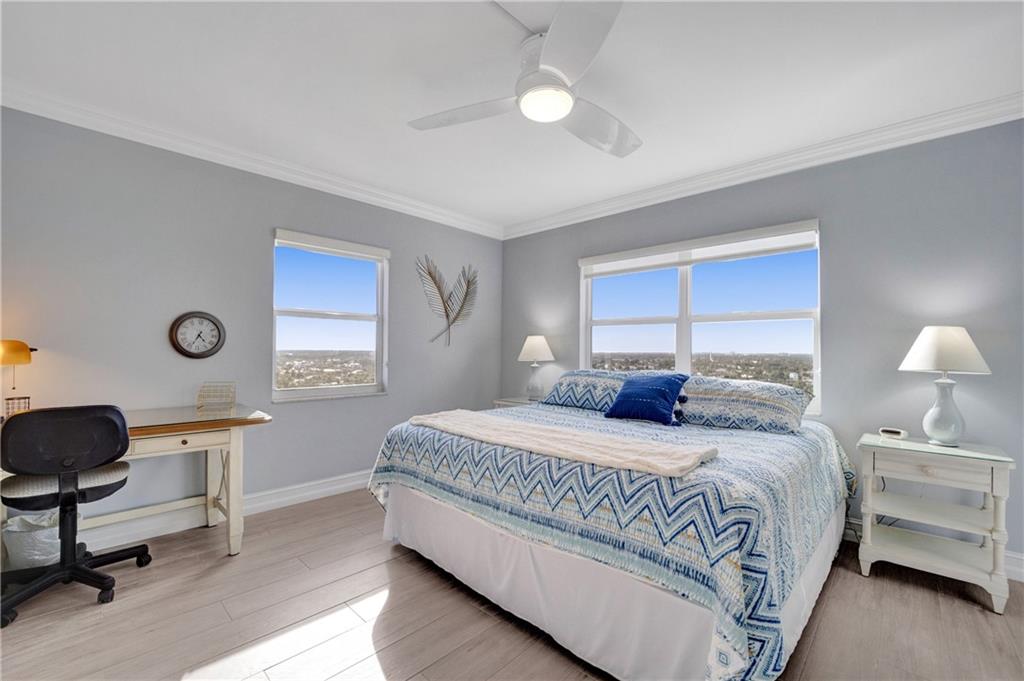 Beautifully renovated, gorgeous 2BD/2BA condo on the sand in Lauderdale By The Sea! High-end modern finishes, wood plank floor tiles, crown molding, updated bathrooms and a fabulous kitchen with quartz counters and stainless steel appliances, sold turn-key. High floor with large open balcony has NE views of the ocean and SW views of the city, Intracoastal and stunning sunsets. There is a washer/dryer in unit, a storage room on the floor and one covered parking space. Leisure Towers is directly on the sand and offers private beach access, heated pool, shuffleboard and an entertainment room. Close to shops, restaurants and nightlife. Enjoy Florida living with the beach and ocean in your backyard! Rental Income Jan 1-April 15, 2022.
