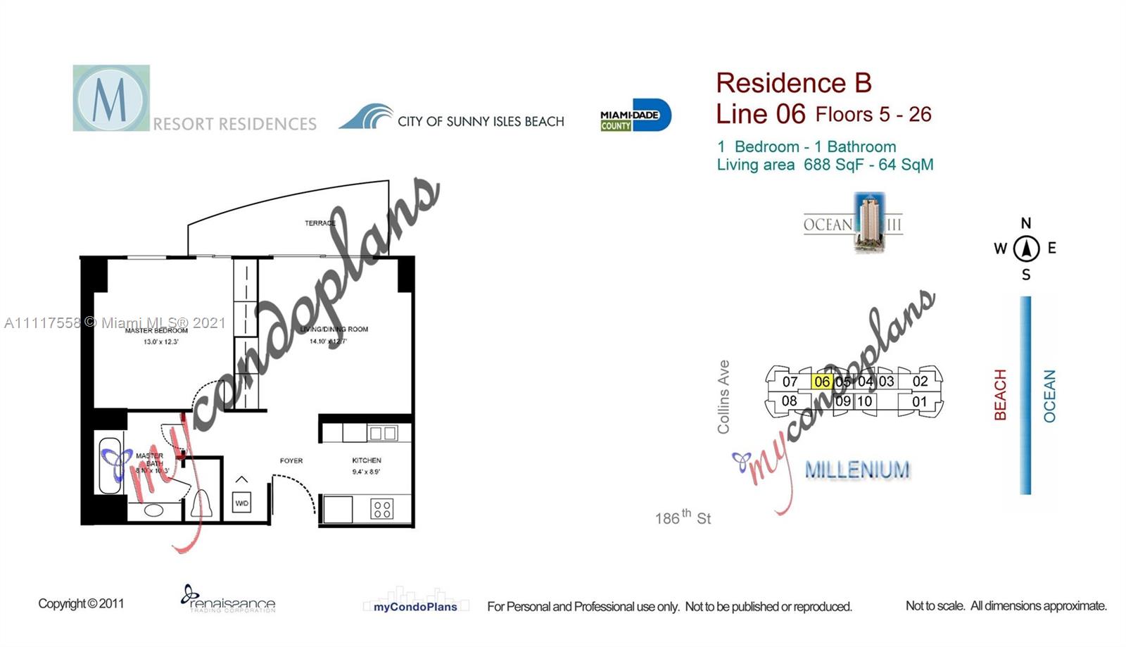 • Жилая площадь: 688 фут² / 64 м²
