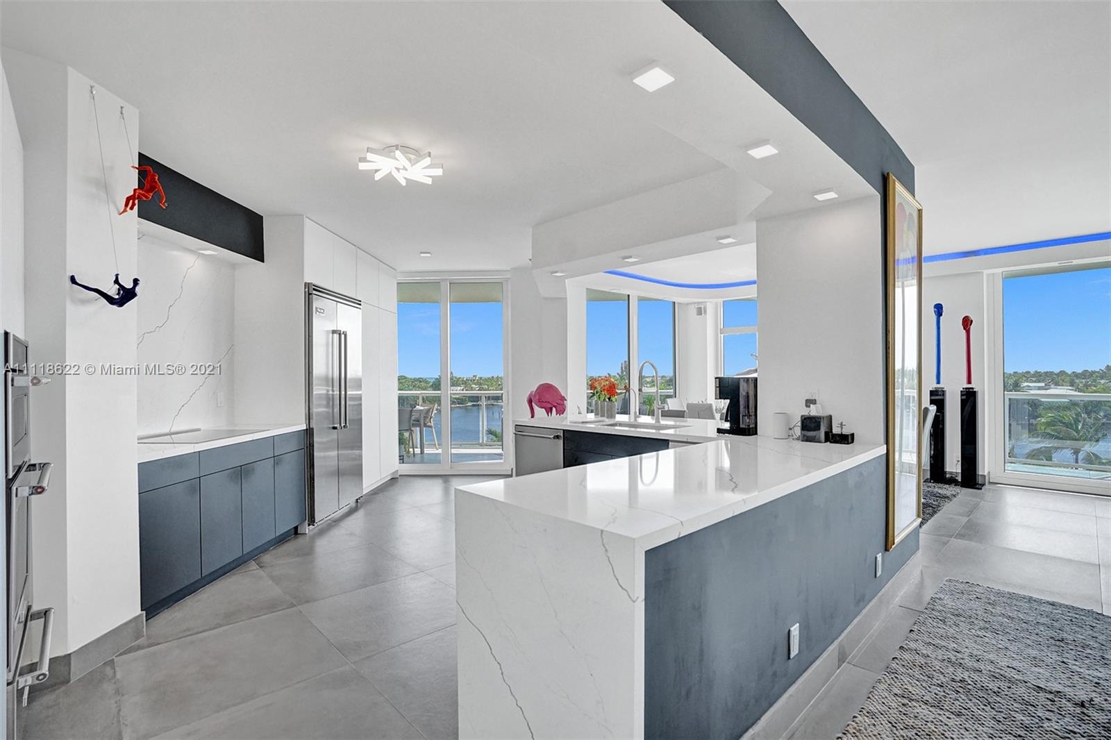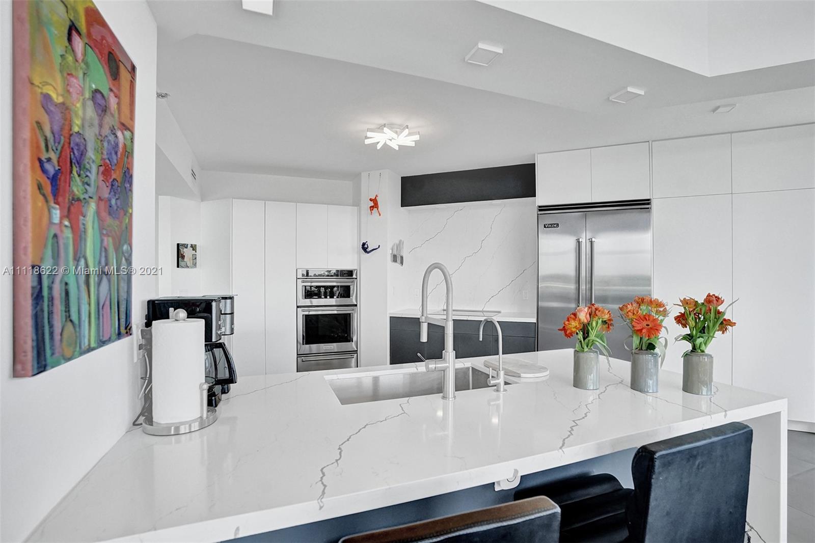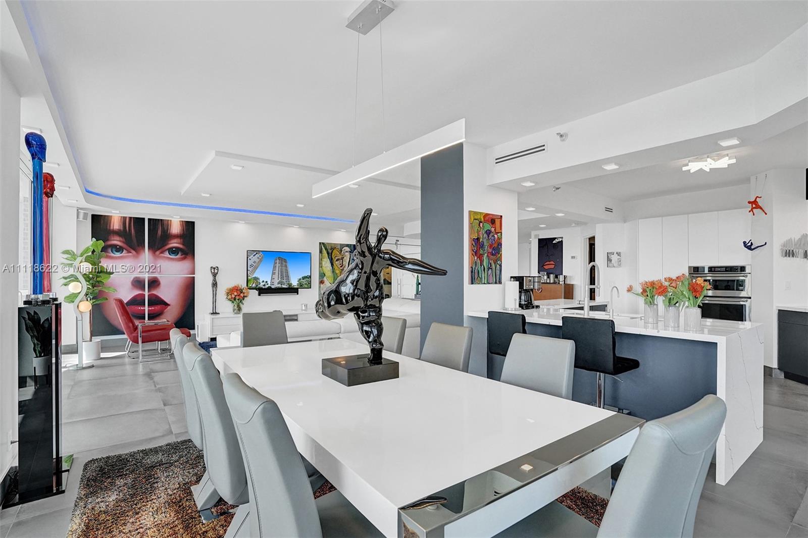 This impressive contemporary residence surrounded by Awe-inspiring water views. Fully remodeled unit with incredible outdoor space accessible from every room. Features porcelain tiles and recessed lighting throughout. LED colored lighting surround in main room. Electric shades. A stylish kitchen that flows through to the dining room. Stainless steel Viking refrigerator & Kitchen Aid appliances, Reverse Osmosis water filter, white & grey cabinets, quartz counter tops & back splash. 3 bedrooms, 2.5 luxurious baths. Master bedroom with walk-in robe & ensuite, modern free standing oval bathtub, separate glass shower with elegant porcelain tile. Extraordinary Smart home/electronics features. One Island Place, a luxury gated resort style community that has direct access to the Waterways Marina.