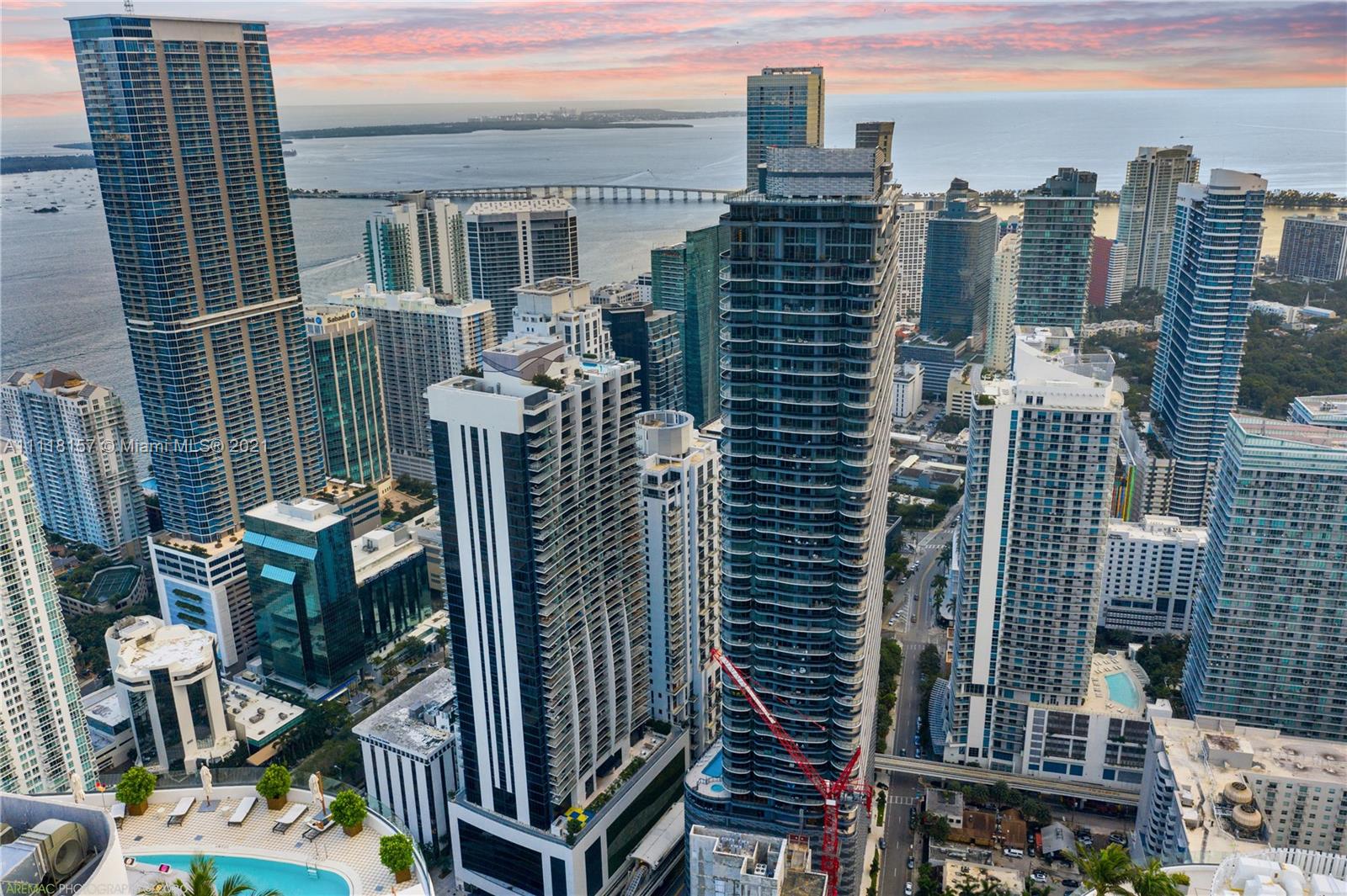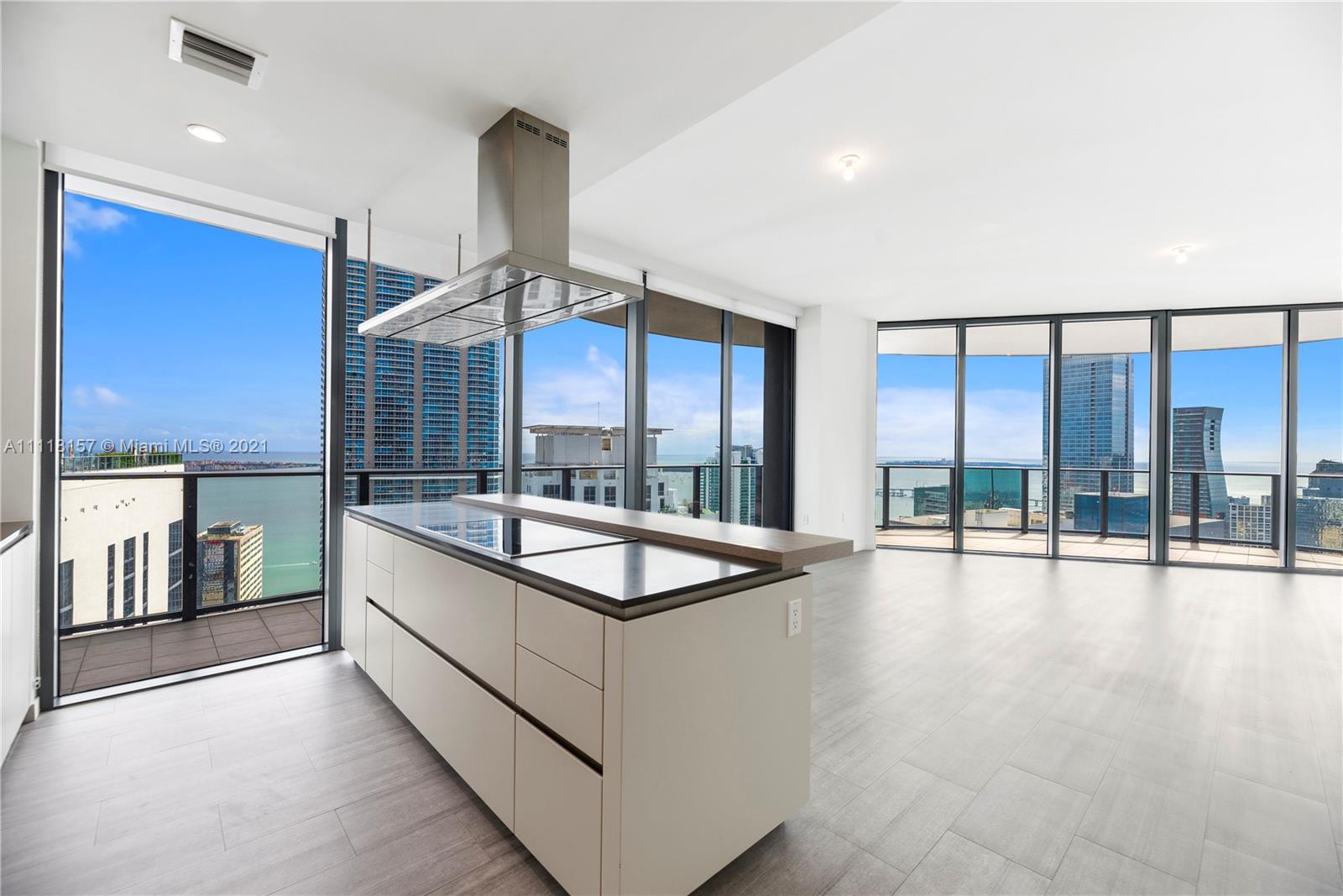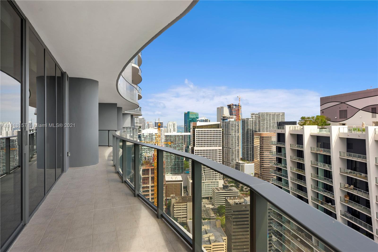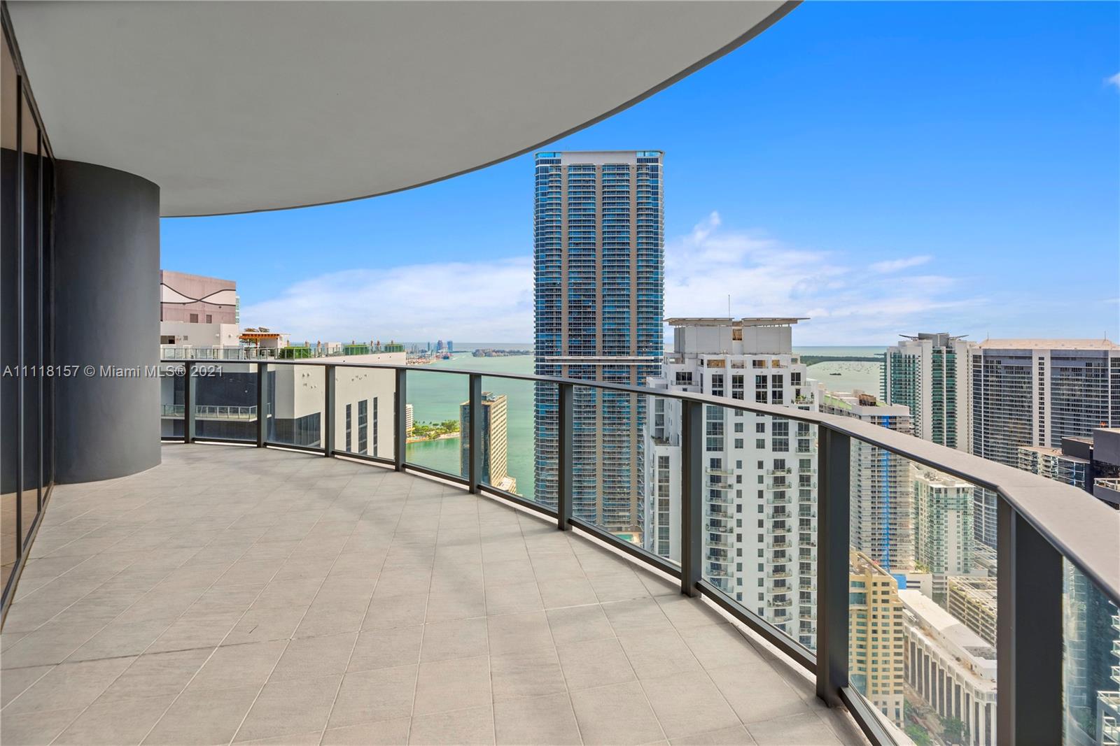 Brickell Flatiron Penthouse. Unobstructed panoramic views with SE Exposure [Best line] Corner unit with wrap around balconies throughout. 3 Beds- 3.5 Baths with 1,955 SQFT of living area, 10 ft. ceilings, floor to ceiling impact windows and sliding doors, Italian Snaidero Kitchens and Bathrooms, built-out closets, Miele appliances, and other luxury finishes. Full-service building with concierge service and resort style amenities includes the 64th Floor Sky Club, a spa, gym, theater, and lap pool, club room, lounge room, movie theater & Billiards. Two assigned parking space and valet service. Fantastic location in the heart of Brickell. Vacant turn-key unit easy to show.