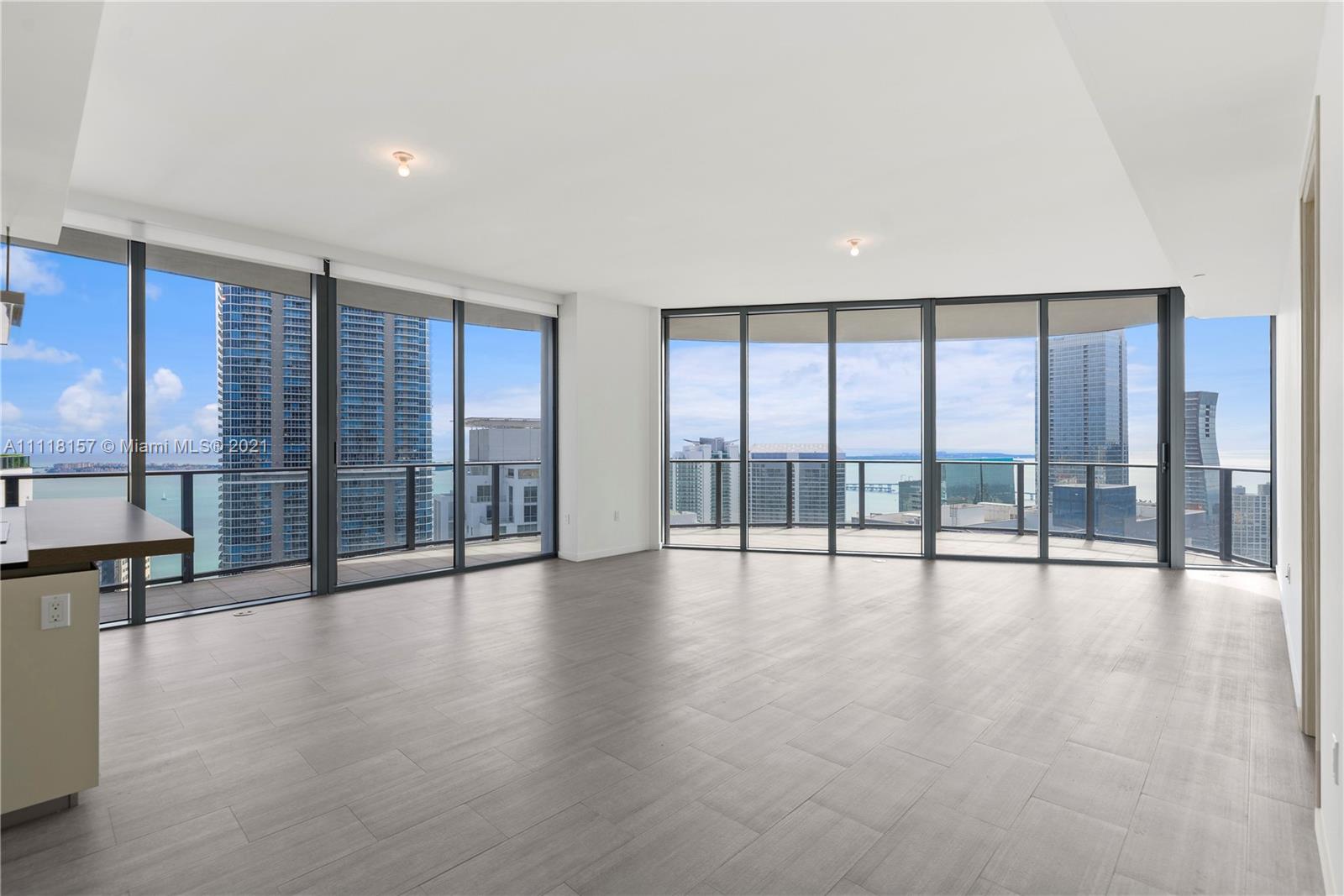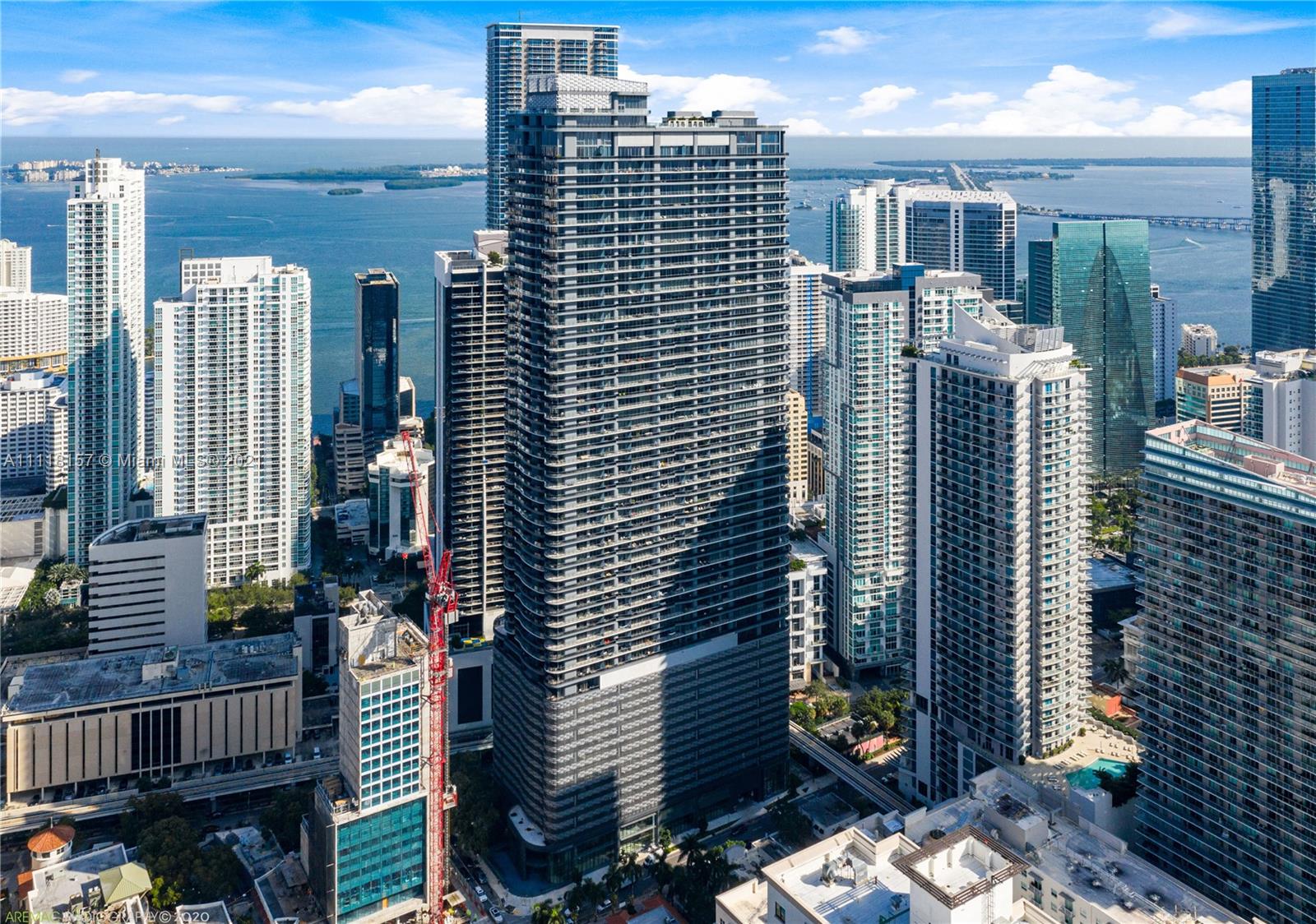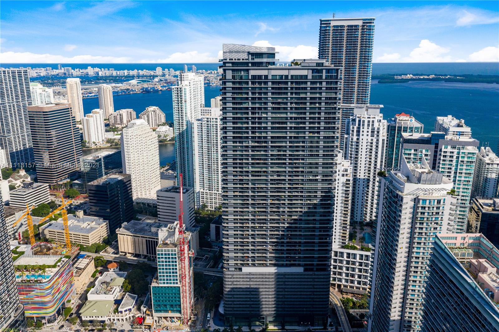 Brickell Flatiron Penthouse. Unobstructed panoramic views with SE Exposure [Best line] Corner unit with wrap around balconies throughout. 3 Beds- 3.5 Baths with 1,955 SQFT of living area, 10 ft. ceilings, floor to ceiling impact windows and sliding doors, Italian Snaidero Kitchens and Bathrooms, built-out closets, Miele appliances, and other luxury finishes. Full-service building with concierge service and resort style amenities includes the 64th Floor Sky Club, a spa, gym, theater, and lap pool, club room, lounge room, movie theater & Billiards. Two assigned parking space and valet service. Fantastic location in the heart of Brickell. Vacant turn-key unit easy to show.