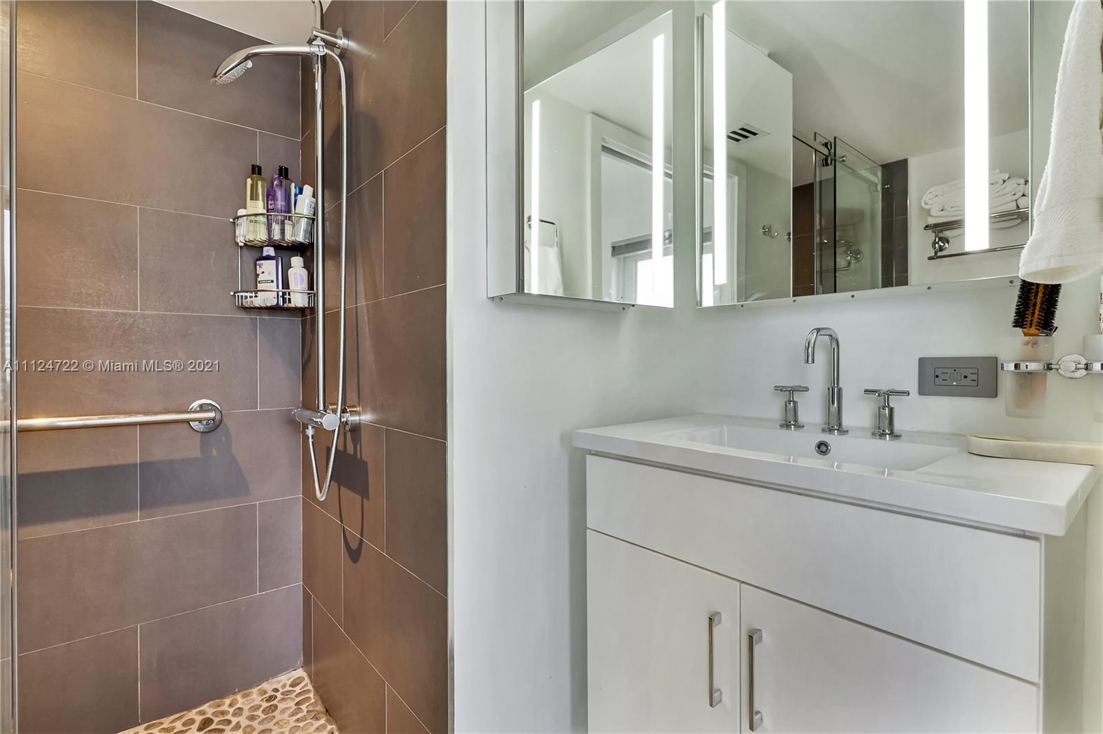 Walking distance to Sunset Harbour and Lincoln Rd, this rare high-floor corner unit comes with impact-resistant windows, elegant AC linear diffusers, year-old AC and water heater, faux Toto toilet in the master, in-unit washer and dryer, built-in custom closets. Water views from every window. No expense was spared during the remodeling of this 3/2 converted into a spacious 2/2. The 3rd bedroom opened to the living room serves as a TV room with linear recess light and a dry bar. From both balconies, enjoy the sunsets over Biscayne Bay and views of the Miami skyline. Double vehicle tandem parking space. 2 25lbs pets allowed. Amenities include a gym, a social room, a pool, a jacuzzi, bike storage. Financially sound building with low maintenance fee.