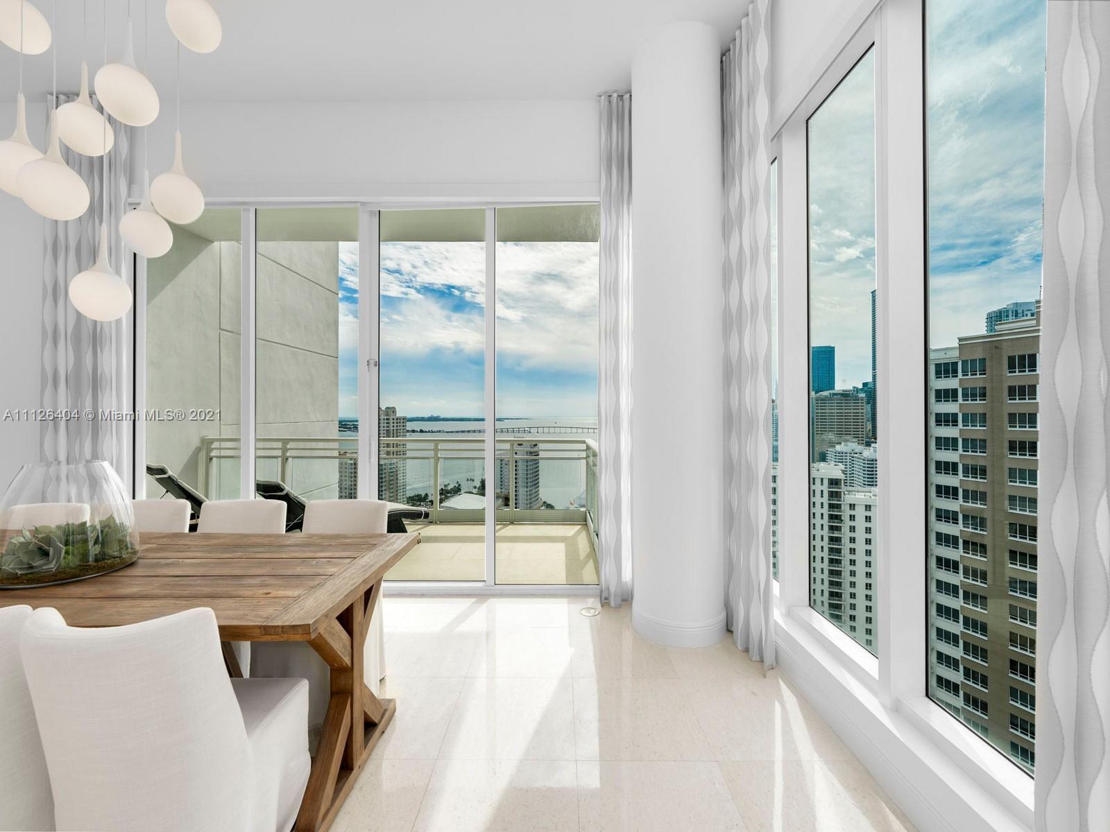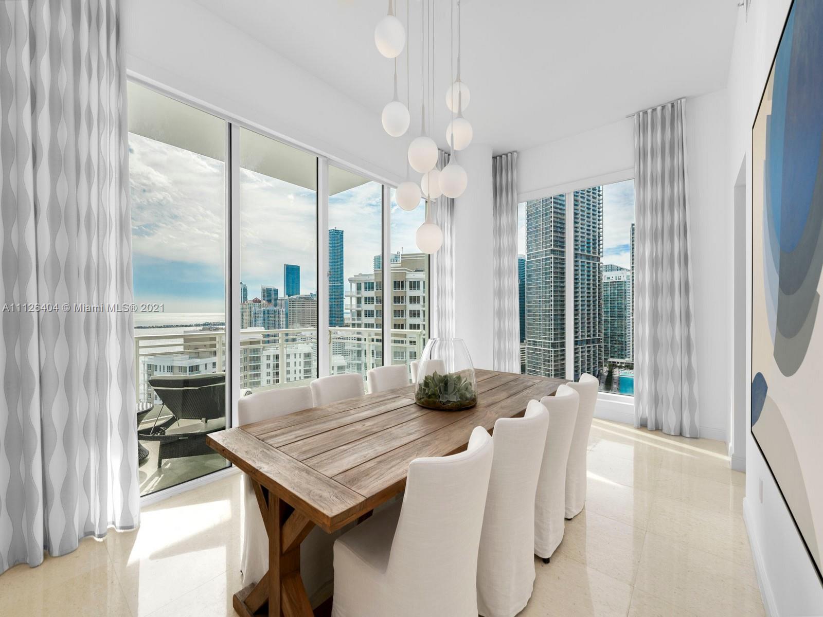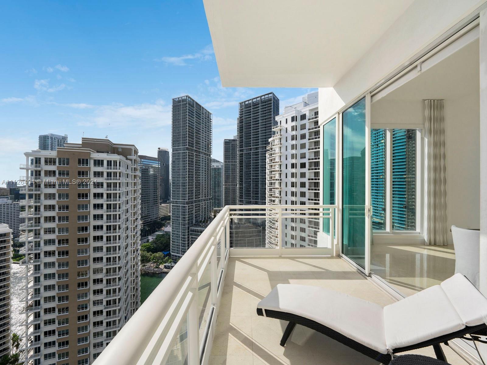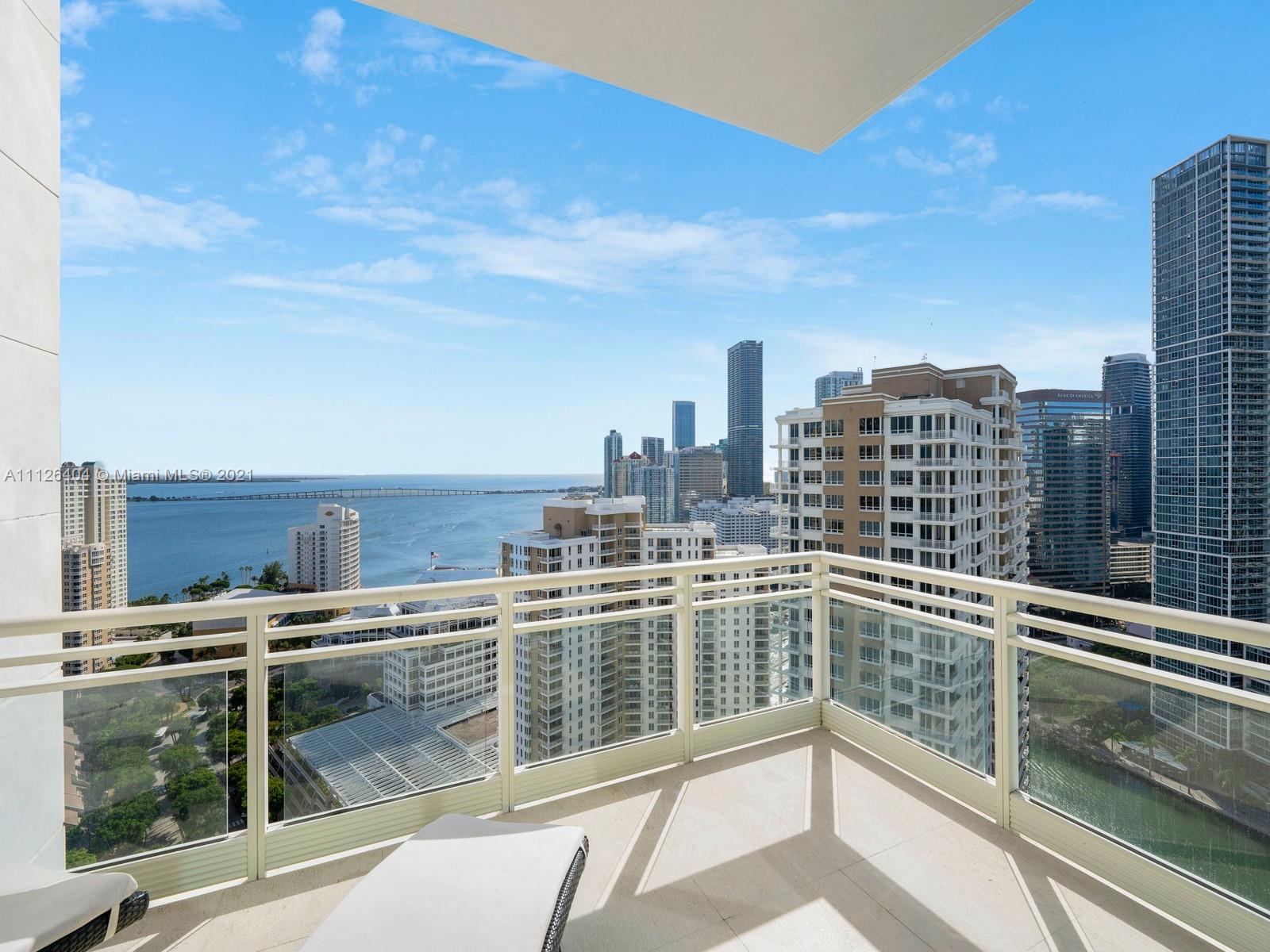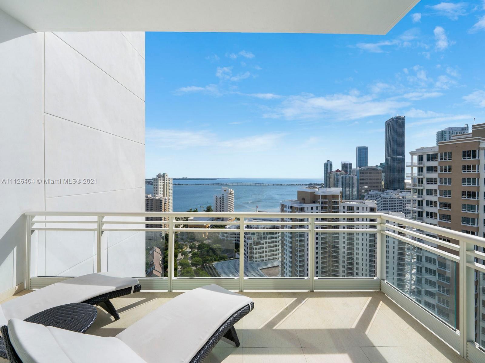 An exquisitely designed corner unit at Asia in the desirable island of Brickell Key. As you enter private elevator to foyer, you are mesmerized by the 12-foot ceilings and views of Miami's finest skyline. This unit features 3 bedrooms, 4.5 bath, den , 4 balconies, private elevator, 2 assigned parking spaces, storage unit, complimentary valet and exceptional amenities such as tennis court, swimming pool, lap pool, gym, sauna, racquetball court, 24 hour concierge, valet, and security.