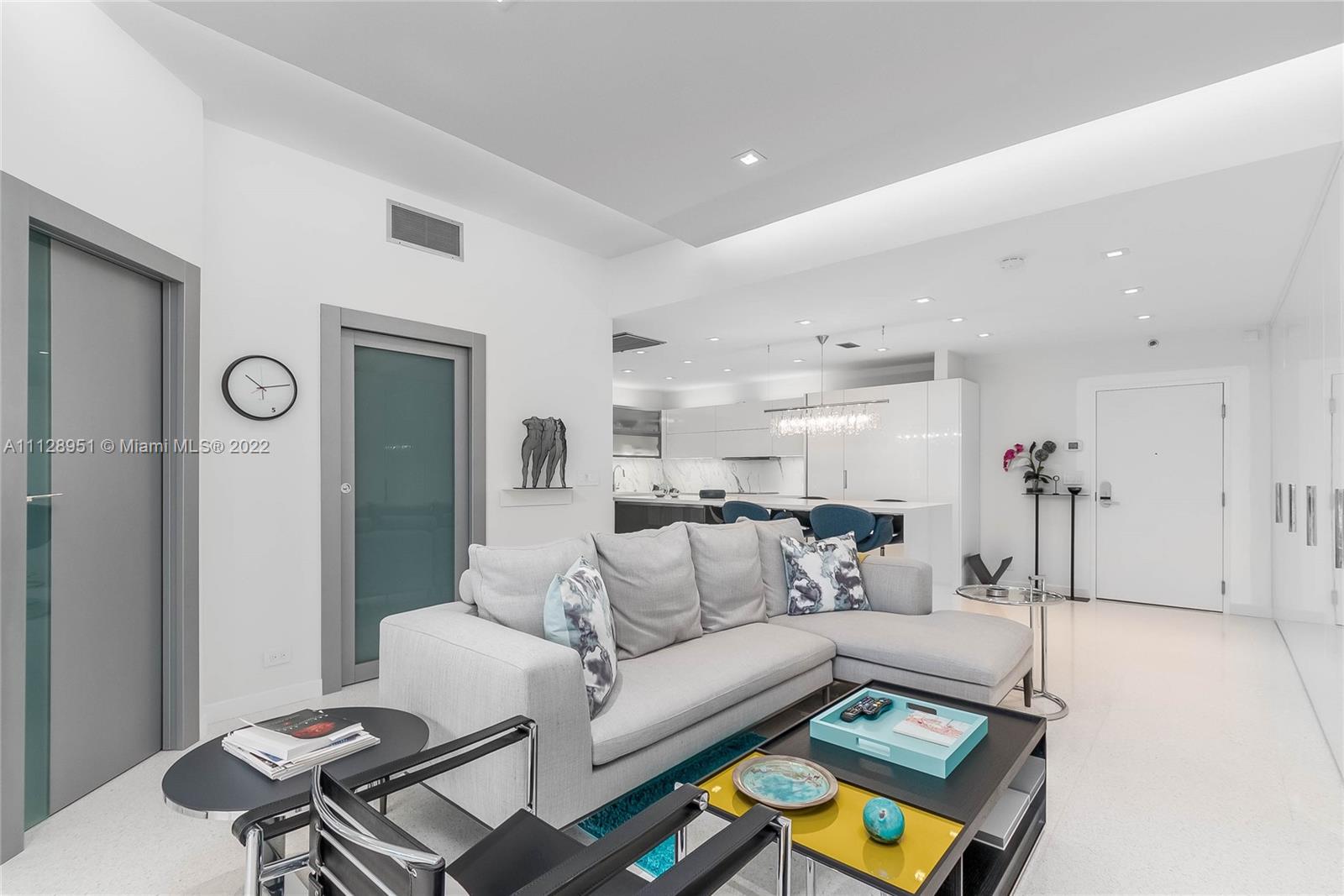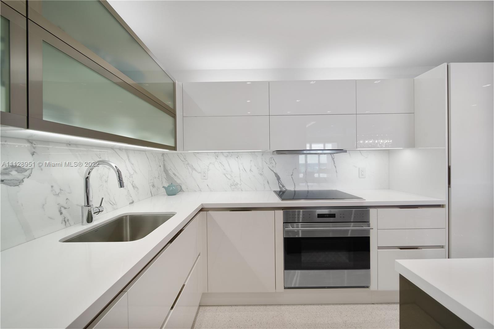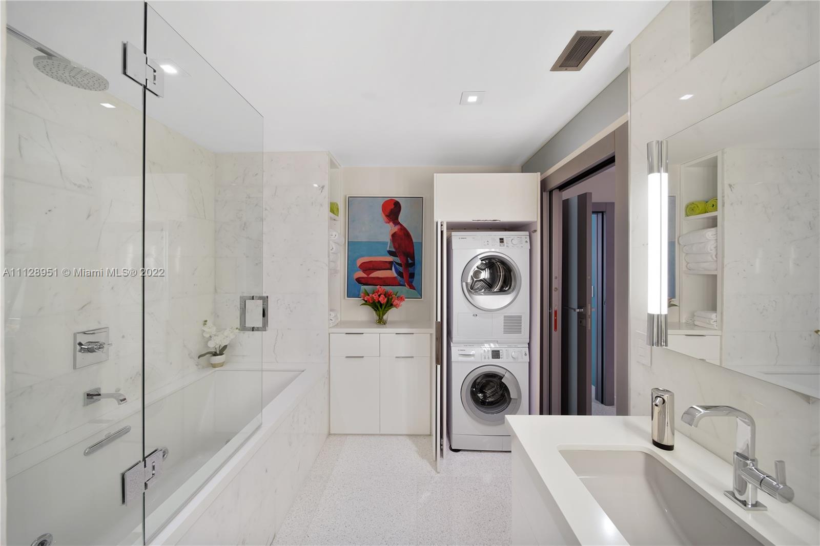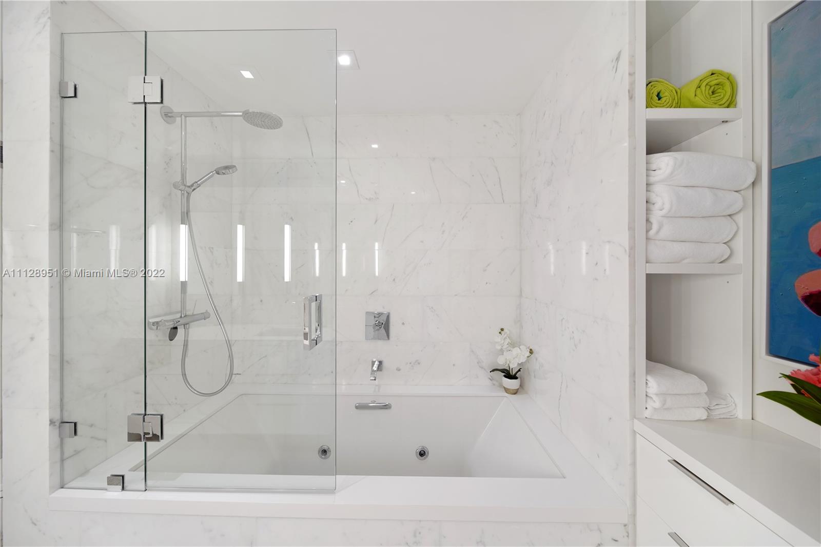 Clear Ocean Views, 23rd St South to tip of Island. South Beach Roney Palace. Penthouse 10 ft. ceilings. High end furnishings included in sale. Laser-leveled cool- white terrazzo flooring throughout. Floor-to-ceiling Carrara Bianco marble tiles. Elegance in both bathrooms. Custom Veneta Cucine cabinets build a clean line in the kitchen & are dramatically backed by two 9 ft-long single-slab marble backsplashes. Separate master br suite. Walk-in closet, & bath fitted oversized whirlpool tub provides an extra measure of host privacy. Top of the line appliances. Wolf oven, cooktop, & microwave; Bosch dishwasher; Sub-Zero Refrigerator, Bosch Axxis washer/dryer. Custom Barausse Italian doors, Disappearing pocket doors. German-engineered remote-controlled retractable Queen Murphy bed. Storage.