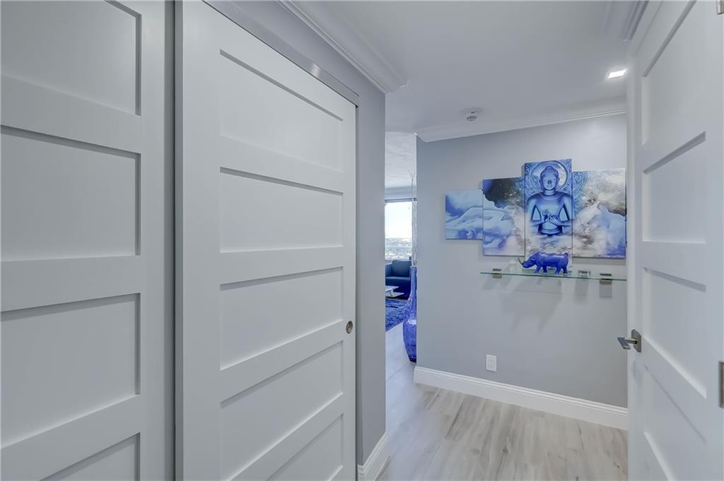 PENTHOUSE unit, totally redone with beautiful new plank flooring. All kitchen appliances still under warranty. Gorgeous bathroom. Incredible view for miles. You can see the ocean, watch boats going by on the intracoastal and look over Coral Ridge Golf Course. A separate clubhouse on the intracoastal is perfect for bbq's with floor to ceiling windows. Short walk to the beach, close to shopping, entertainment, restaurants, grocery stores. Building is almost done with the 50 year concrete work, being painted with new glass balconies. Cash only 55+ community, minimum 700 credit score, no pets, no renting. Minimum $57,600 income required to purchase this unit. $550 per month maintenance includes water, sewer, trash, wifi and cable.
