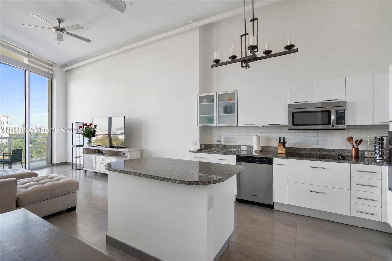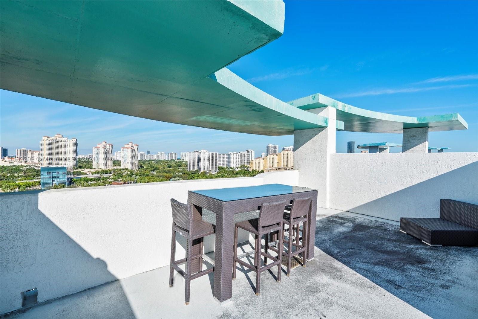 Beautiful penthouse with impressive views; Modern and tastefully updated loft with 14 foot high ceilings and private furnished 510 Sq ft. Roof Top Terrace, with unobstructed views. Kitchen redone with updated cabinets, new backsplash, and new installed wine cooler. Brand new custom-built 10 feet high bedroom closets with clothing racks and built-in dresser drawers. Brand new custom-designed office with 8 foot high built-in cabinets for additional clothing space, and custom cabinets installed over the office, for additional office storage space. Marble flooring throughout the unit-including the Patio area. New Lighting, Fans, and chandelier throughout the Loft. Updated Bathrooms; new LED Mirrors and new light fixtures. Unit completely newly painted and sold furnished.