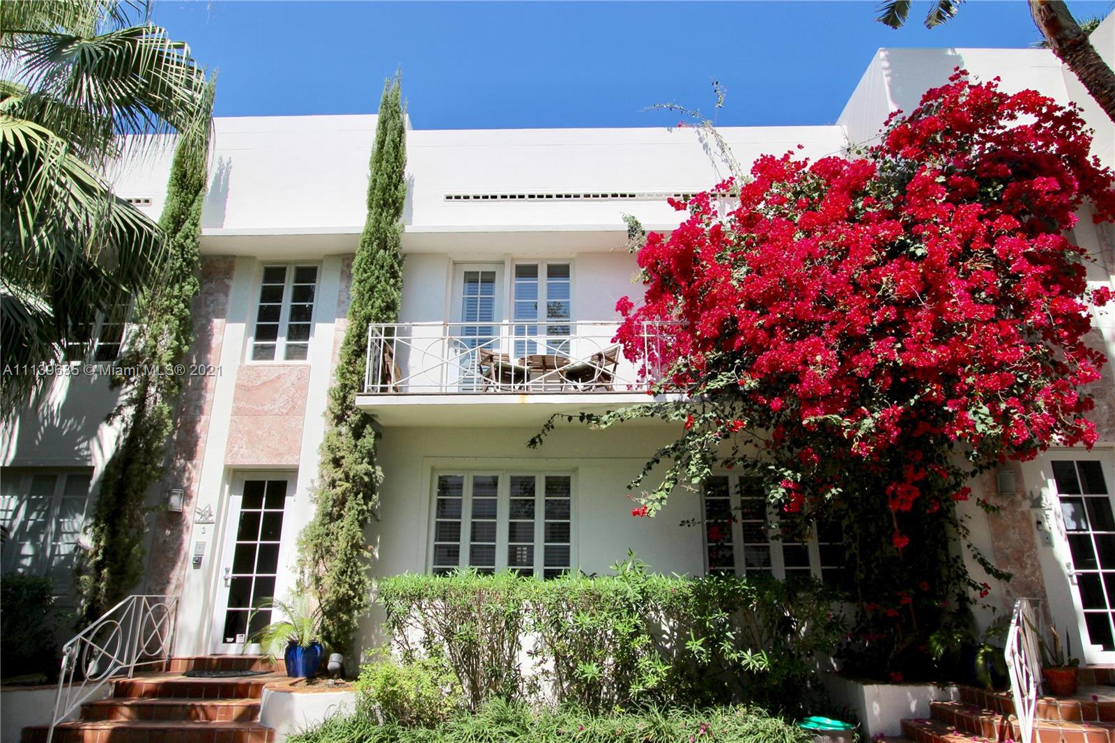 SPACIOUS ONE OF A KIND 3 bedroom TOWNHOUSE in MB Deco Bldg. BRAND NEW AC UNITS & IMPACT WINDOWS!! Direct entrance from garden level leads to a private foyer & expansive staircase. The ground floor boasts an enormous Living area with an open yet separate dining area just off the kitchen. Also on ground level is a bedroom with ensuite NEWLY RENOVATED bath&laundry. Wide stairway leads to 2nd floor which offers a cozy den area as well as 2 Large Master Suites, each with ensuite baths. South facing balcony overlooks tropical garden. Townhouse is wide & bright & very charming. Wood floors throughout, ample storage & immaculately maintained in an intimate building. A truly unique home walking distance from Lincoln Rd, the Beach & Flamingo Park boasting brand new STATE OF THE ART SPORTS FACILITIES