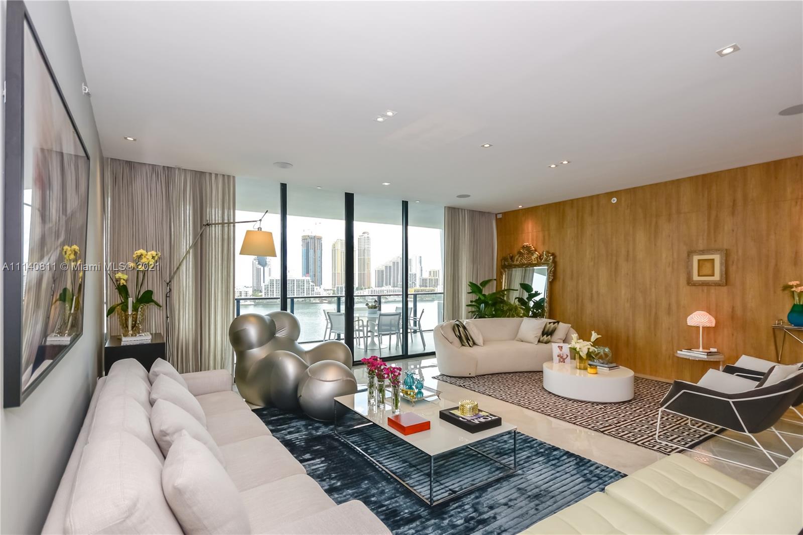 Impressive and unique large unit at PRIVE. A magnificent complex in an 8-acre private island in Aventura. This gorgeous unit features a flow-through lay out w/3 bedrooms + den/4,5 baths & breathtaking views to Bay/Ocean from every window/10’-foot floor -to -ceiling glass windows & deep terraces with barbecue . European grey Italian porcelain 48 x 48 floor, sound system .Has a built storage room, high end custom made walk-in closets,. Private elevator & modern European Kitchen. Amenities include: Gym/Spa, large pool deck with East/West views;2 pools & pool bar service, restaurant/cafe on site; entertainments room, cigar room, wine room, tennis courts, boat dock, children's playground & game room and much more. 3 assigned parking spaces.