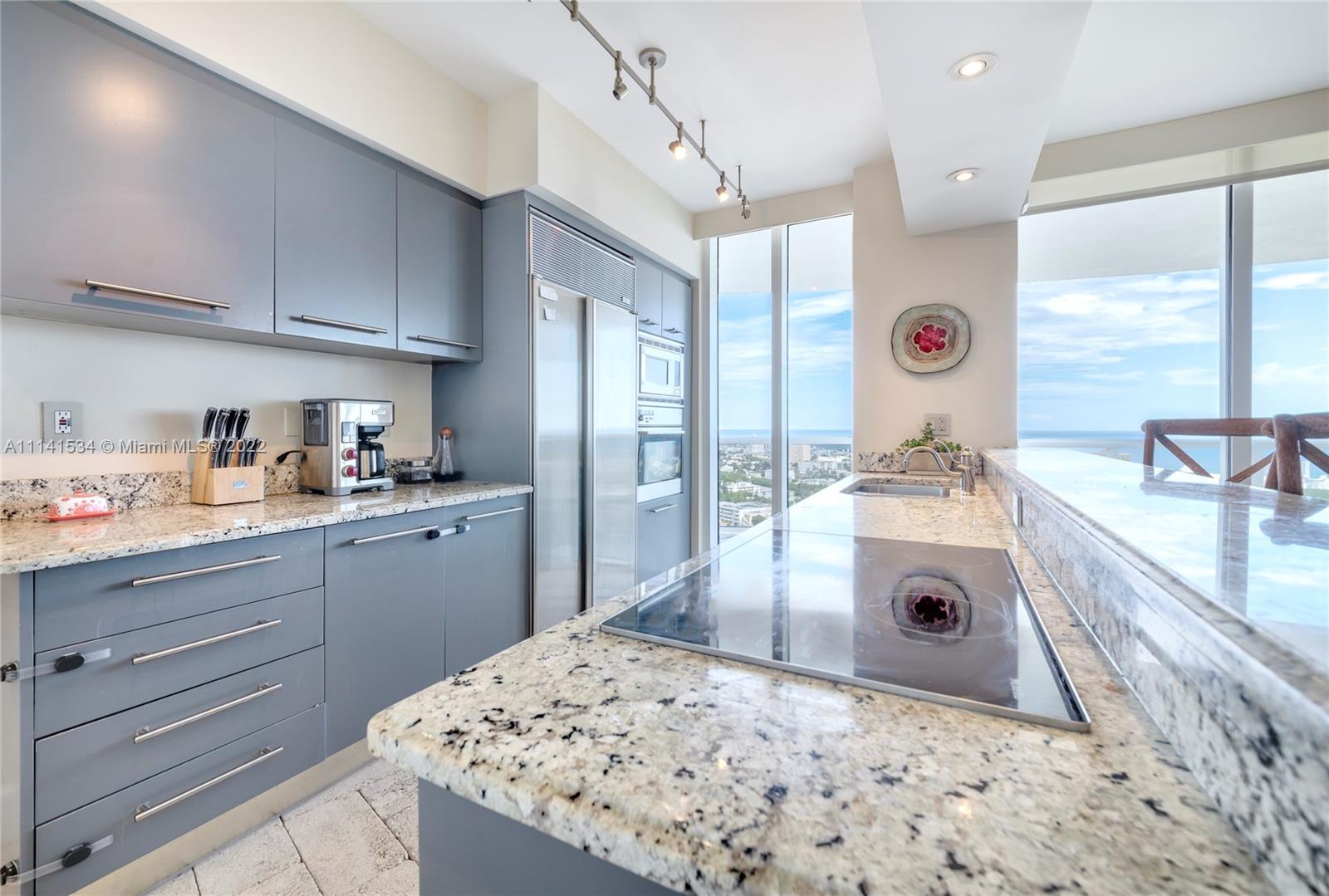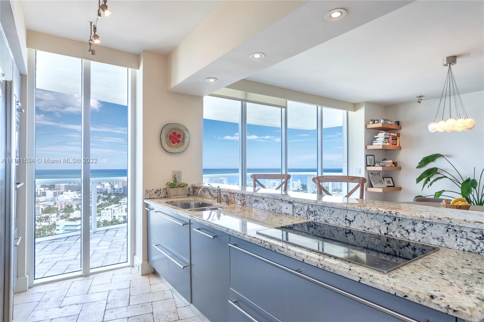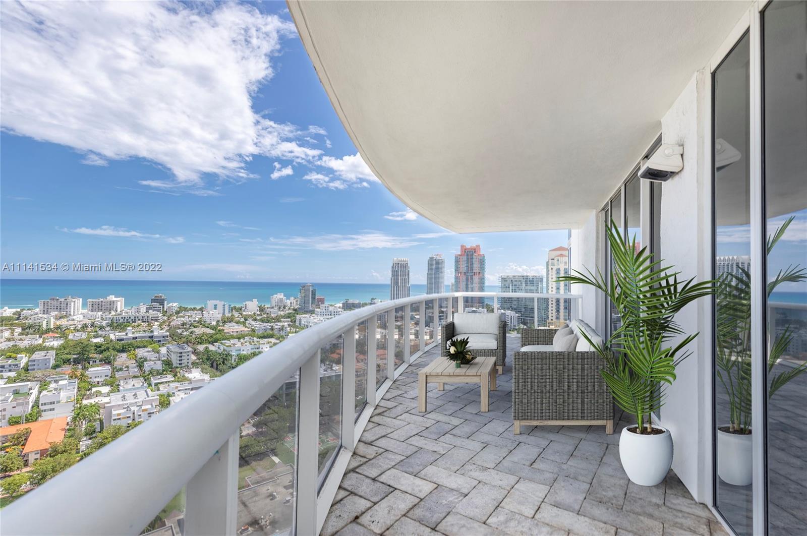 Enjoy lower Penthouse living at South of 5th’s iconic Murano Grande with sweeping 270 degree views of the Atlantic ocean, Miami Beach and Biscayne Bay. This generously laid out 2-bed/2-bath corner offers floor-to ceiling windows throughout, imported limestone flooring and an updated open-kitchen featuring custom cabinetry, granite counters and Miele & Subzero appliances. Unique dual Sunrise and Sunset terraces offer a combined outdoor living space of nearly 500sf. Fitness center, tennis courts, pool with towel service, 24-hour front desk, concierge and valet.