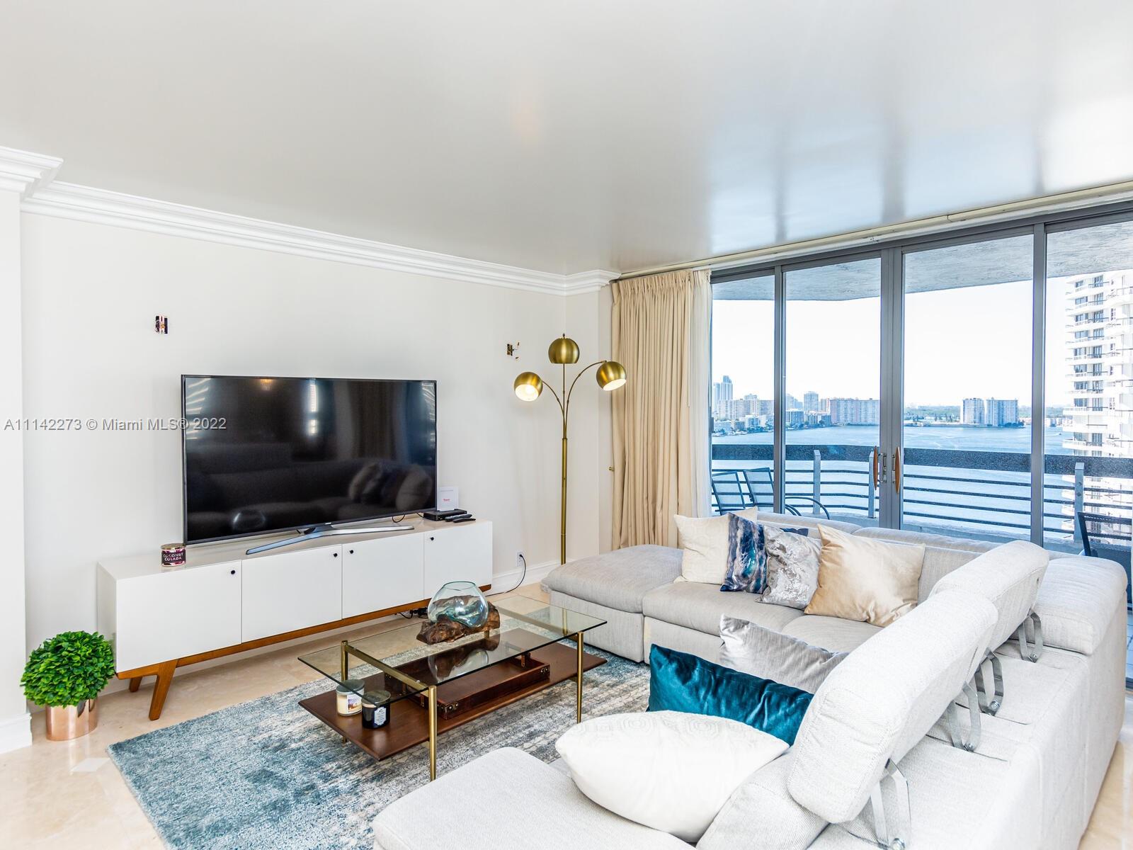 Beautiful large corner unit 2 beds, 2 baths on one of the best lines in Mystic Tower 100, wonderful bay view, over 1,400 SF, tastefully renovated living area featuring modern decor, marble floors, updated kitchen & baths, crown molding, wraparound balcony. resort style amenities, stunning swimming pool, Marina & beautiful grounds. Enjoy luxury living at the Mystic Pointe. Walking distance to the mall and house of worship...