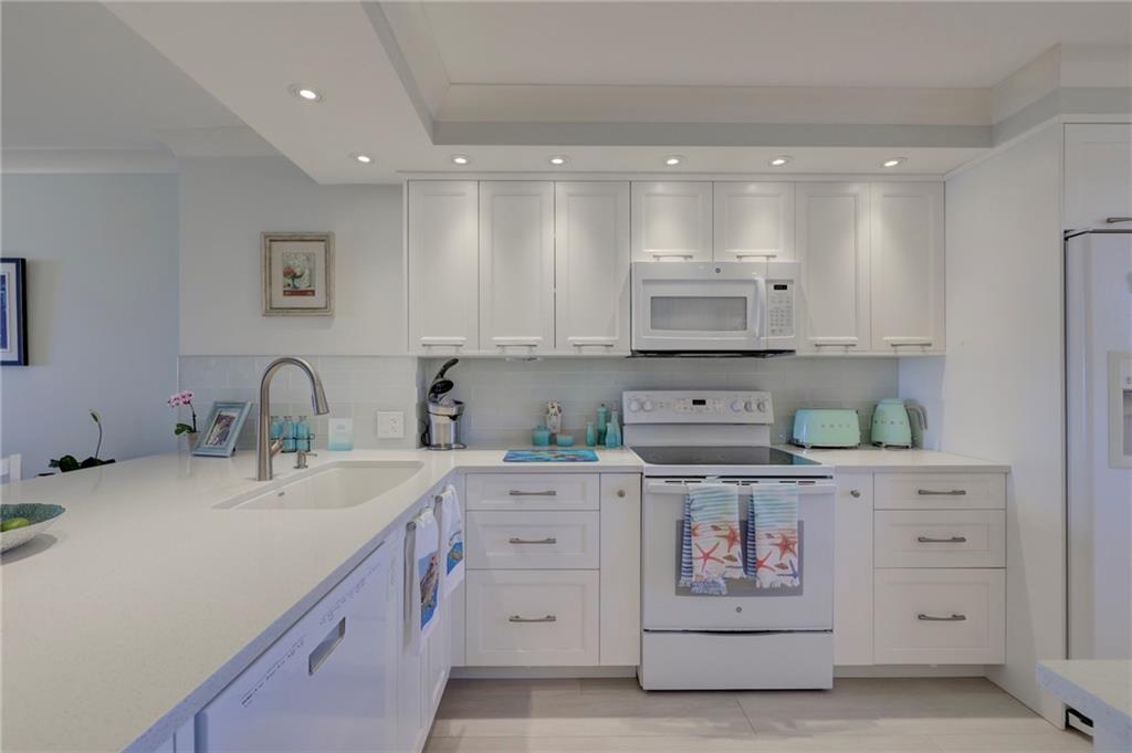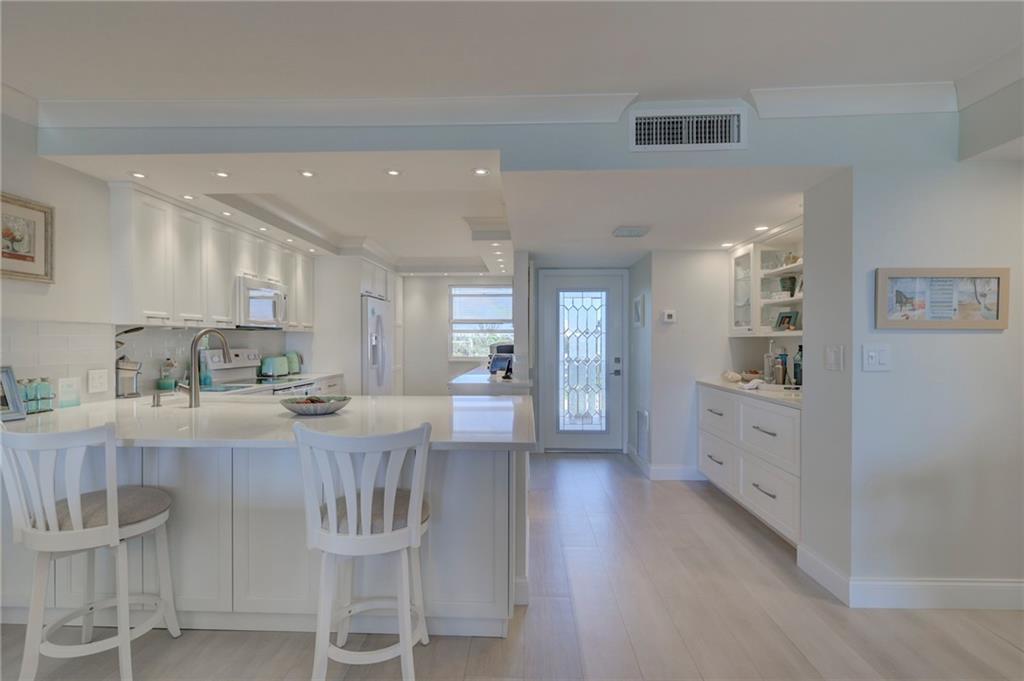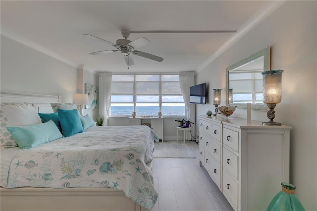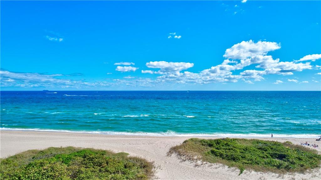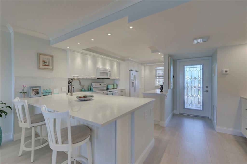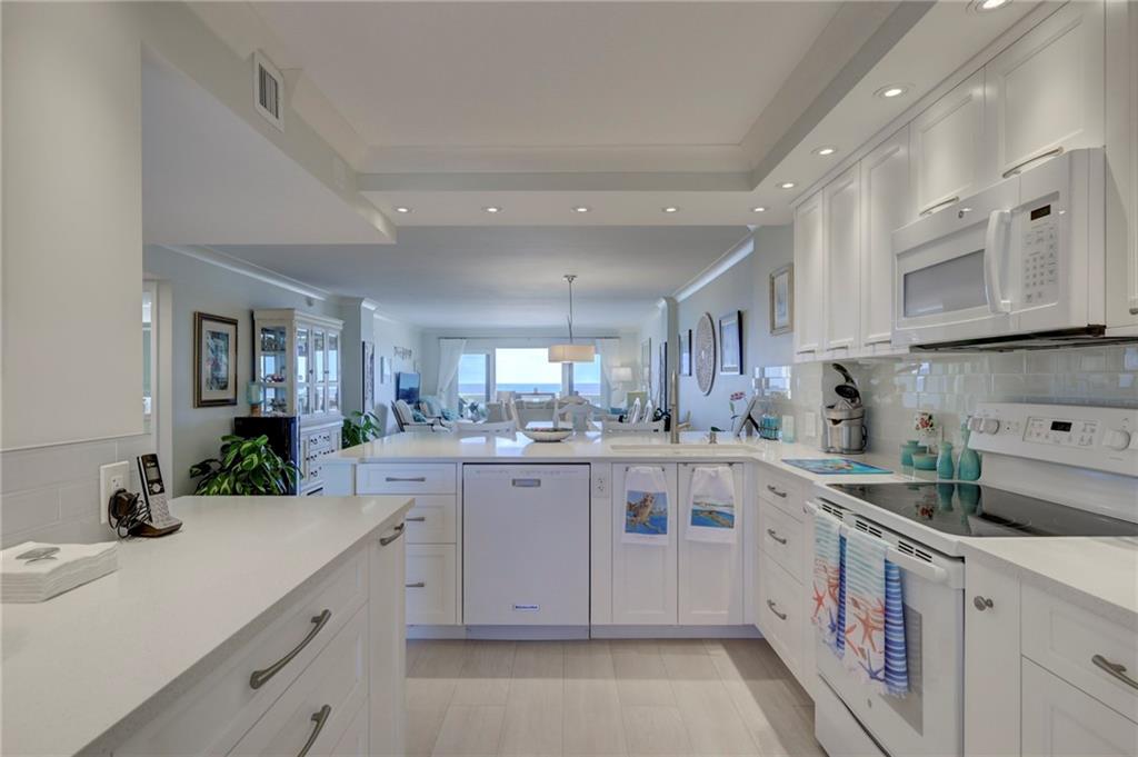 This 4th floor direct ocean unit is stunning! View of the ocean from the kitchen, living room, primary bedroom and the balcony! The owners spared no expense to make this unit paradise! The unit has been completely remodeled with modern light decor, ceiling lighting, mirror lighting in bathrooms, beautiful porcelain tile floors throughout, quartz counter tops and 6in molding and trim. The kitchen maple cabinetry is custom and has more than ample storage in the kitchen AND under the bar! The kitchen layout and bar are perfect for someone that loves to cook and entertain. Washer/Dryer full size stackable in unit tastefully incorporated into the cabinetry so hidden from view. Furniture not included in the Listing price but is negotiable.