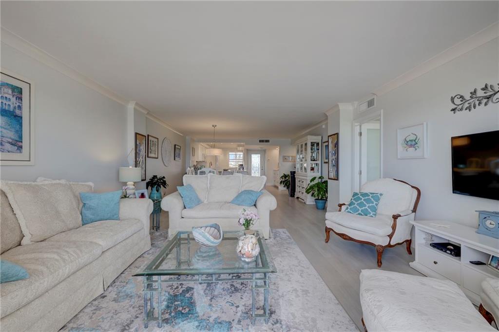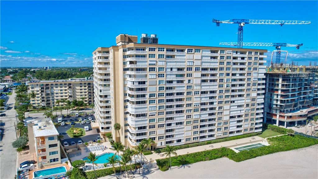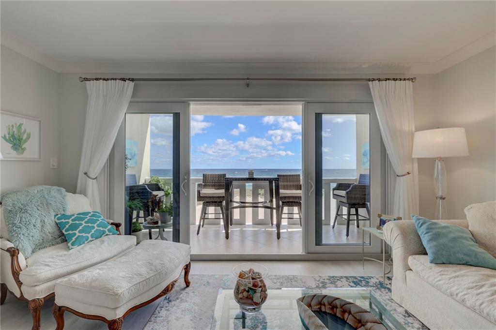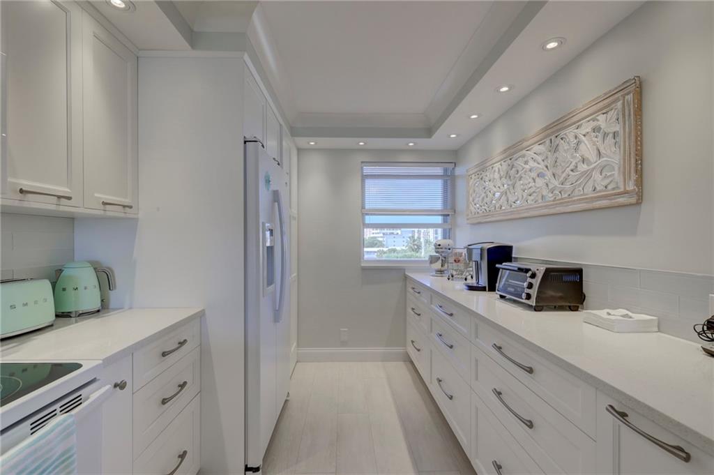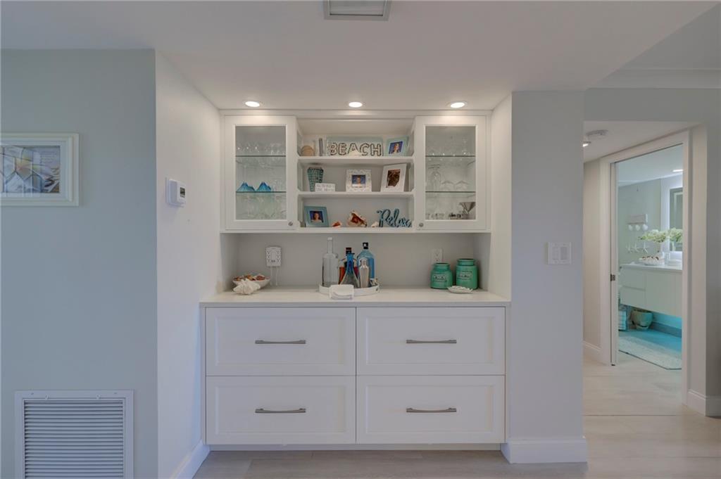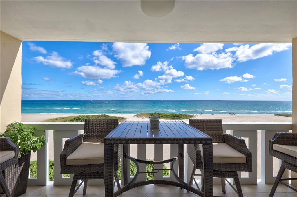 This 4th floor direct ocean unit is stunning! View of the ocean from the kitchen, living room, primary bedroom and the balcony! The owners spared no expense to make this unit paradise! The unit has been completely remodeled with modern light decor, ceiling lighting, mirror lighting in bathrooms, beautiful porcelain tile floors throughout, quartz counter tops and 6in molding and trim. The kitchen maple cabinetry is custom and has more than ample storage in the kitchen AND under the bar! The kitchen layout and bar are perfect for someone that loves to cook and entertain. Washer/Dryer full size stackable in unit tastefully incorporated into the cabinetry so hidden from view. Furniture not included in the Listing price but is negotiable.