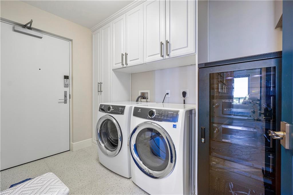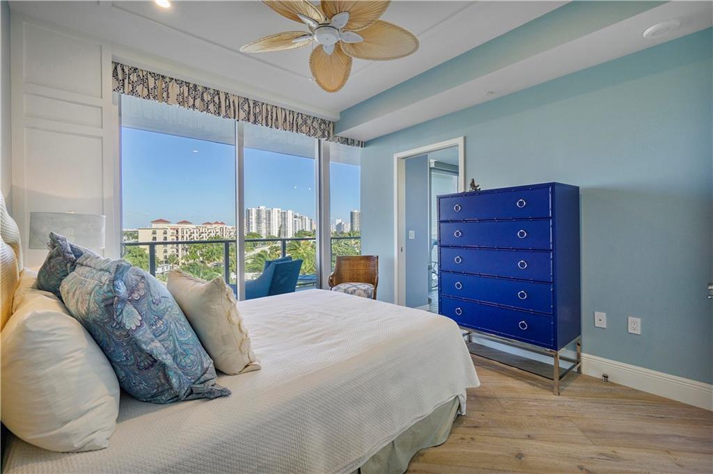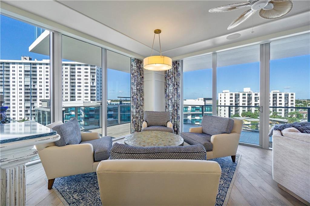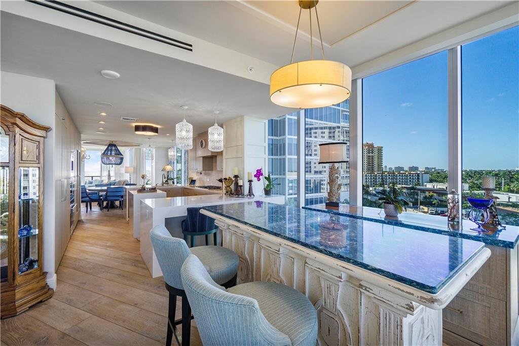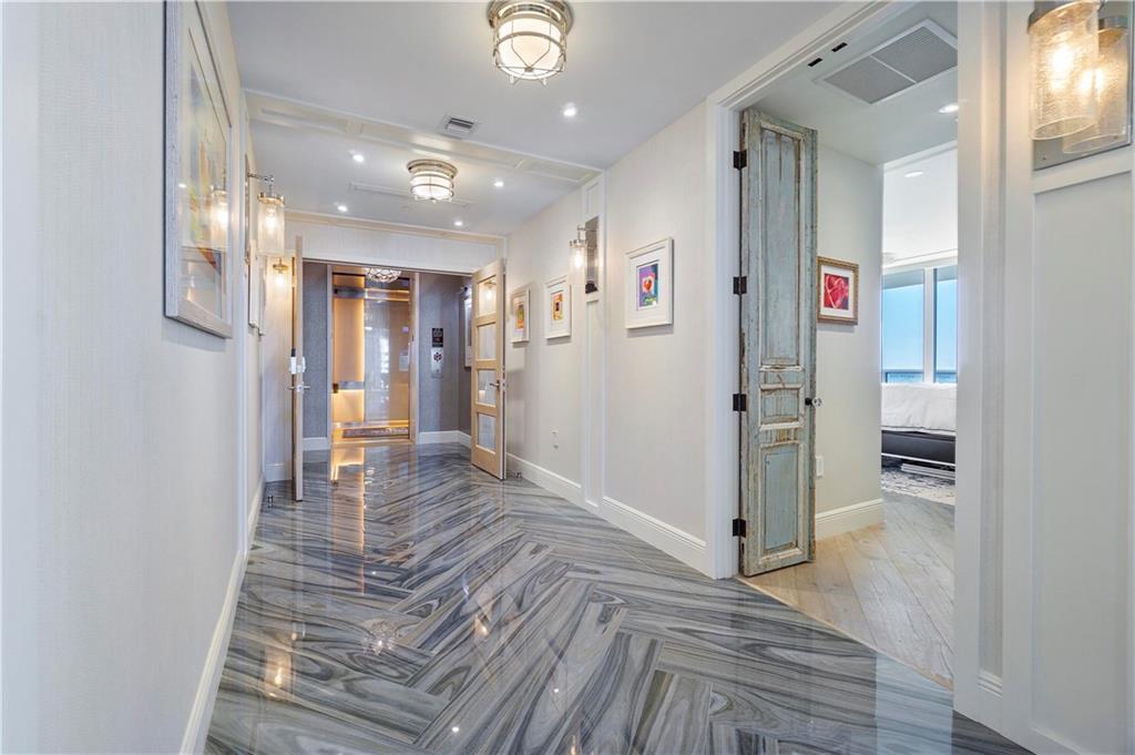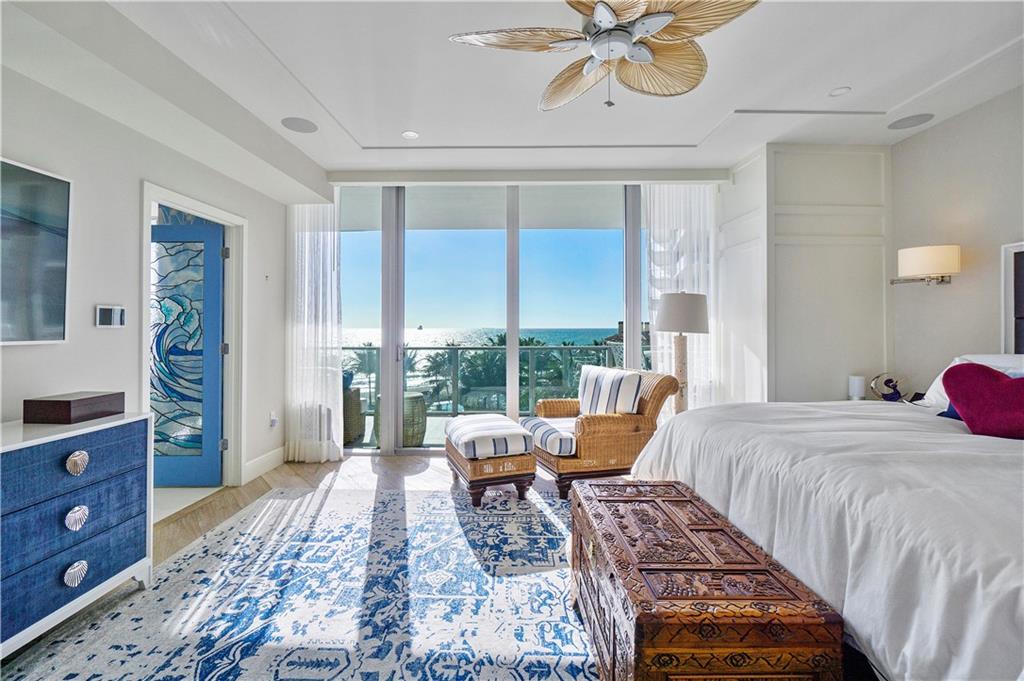 This exquisite corner flow-through floor plan stretches E to W providing direct sunrise ocean views & sunset city views w/an expansive terrace on each end. Enter through a private foyer & capture the stunning blue porcelain herringbone flooring w/a custom art gallery & gorgeous octagonal custom ceiling woodwork in the dining room showcasing the chandelier. This 4 bed (1 was used to expand the media room) & 5 bath residence includes a custom built-in office, a second master built-in walk-in closet w/quartz countertops, & a Den! The unit features a hand-painted tile powder room along w/custom millwork & natural oak flooring throughout. An upgraded Control 4 system is installed & includes complete control of lights, locking, blinds (day/blackout), & security cameras all w/Alexa!