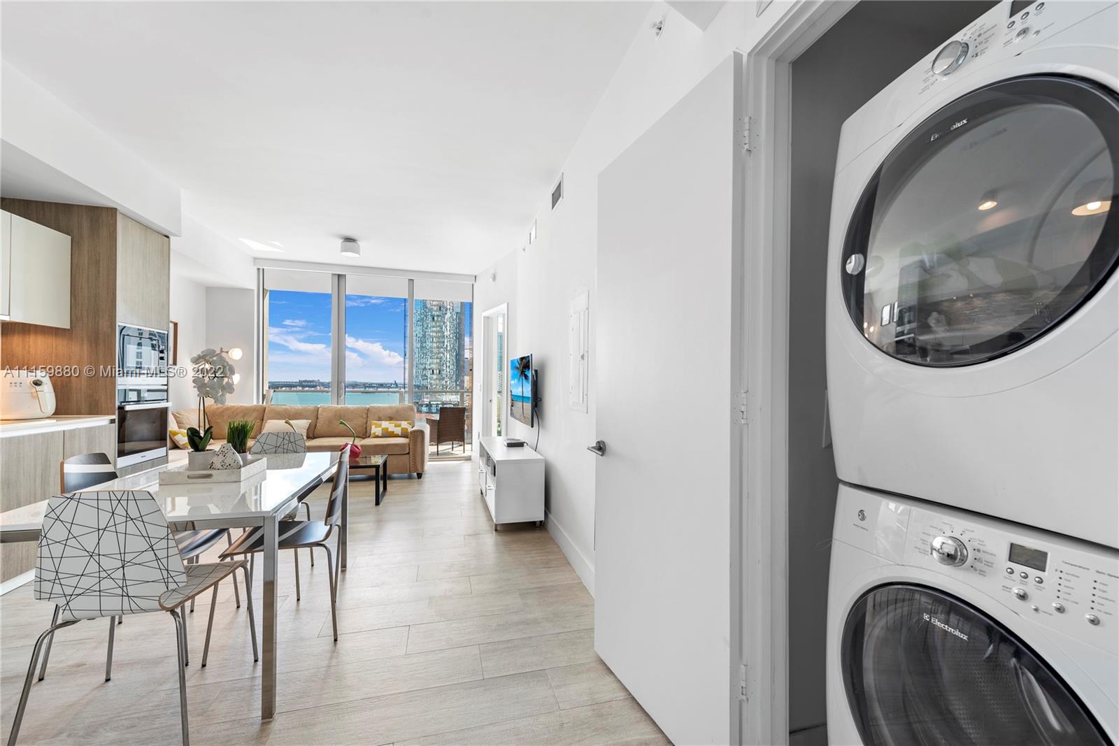 Gorgeously polished 2 BD/2 BA residence (originally 1 BD+den, den converted to 2nd BD) in East Edgewater boasting unobstructed skyline & bay views throughout! Located at Biscayne Beach, a newer construction, luxurious high rise building. This residence has floor-to-ceiling impact windows, a private balcony w/ spectacular views, top-of-the-line Miele appliances, Snaidero cabinetry, spacious living area, open & bright primary suite, primary bath w/ separate tub & shower, dual sinks, & cove lighting, & full sized washer/dryer in the unit! Resort style amenities include: secluded pool deck, beach club w/ towel services & private cabanas, 2 pools, sauna, summer kitchen w/lounge seating areas, 2 tennis courts, fitness center, steam room, blow-dry bar, massage rooms, dog park, restaurant, & more!
