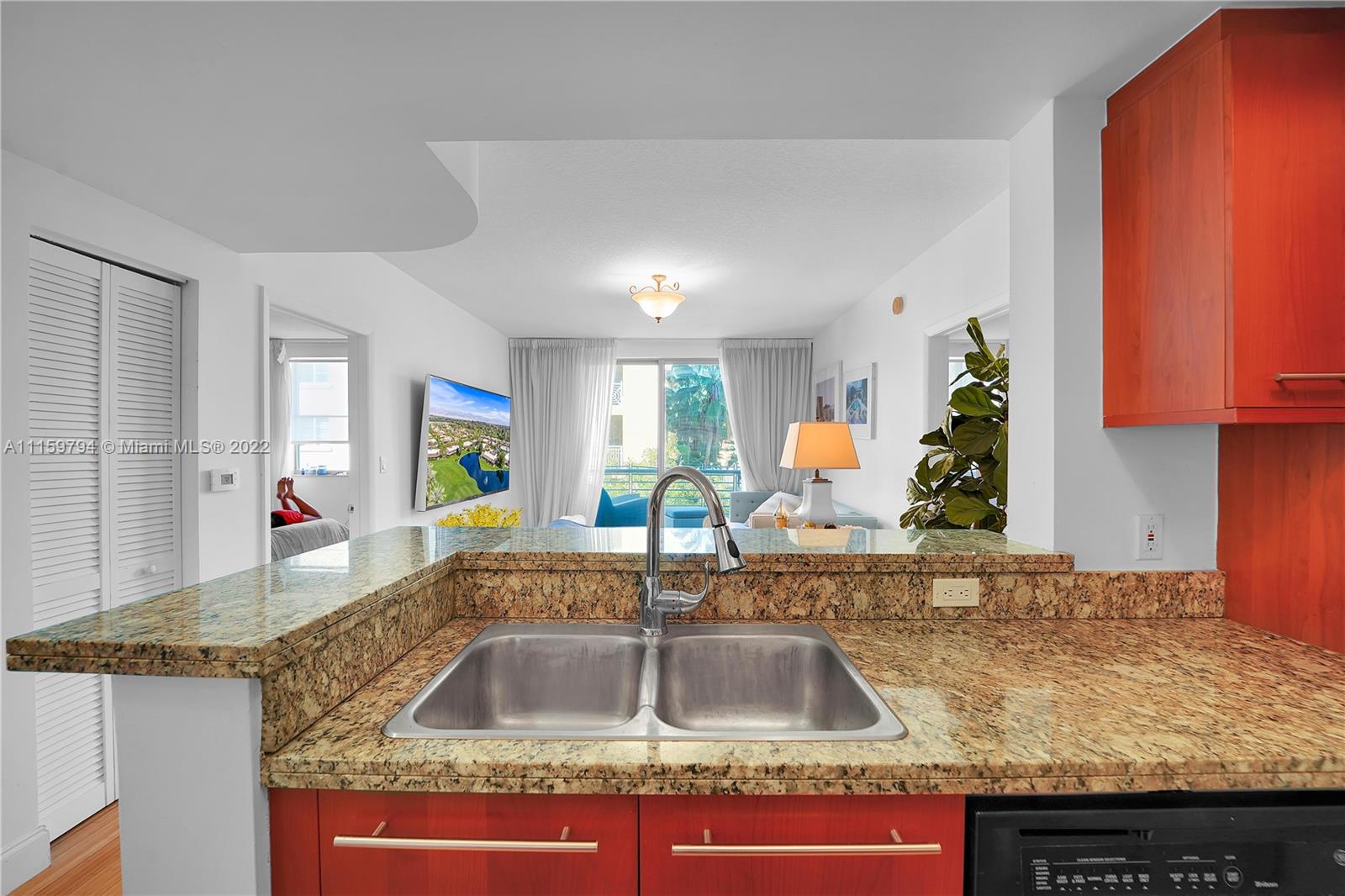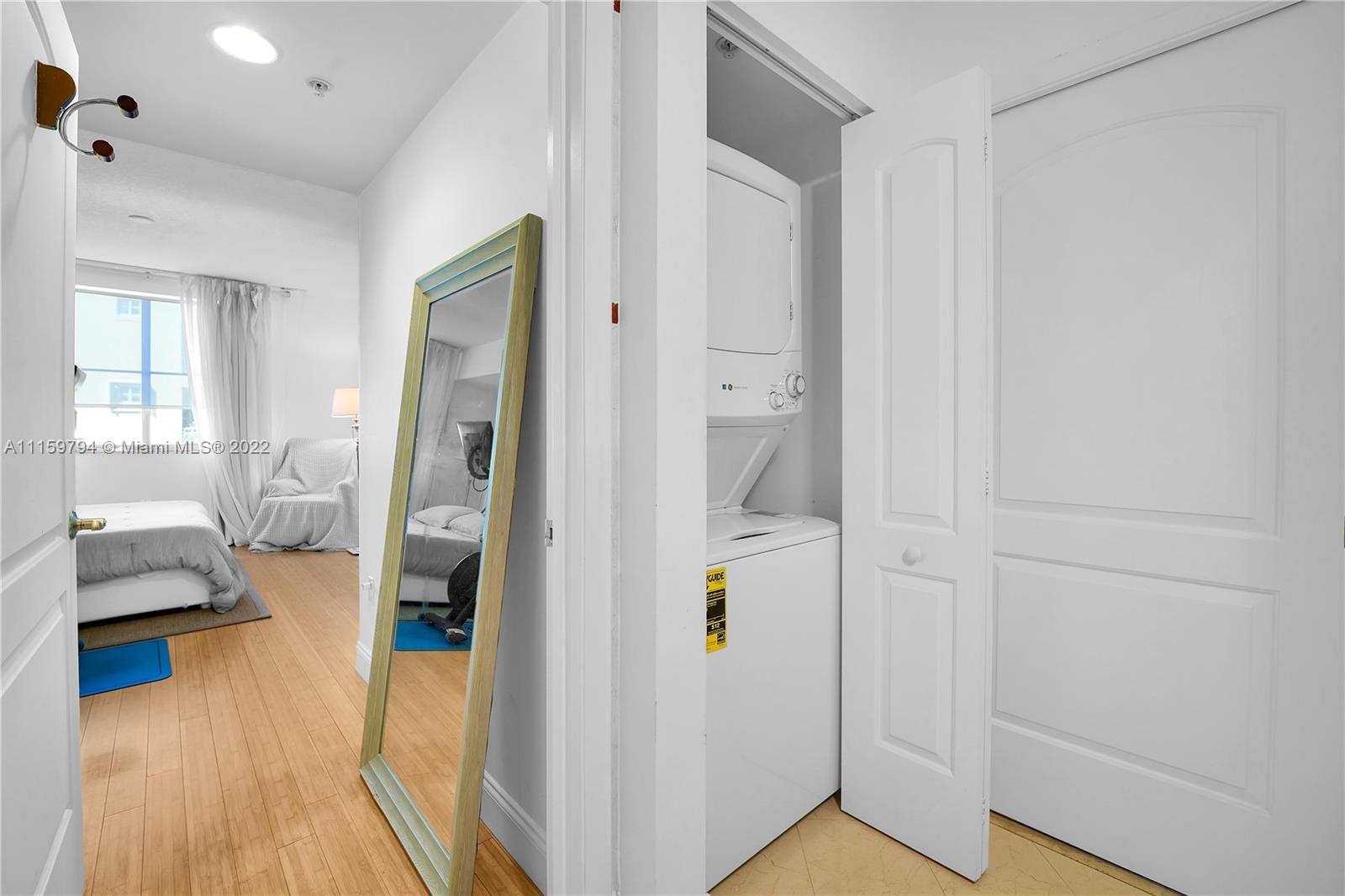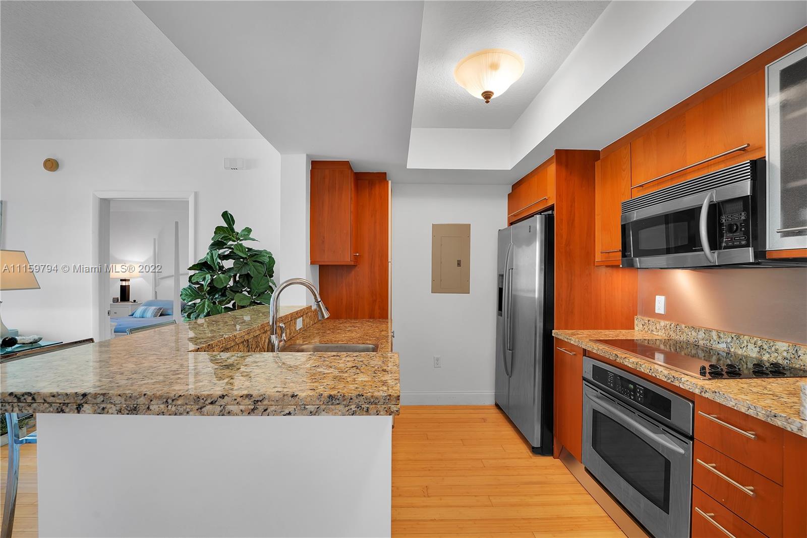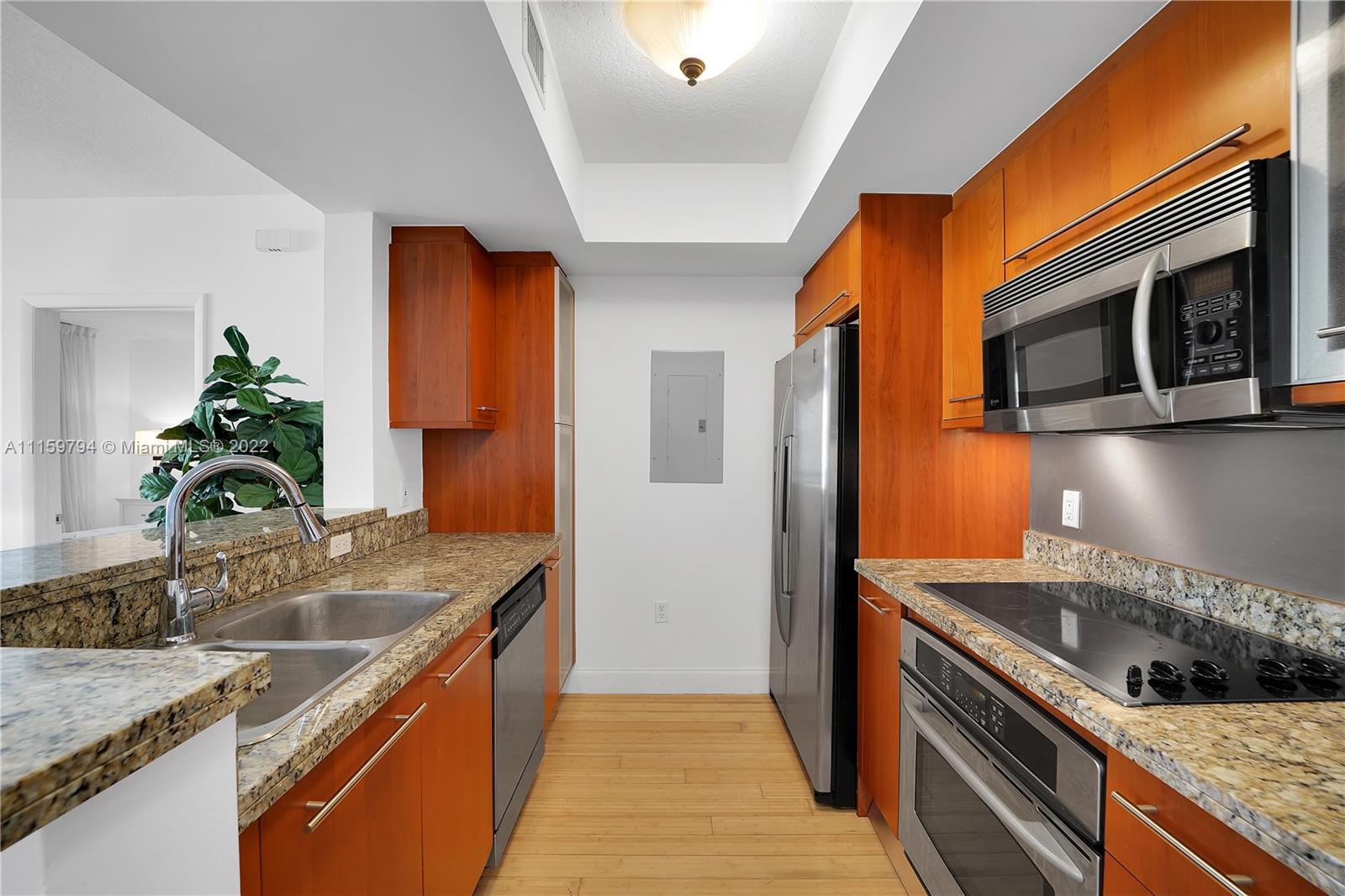 2 Bed/2 Bath, Bamboo floor, granite countertops, stainless steel appliances, new Washer and Dryer and recently replaced A/C unit. 1 Assigned Parking Space. Full Service Building, heated pool, spa, sauna, 24/7 Fitness Center. This unit faces Meridian Ave.