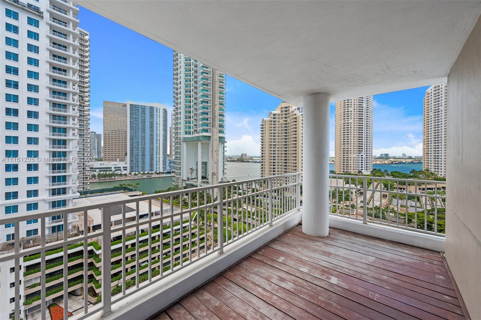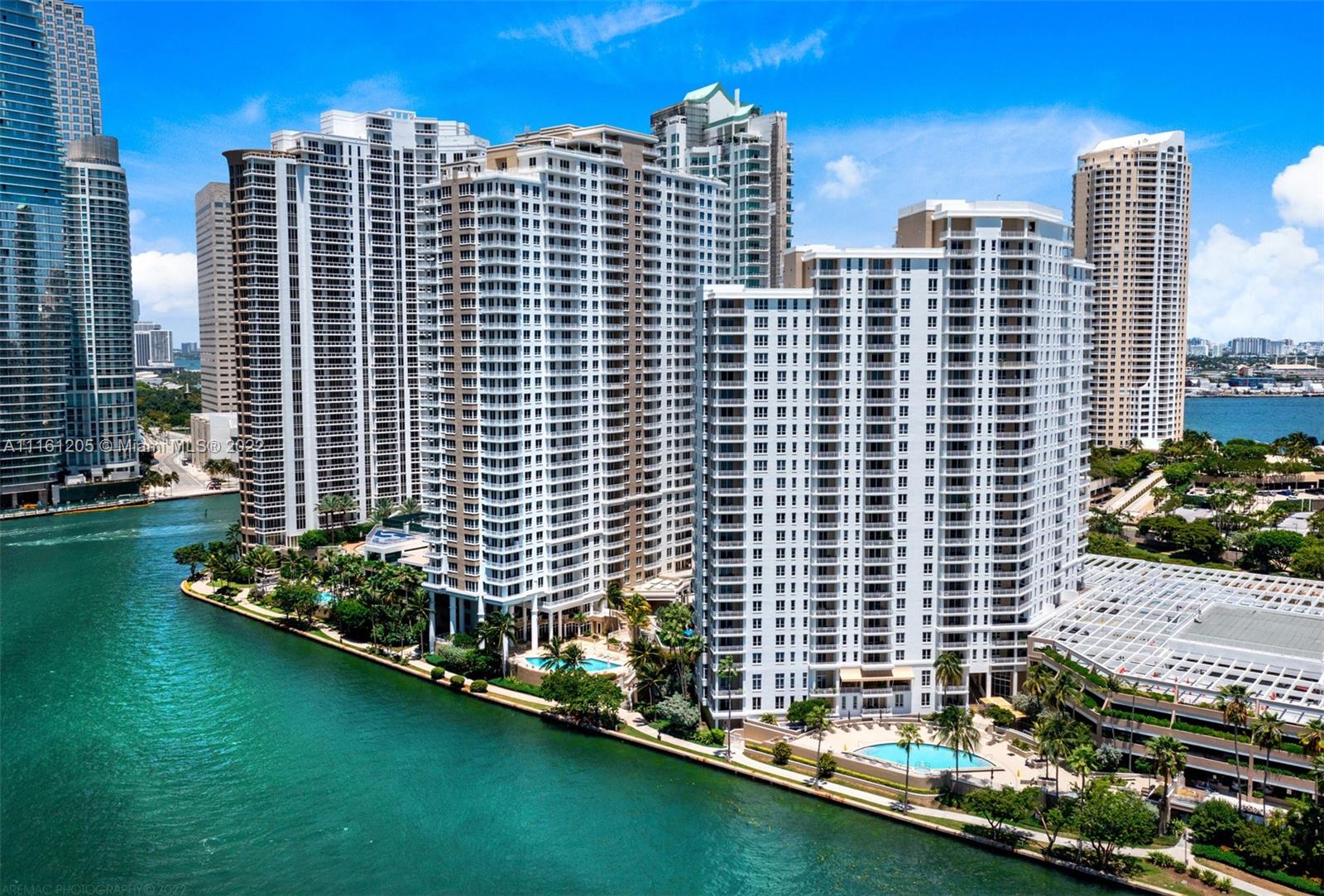 Corner unit located in Brickell Key Island. Bay views from every room. 2 bedrooms, 2 baths and 1/2 bath with hard wood floors and high impact windows and doors. All closets are finished. Sunny East exposure. Resort lifestyle with all amenities and jogging trail around the Island. Live in the heart of Brickell in a tranquil enviroment.