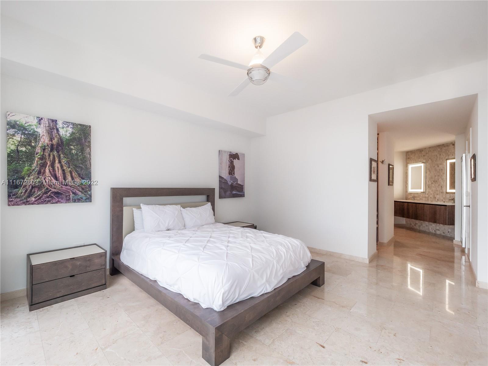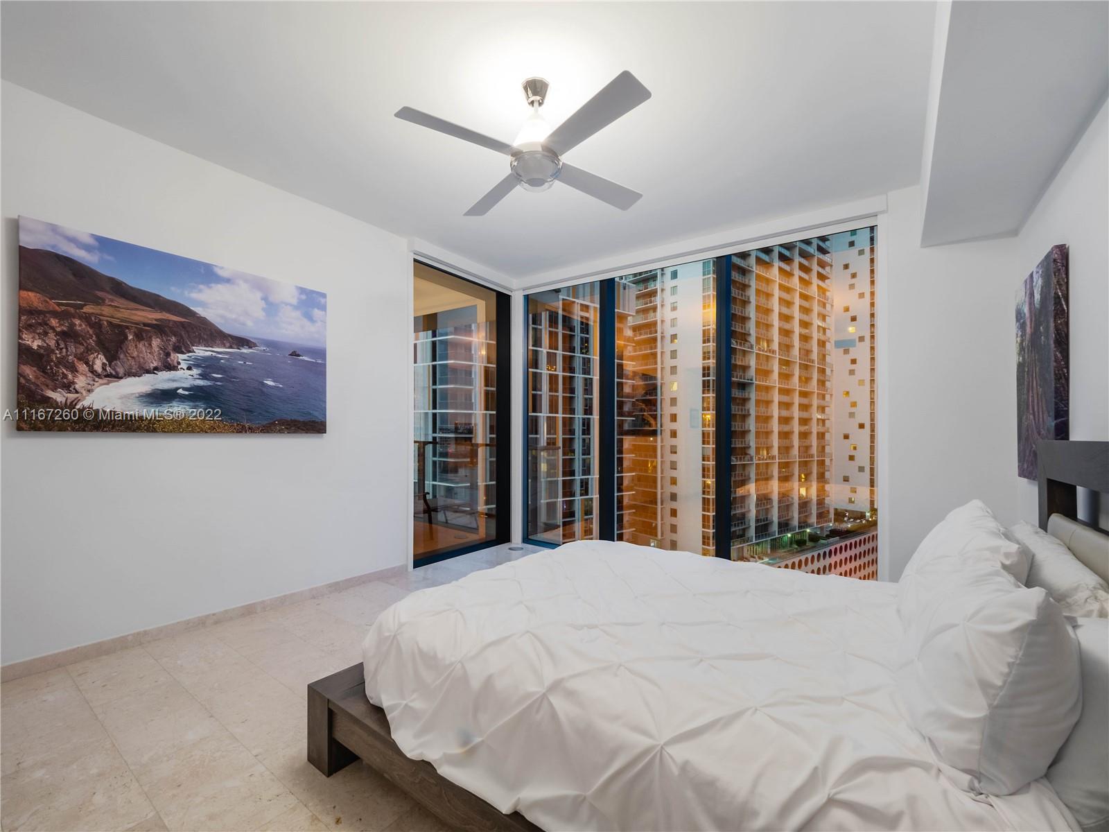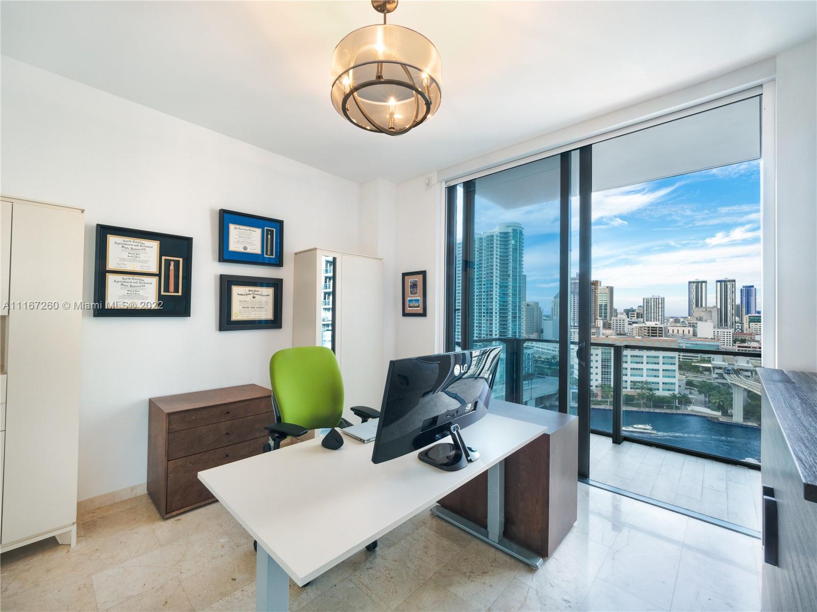 This unit is fully upgraded to give it a more practical and warmer feel. Bar / Wine Cooler station removed from the kitchen to its own stand-alone space using materials from developer with 4 extra cabinets for storage. Kitchen has upgraded cabinets. This Unit features 2 bedrooms with full walk-in closets and in suite bathrooms. The master bathroom features his/hers sinks, shower with custom shelving installed, brand new anti-fog mirrors, roll out shelves in the walk in closet, and remote controlled black out shades. The 2nd bedroom is currently used as an office with space enough for a queen-sized bed and extra linen closets in the bathroom - also equipped with remote controlled black out shades. The living room has automated / remote controlled shades and extra custom lighting throughout.