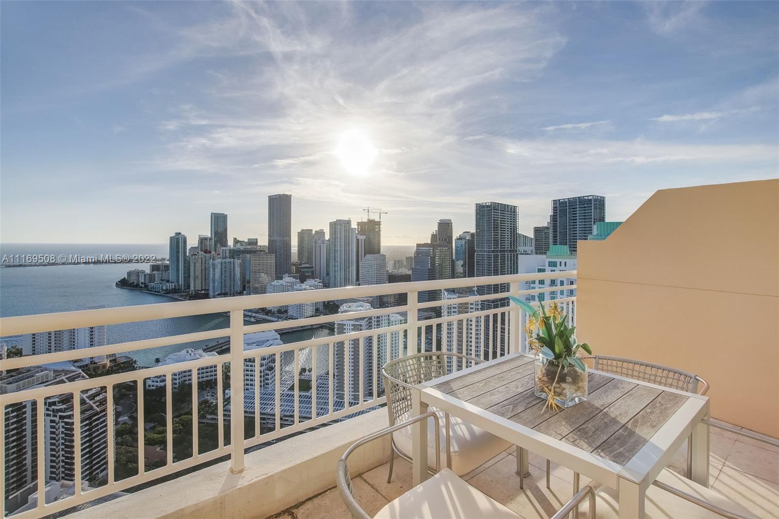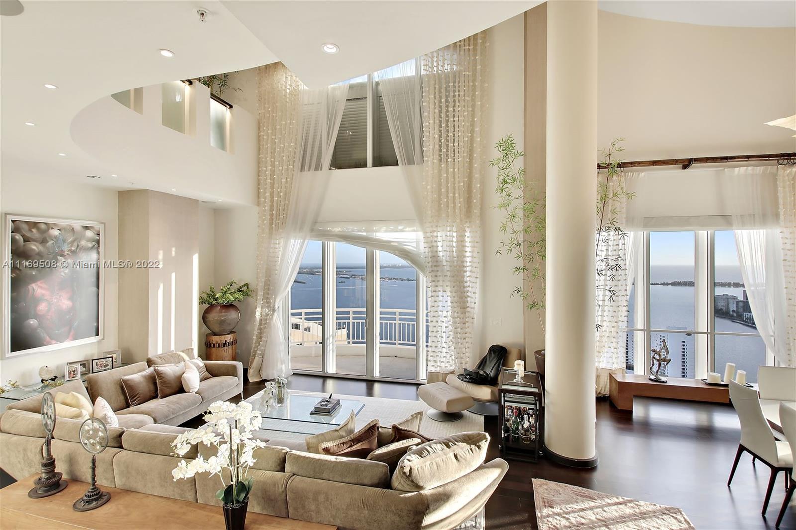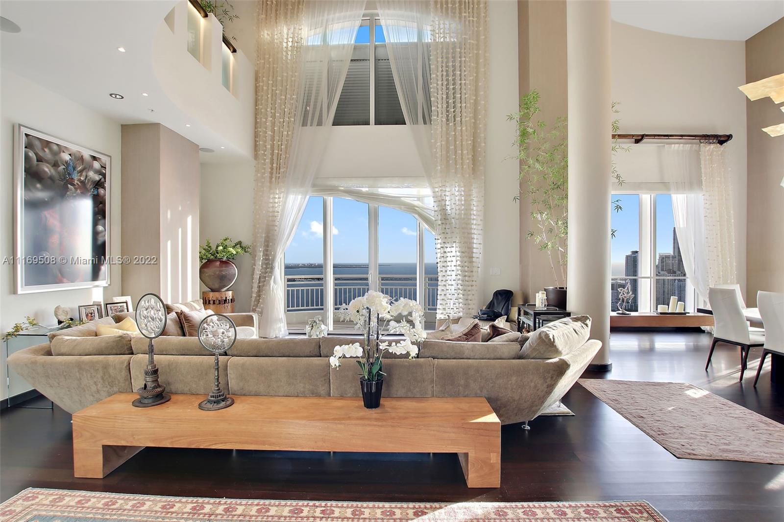 One of a kind offering. Absolutely the best on Brickell Key! This Penthouse is all about breathtaking, unobstructed water and skyline views, stunningly high 40ft ceilings. This unique property features 3 beds/3.5 baths plus office. All wood floors in bedrooms, marble in baths/kitchen. Closed private garage within the parking area with room for more than two cars, extra storage. A true gem! Among the building's amenities you will find pool, 2 level fitness center, BBQ area, tennis court & racquetball court, valet, concierge & much more. Best location within the sought after island of Brickell Key, minutes to the best shopping, dining Miami has to offer while in the quiet Brickell Key
