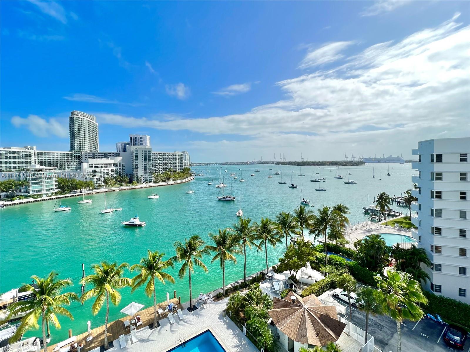 Stunning bay views from this spacious South facing (over 900 sq ft) 1 BD/1.5BA with large balcony. This unit features impact glass windows and door. Enjoy wonderful bay view from living are and balcony. Enjoy all the amenities of this full service building: parking, heated pool, Jacuzzi, BBQ area, tennis, gym, concierge and Valet. Ideal location across from the Standard Hotel. And steps Sunset Harbour & Lincoln Rd dining. 6 min to Downtown. Maint includes A/C, Cable & Internet.