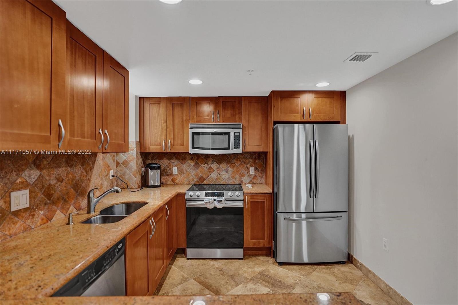 Fantastic 2 Story Townhouse/Condo corner unit at ground level with high ceilings in living room with floor to ceiling windows. 3/3.5 with den including 2 private patio/terraces. 2262 sf of total living area. Spacious, very bright with natural light. Travertine flooring lower level. Kitchen with wood cabinets, ss appliances, granite countertops, marble backsplash. One Suite downstairs plus 1/2 bath. Formal Dining room w/ crown molding. Amenities include, pool, spa, gym, movie room, business/conference room, social room, jogging tracks next to the tennis course located on . 24hrs valet services/concierge, guard at the gate. Great location, close to beaches, fine dining, shopping, Aventura, Gulfstream and so much more.