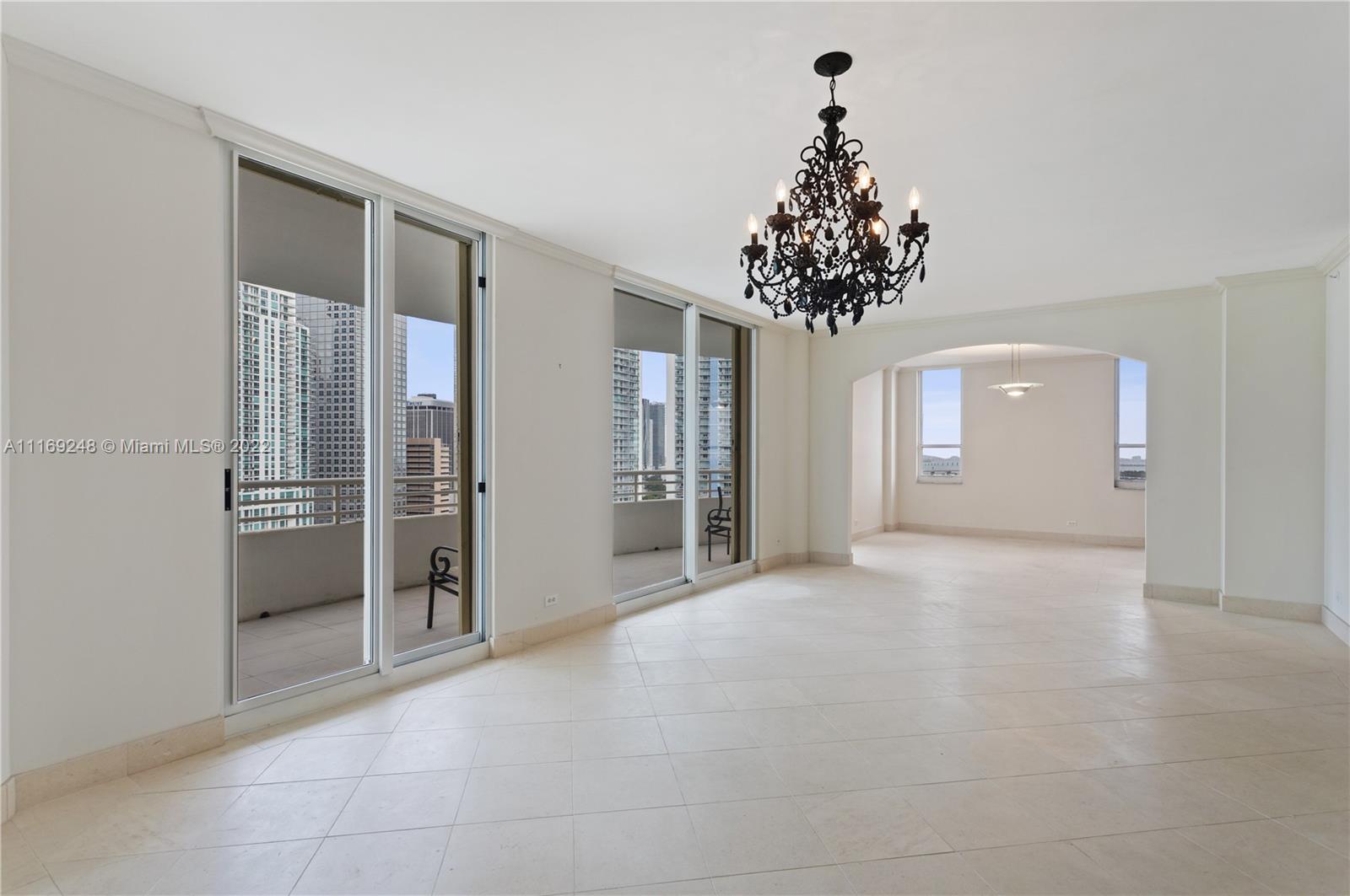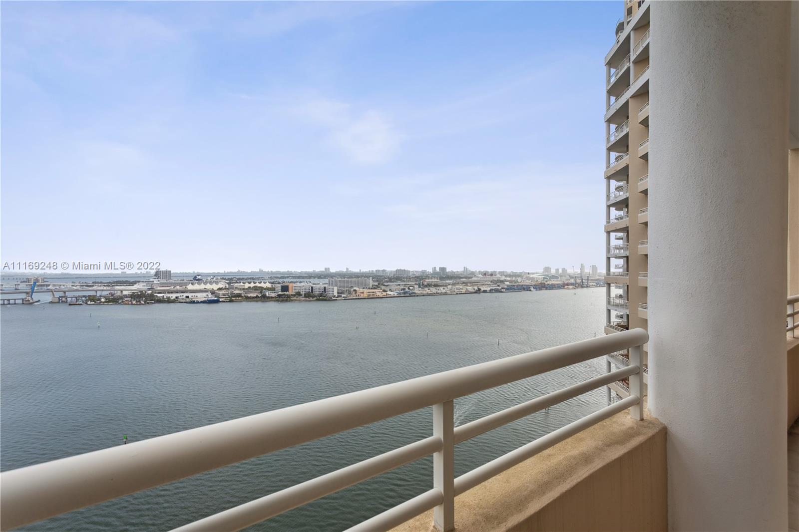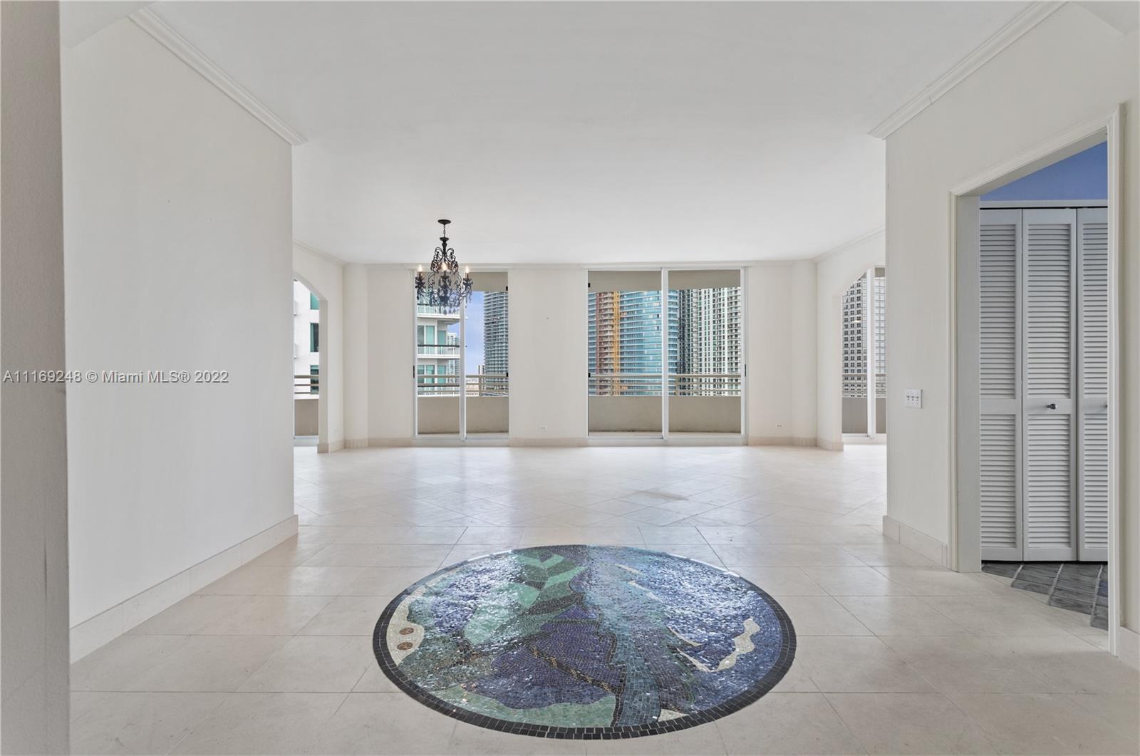 Gorgeous 3 bedrooms, 3 bathroom unit with panoramic ocean and city views! One of a kind ! One Tequesta point. Split floor plan. Spacious living and dining area. International artist designed custom mosaic entry. Great size eat in kitchen with balcony. Three en-suite bedrooms with walk in closets. Two bedrooms with access to balconies. Owner has converted unit to 2 bedrooms and an office/ den but, it can be easily restored to 3 bedrooms. 2 assigned indoor parking spaces. Full service pet friendly building, including a 24-hour security, pool, spa, racquetball, fitness center, & much more. Additionally, Brickell Key offers, recreational parks, a 1 mile strolling path that surrounds the island, and high-end restaurants and local markets.