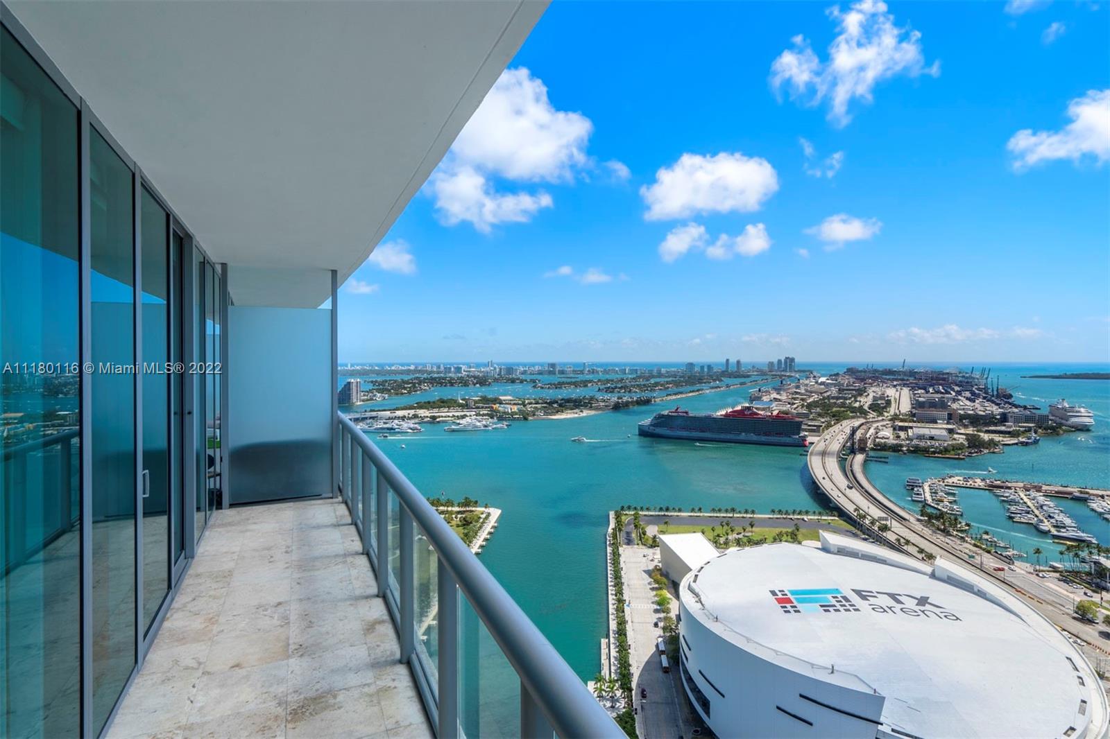 Situated on the 45th floor, this 1,089 Total Sq. Ft. modern condominium with light-filled living areas has the most beautiful views of Biscayne Bay and downtown Miami. The open floor plan features Brazilian teak wood floors, floor-to-ceiling high impact windows and doors, and a well-designed kitchen with travertine countertops. The bedroom features a spa-like bath, walk-in closet with built-ins and a balcony that frames the gorgeous view. Stellar amenities include sunrise and sunset pools, 2 hot tubs, 24-hour security and concierge, valet parking, gym, club room, golf putting green and a sand volley-ball court. Includes 1 assigned parking space. Uniquely positioned close to the American Airlines Arena, the Shops at Bayside and the Carnival Center for the Performing Arts.