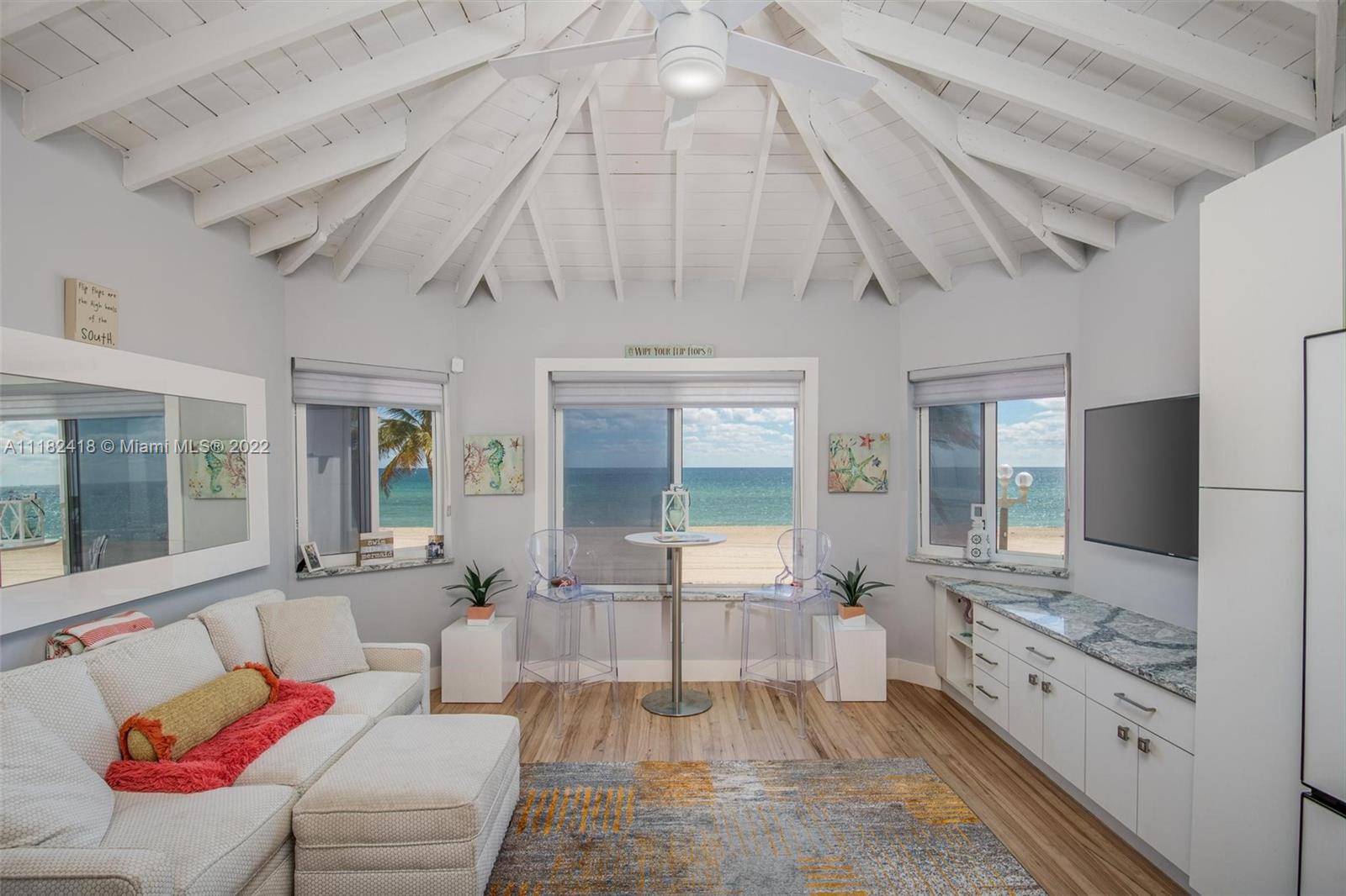 This rarely available corner unit in boutique 7-unit building along the Hollywood Beach Broadwalk, is the perfect beach getaway. From the second you step through the front door you’re mesmerized by the ocean views. No detail has been overlooked in this professionally decorated 1 bed/1 bath condo. Vaulted wood finished ceiling. Wood and tile flooring. Impact glass throughout. Washer/Dryer. Updated summer kitchen for the common area. Reserved parking. You can rent 3 times a year with one month minimum.