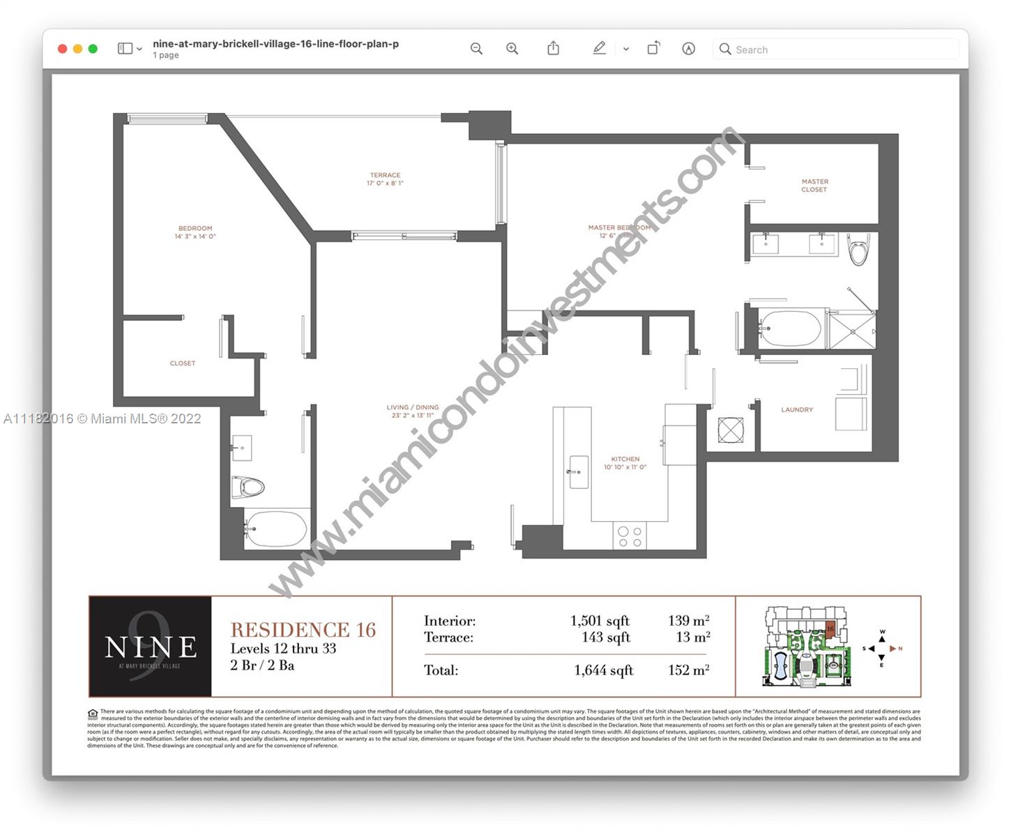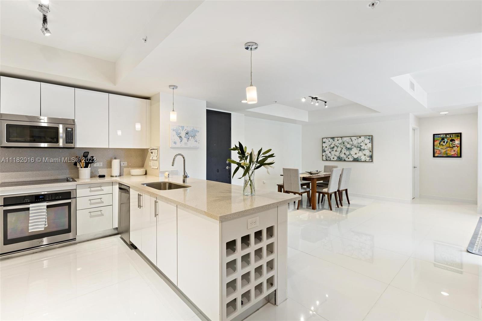 This is the epitome of city living, this two-bedroom unit offers 1,384 square feet of living area at the impeccable NINE building at Mary Brickell Village. This spacious apartment offers recently remodeled white porcelain tile flooring from PORCELANOSA (36 x 36 inches) and built California closets. The split floor plan offers a built-in work area adjacent to the kitchen and a private laundry room. The master bedroom offers a large walk-in closet and ample master bath. The NINE has it all, with fabulous amenities located on the 11th floor including a rooftop pool, bbq, child playground, library, private party room, game room, and a full gym. Located above Publix and across from the Metrorail station, just a few blocks from Brickell City Centre and some of Miami's finest restaurants.