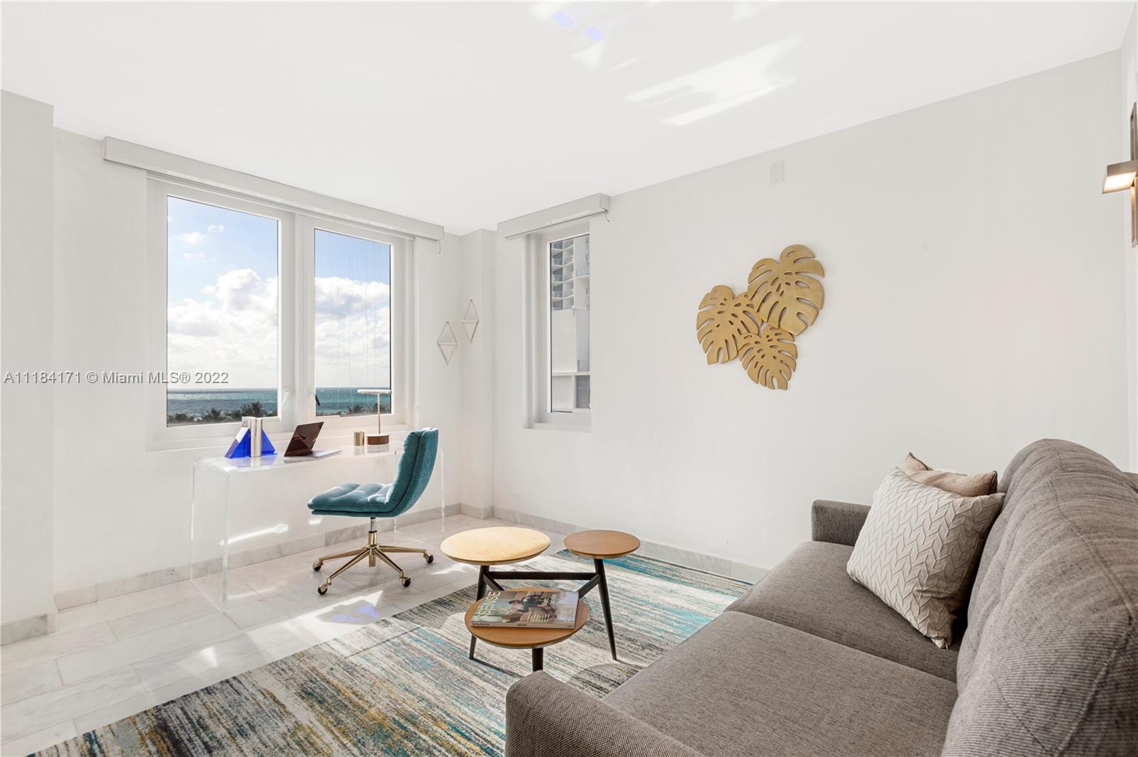 Enter and be immediately greeted by the blues of the Atlantic Ocean. This renovated 900SF corner unit offers direct ocean views, and boasts natural light and calming breezes. Featuring marble floors, recessed lighting, powered black-out shades, in-unit washer/dryer, a den / second bedroom, ample storage, and a spacious balcony, this residence comes beautifully furnished and turnkey. The property's hallways, unit doors and elevators have been elevated to the standards of the adjacent 1 Hotel, and the valet and lobby areas are next. Short-term rentals are allowed at the Roney Palace, making this a desirable and profitable investment! Located just blocks from Lincoln Road and short rides to Miami Design District, Wynwood, Downtown Miami and international airports. Brokers: see 3D tour!