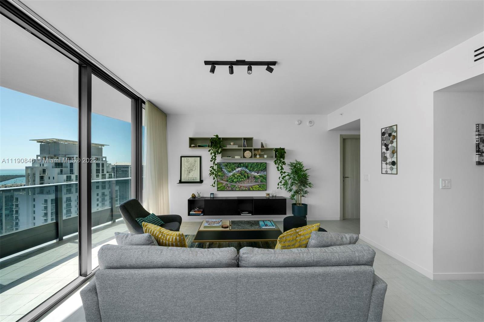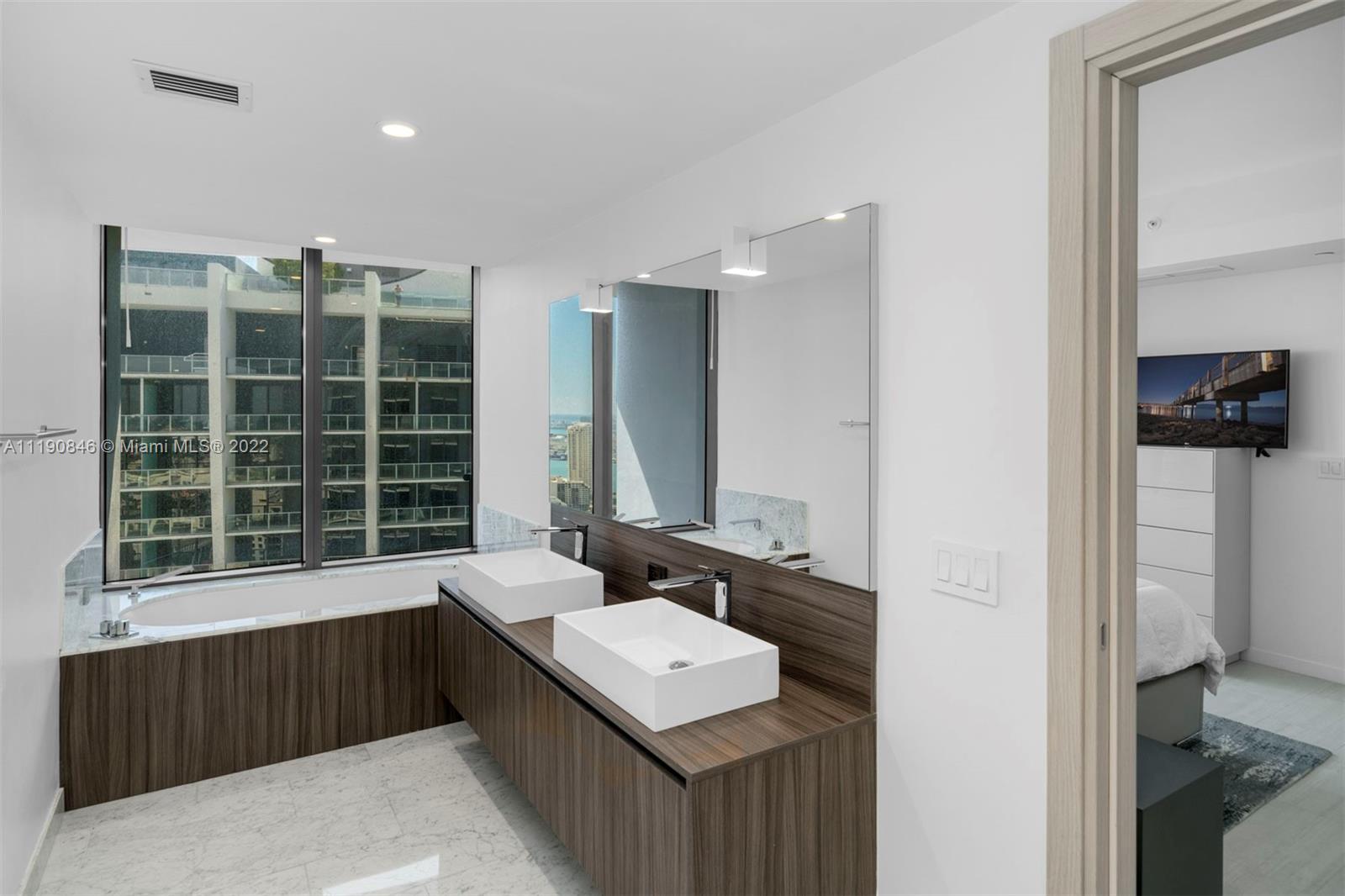 Located in the heart of Brickell, this contemporary and luxurious 2-bedroom, 2.5-bath condo is a must-see! Inside the open layout, walls of glass frame water views and fill every corner with sunlight. Custom wallpaper and upgraded light fixtures lend a sophisticated feel to the main gathering areas. Kitchen features include high-end Miele appliances, Snaidero cabinets, a peninsula with seating, and a large pantry with built-in storage. Electric blinds provide privacy when you retire to your bedrooms and custom closets offer plentiful storage. Marble is on display in the primary bedroom with a walk-in rainfall shower. Building has premium amenities with two pool decks, 64th floor gym and spa.