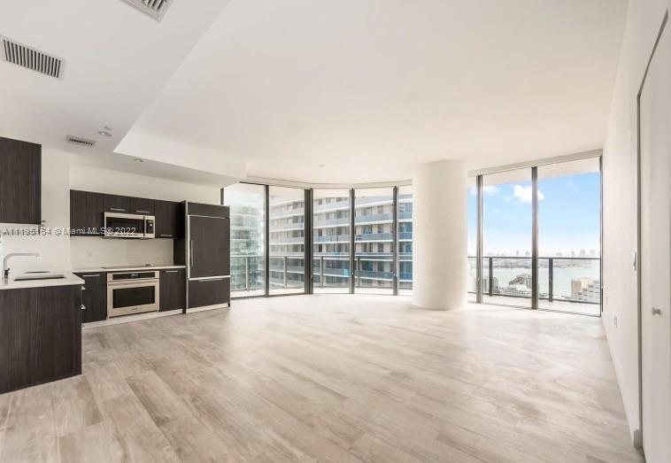 Breathtaking views from every room! Highly coveted corner unit with ensuite bathrooms on a high floor. 3 full master suites plus guest half bath and a separate den/office area.This luxury unit features a huge wraparound balcony with skyline, river and ocean views. Wood-tile floors, floor to ceiling windows and high-quality appliances together with the round architecture add to the luxury touch. This building boasts two floors of amenities including a rooftop pool, lab pool, spa, business and clubrooms, gym, kidsroom and a private cinema. Directly next to the shops at Mary Brickell Village & Brickell City Centre.