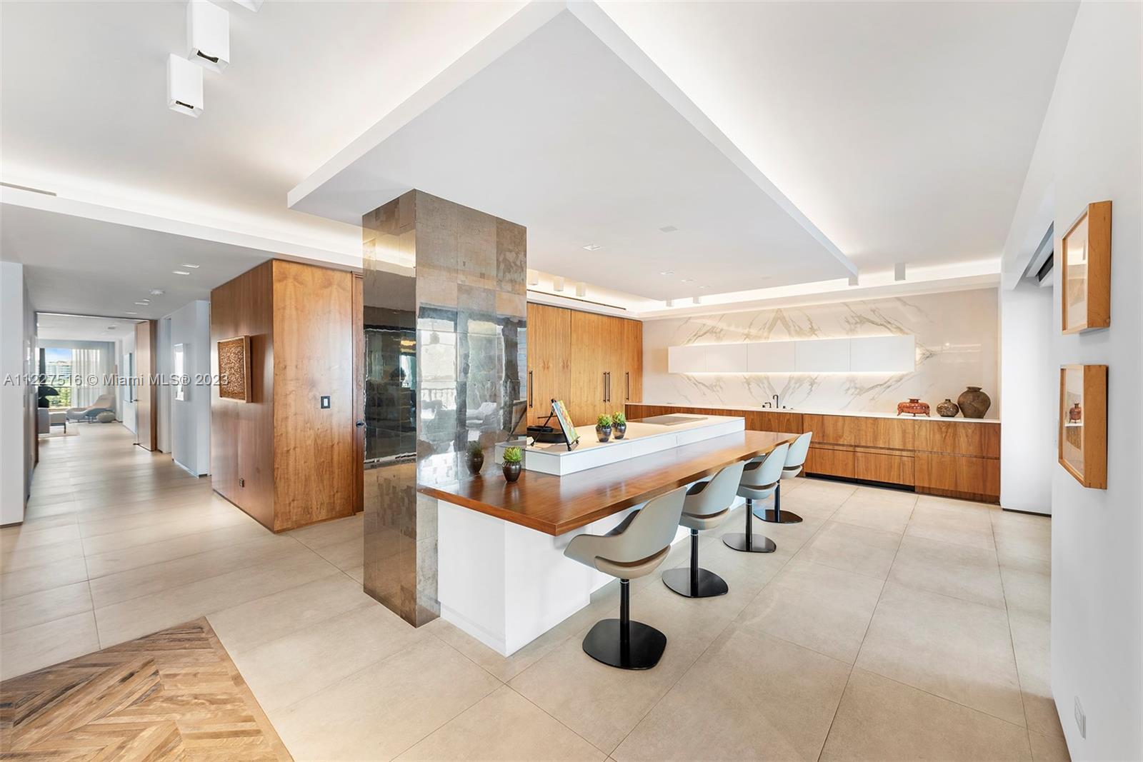 This masterfully crafted unit was been completely renovated and reconfigured into an open-plan, designed and decorated by creative director Sofia Joelsson. This flow-through unit overlooks the Atlantic Ocean, Biscayne Bay and Downtown Miami , it encompasses expansive terraces perfect for entertaining and other outdoor activities. The inspiration for the project was a modern vibe with a focus on art with approximately 6,000 sq ft living area, 4 bedrooms + theater, 4.5 baths, porcelain concrete style floors, open kitchen with postcard views of the Miami Skyline, plus a custom walnut wet bar, wine coolers. fully furnished, principal suite looking straight east for the perfect sunrise and has one of kind master bathroom. Live the Fisher Island lifestyle in this exceptional offering!