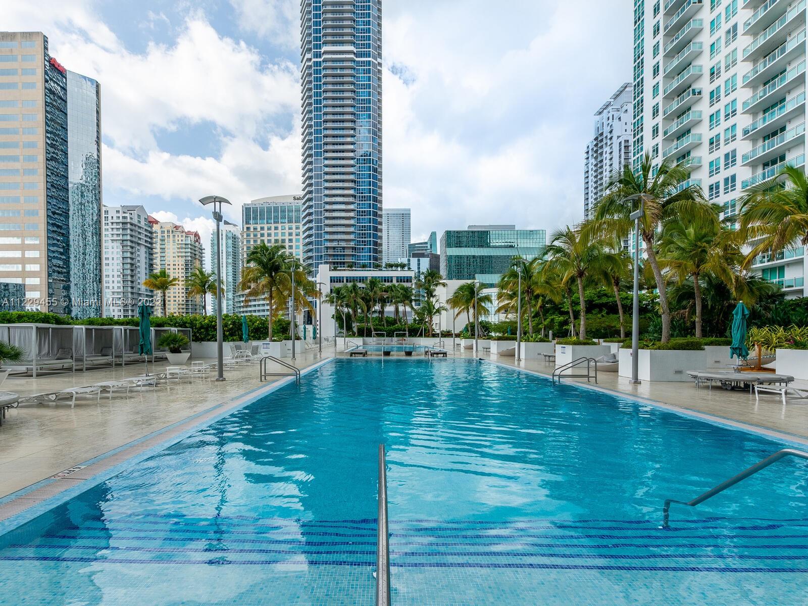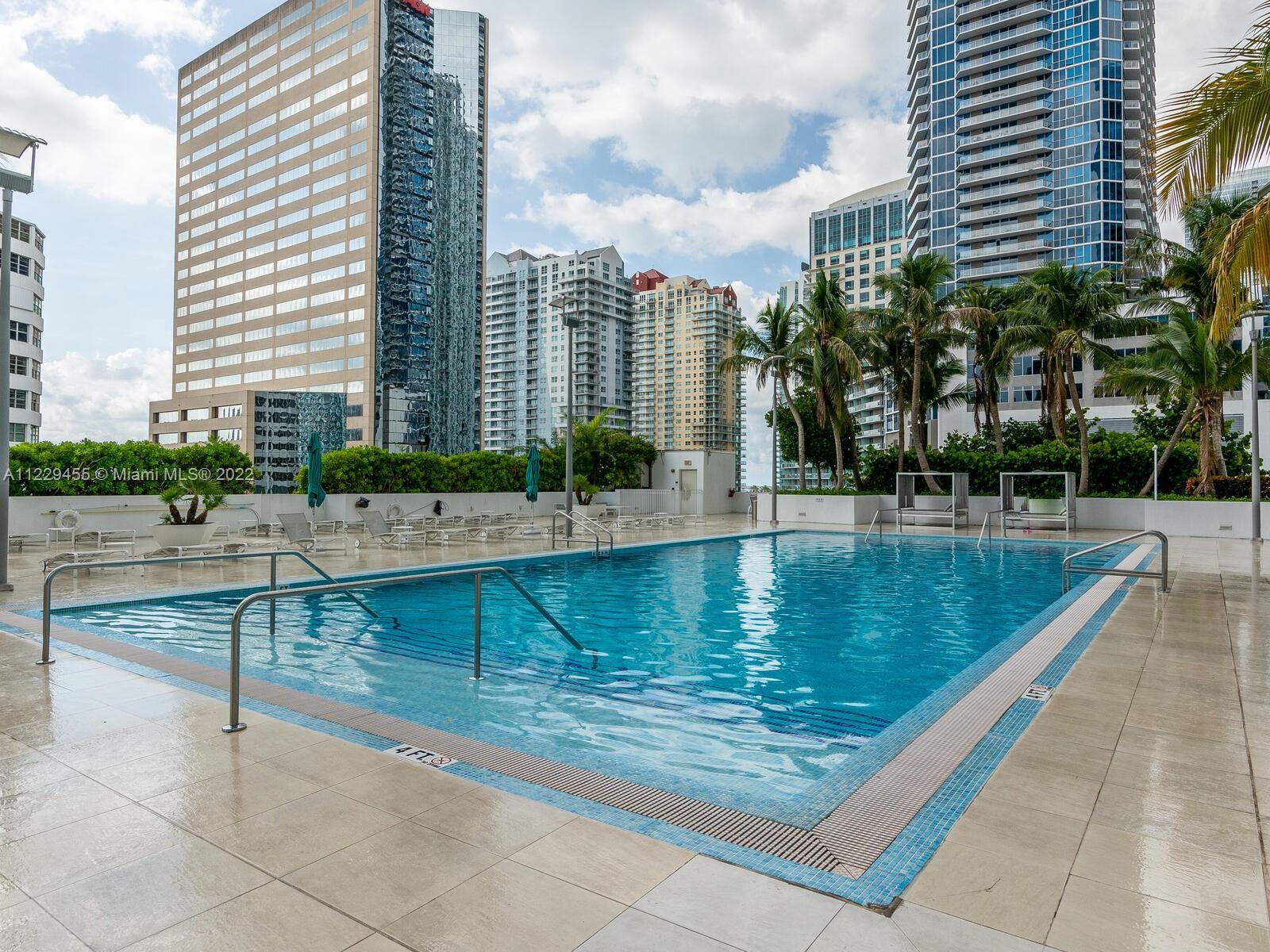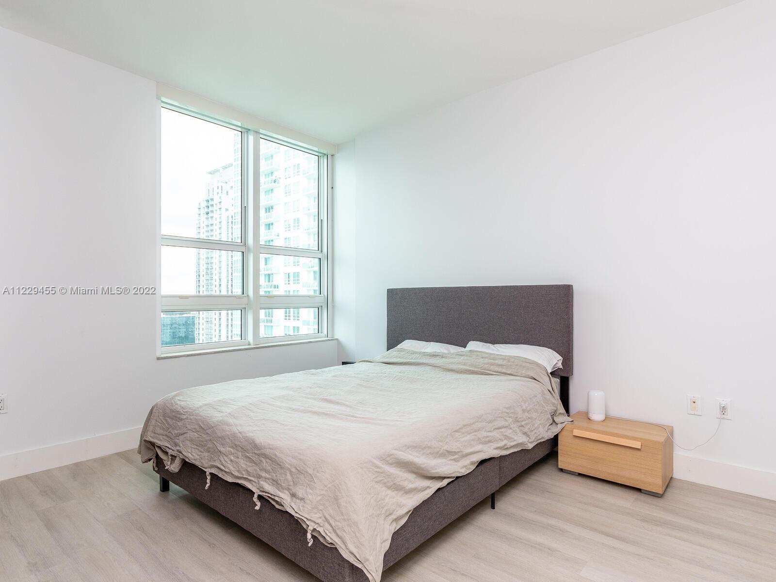 Beautiful 1/1 in sought after The Plaza, in the heart of Brickell. This bright unit has an open kitchen with SS appliances, granite counters, adjacent to living area with sliding glass door to balcony, overlooking skyline and Bay. New laminate wood like flooring just installed, built in furniture in bedroom. Inside washer and dryer. Amenities include gym, business room, top of the line pool. Unit is rented until end of September, buyer must assume lease. Please use showassist and allow 24 hrs notice for showings.