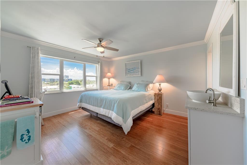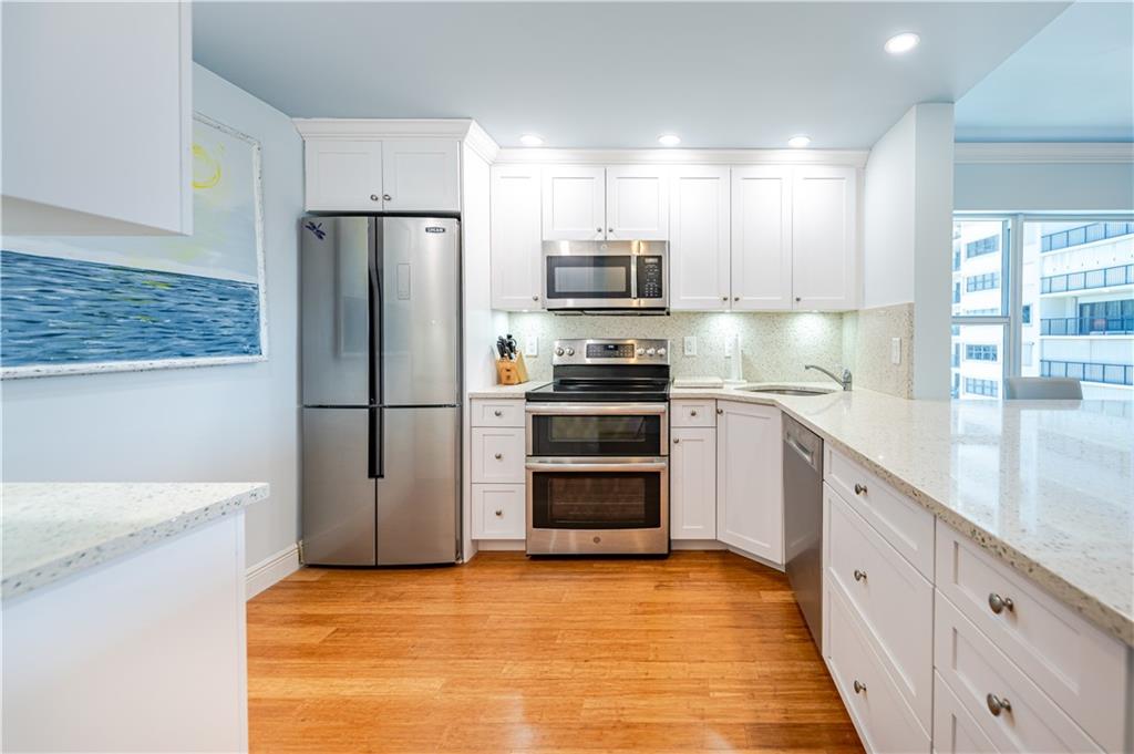 Absolutely stunning corner unit with direct ocean and intracoastal views. This beautifylly remodeled 2 bedroom, 2 bath unit has been impecably renovated and has in unit washer and dryer. (Bosch) A wrap around balcony with breath taking views of the beach, the intracoastal and sunsets to take your breath away. Unit features bamboo flooring, custom cabinets and closets, new ac (2022), quartz counter tops, complete renovation (2019), storage closet, monthly condo fee ($843.00) includes hot wire internet and service for 2 tv's. Double storm protection as unit has all impact windows and doors, and balcony shutters. This quaint 50 unit building is well managed and this unit comes with one assigned surface parking space and plenty of guest parking. Plenty of shopping & restaurants nearby in LBTS