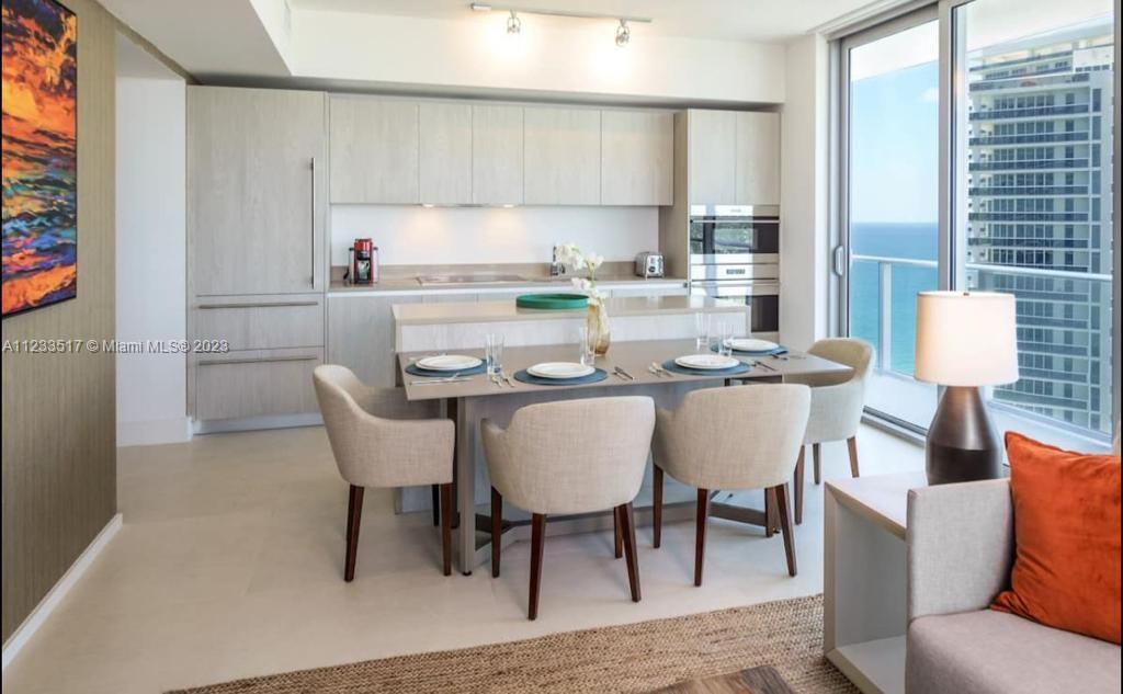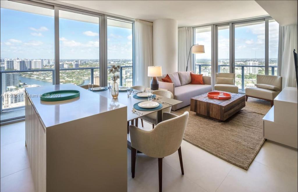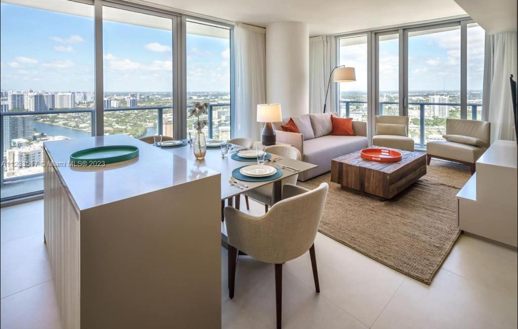 Spectacular corner Unit with oversize Balcony Facing Ocean and Intracoastal views. Modern Furnished, kind size Bed in Master Bedroom, 2 Queen Beds in 2nd Bedroom, Sofa bed in living Room, Beach service, pool, restaurants, bars, cafe and more.